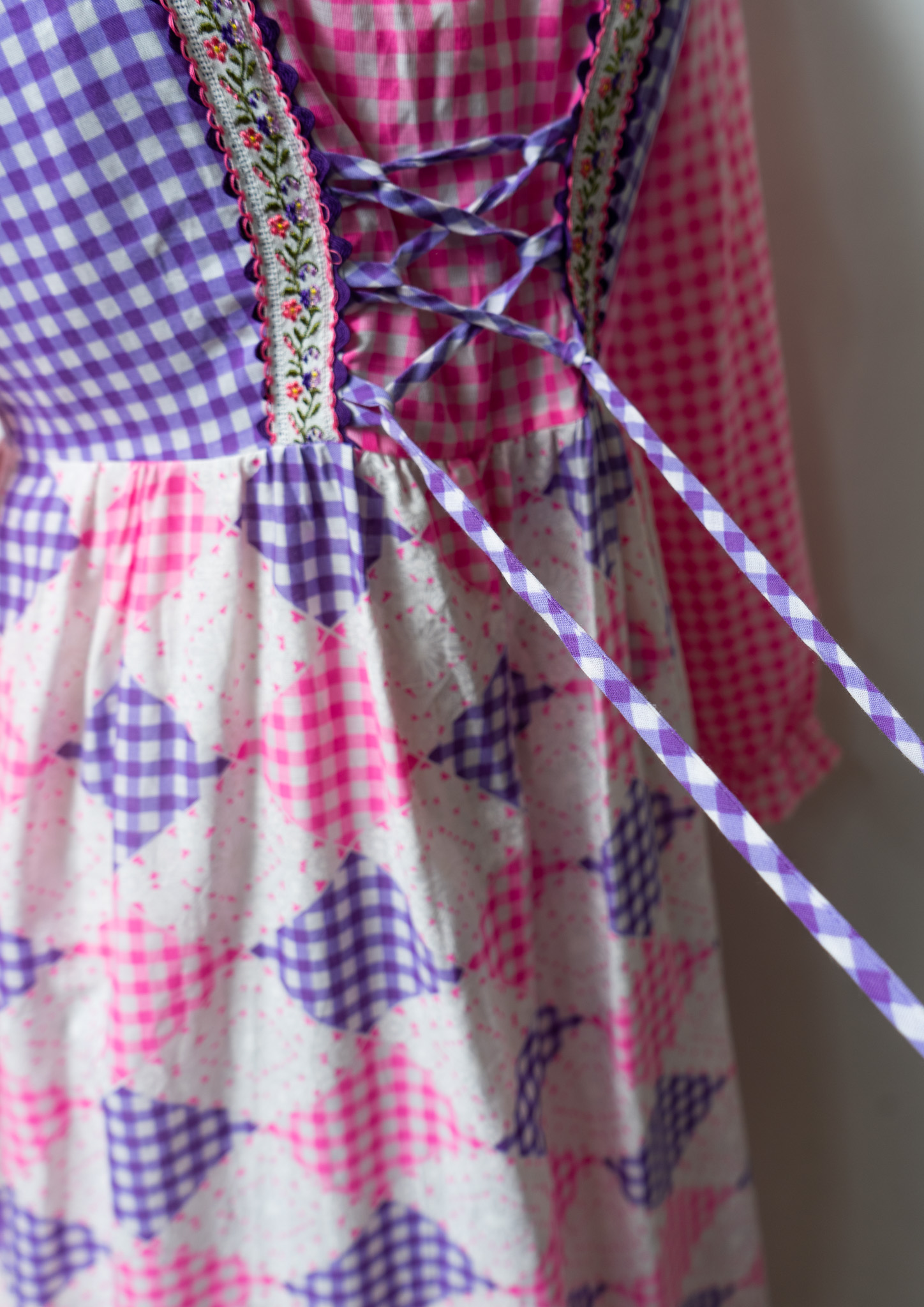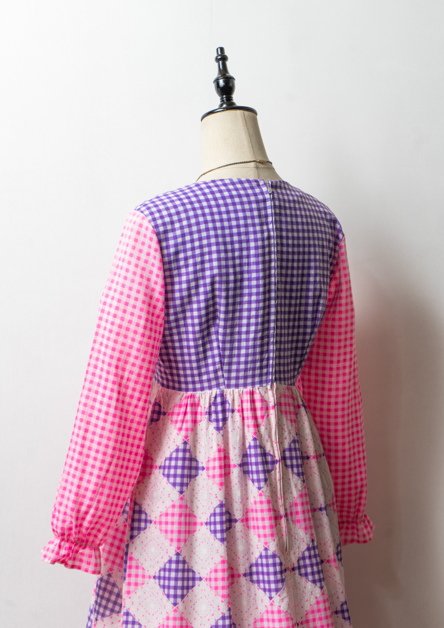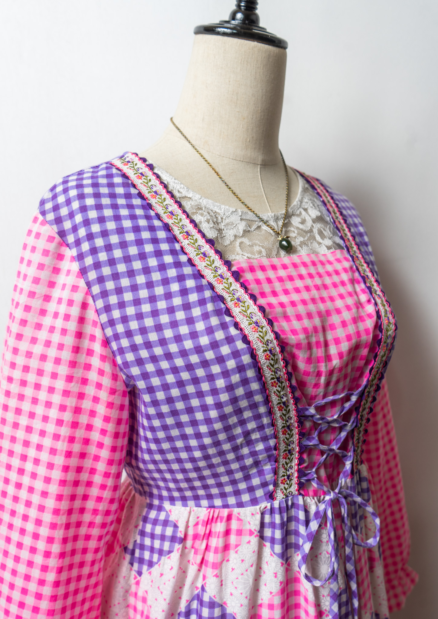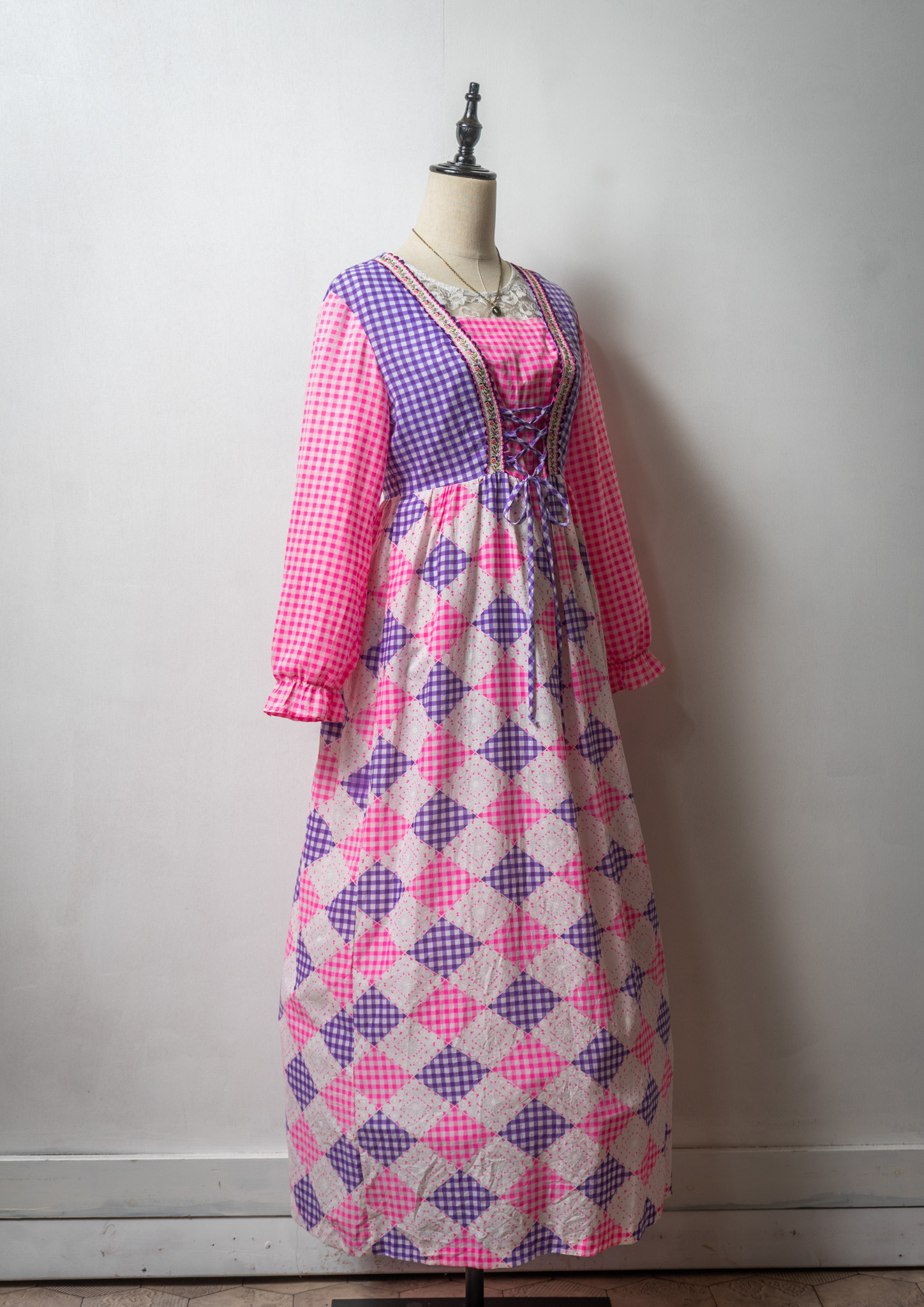 60~70's Lace up Design Pink × Purple Gingham Check Pattern Dress