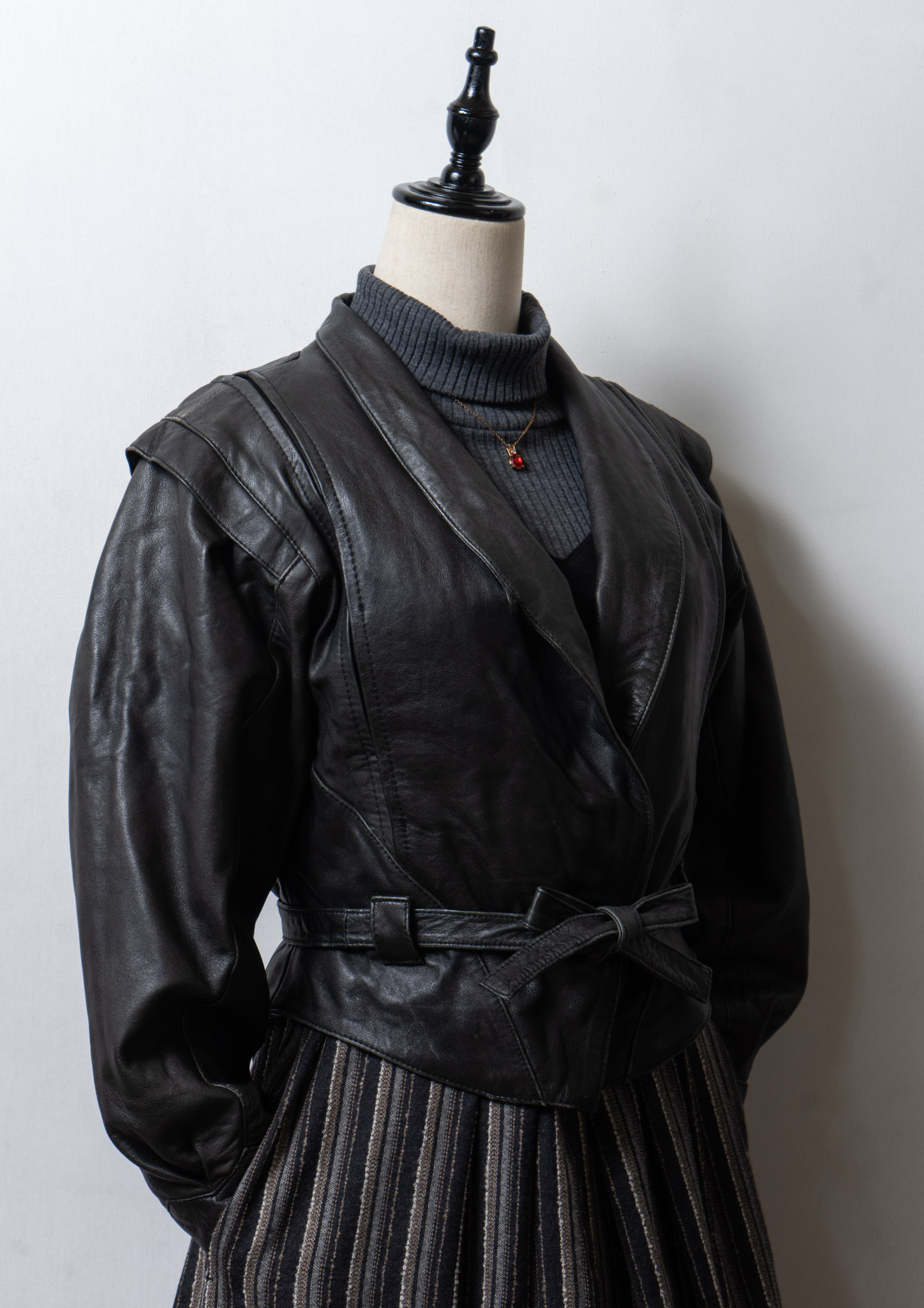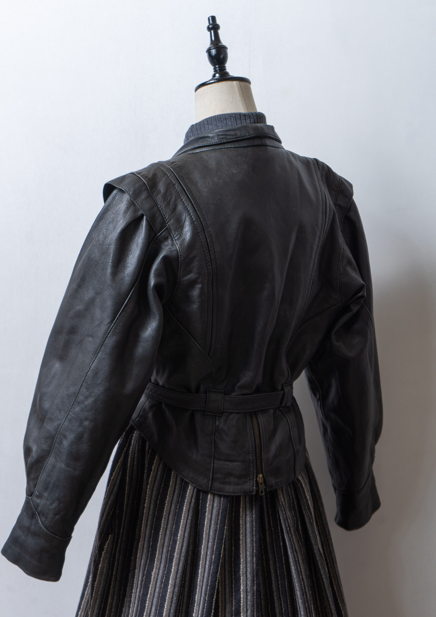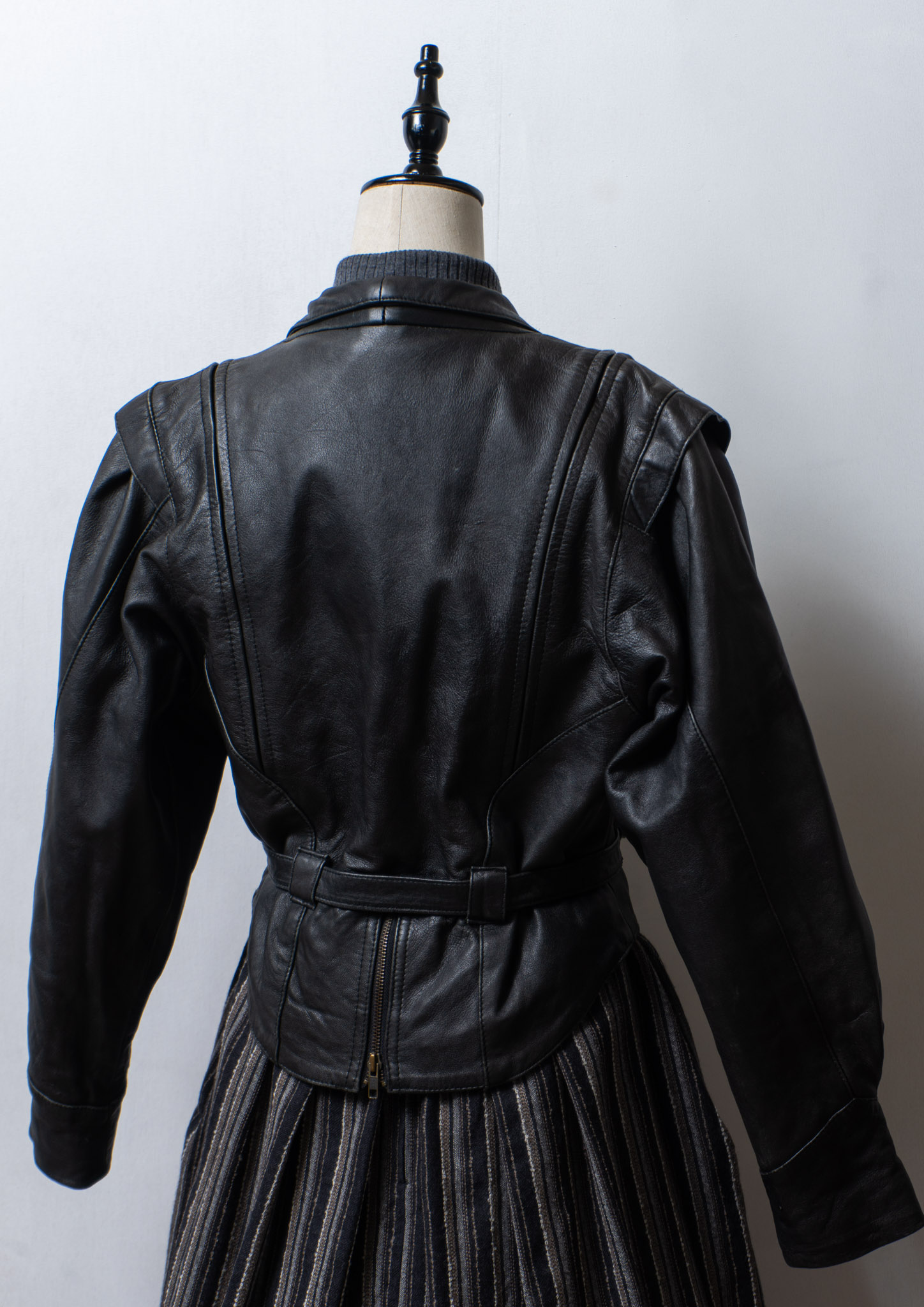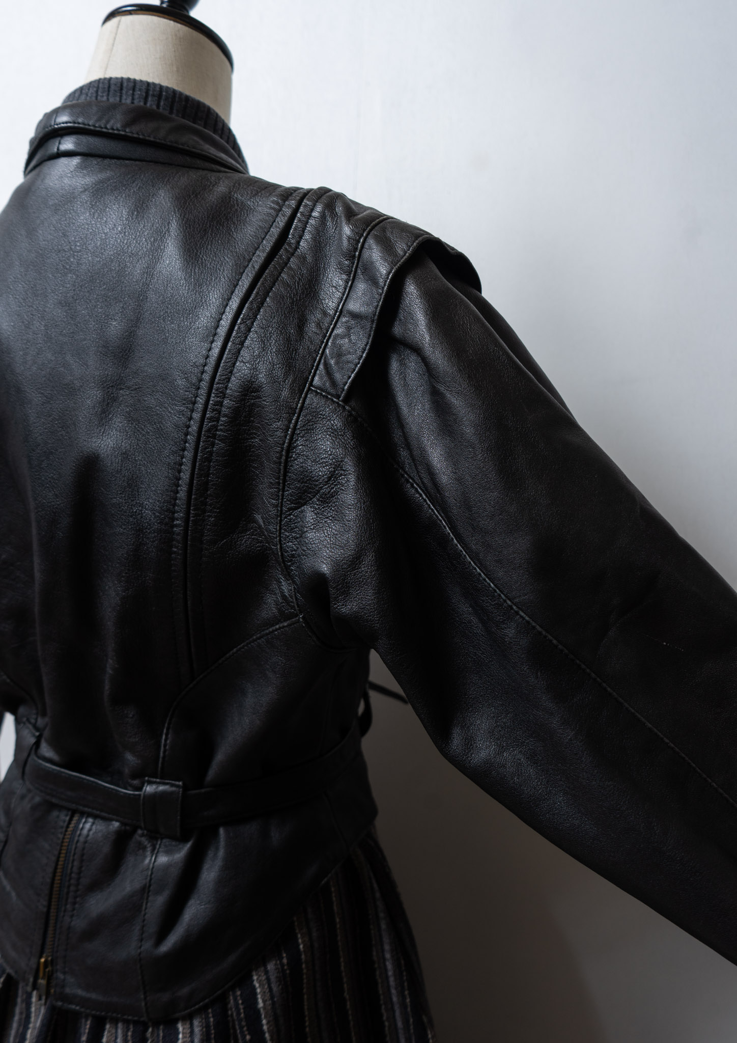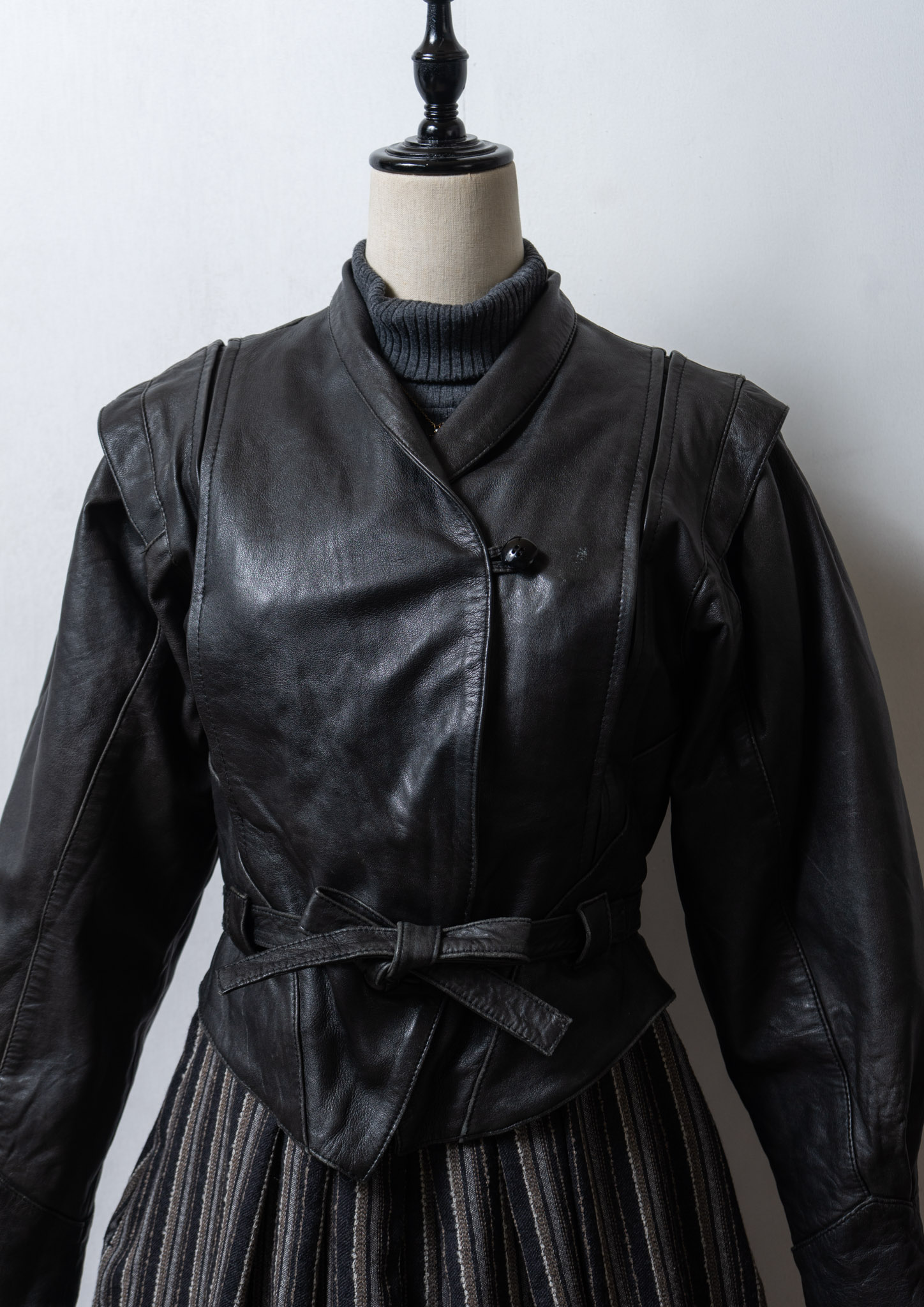 80's Waist Ribbon Design Black Leather Jacket