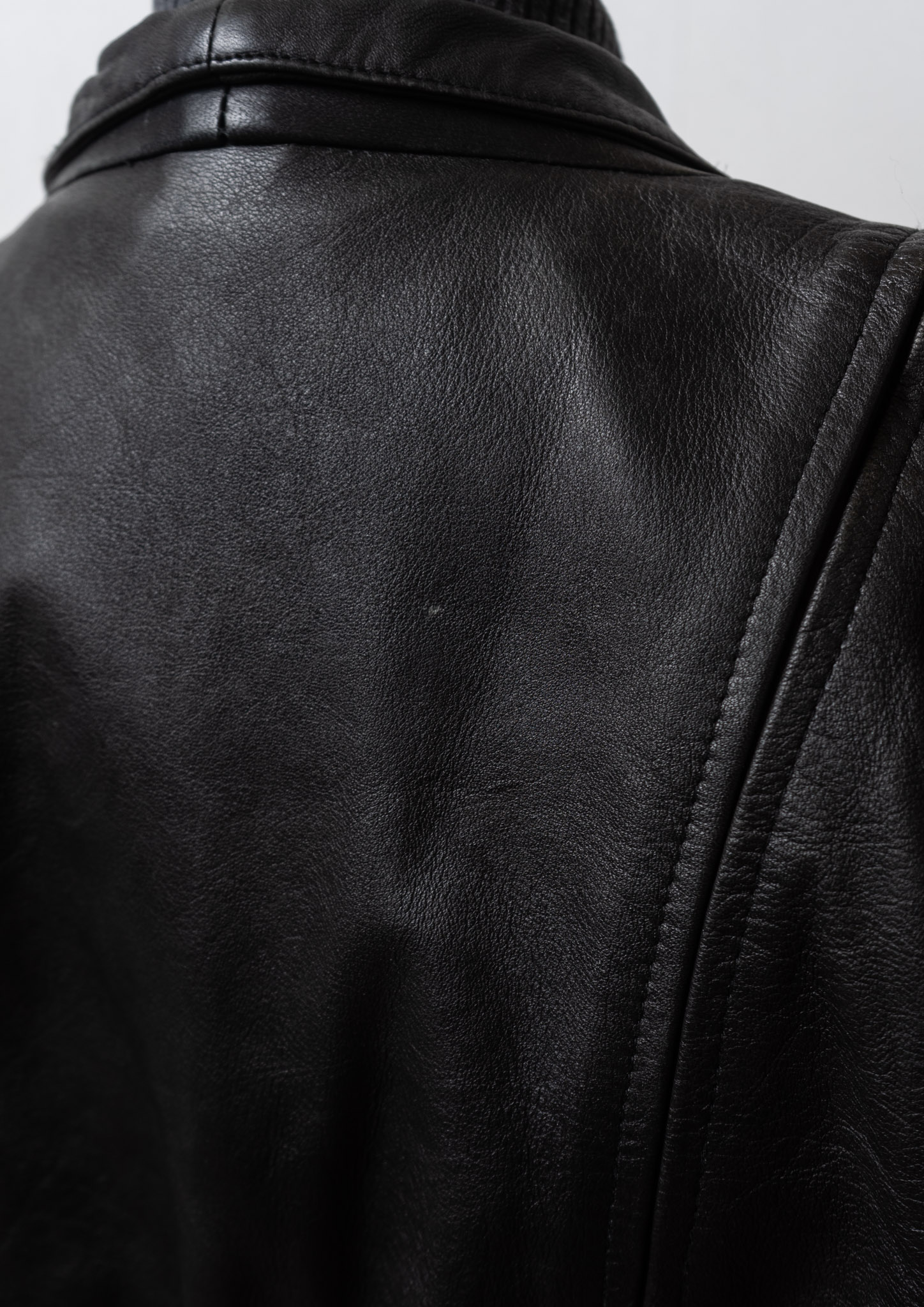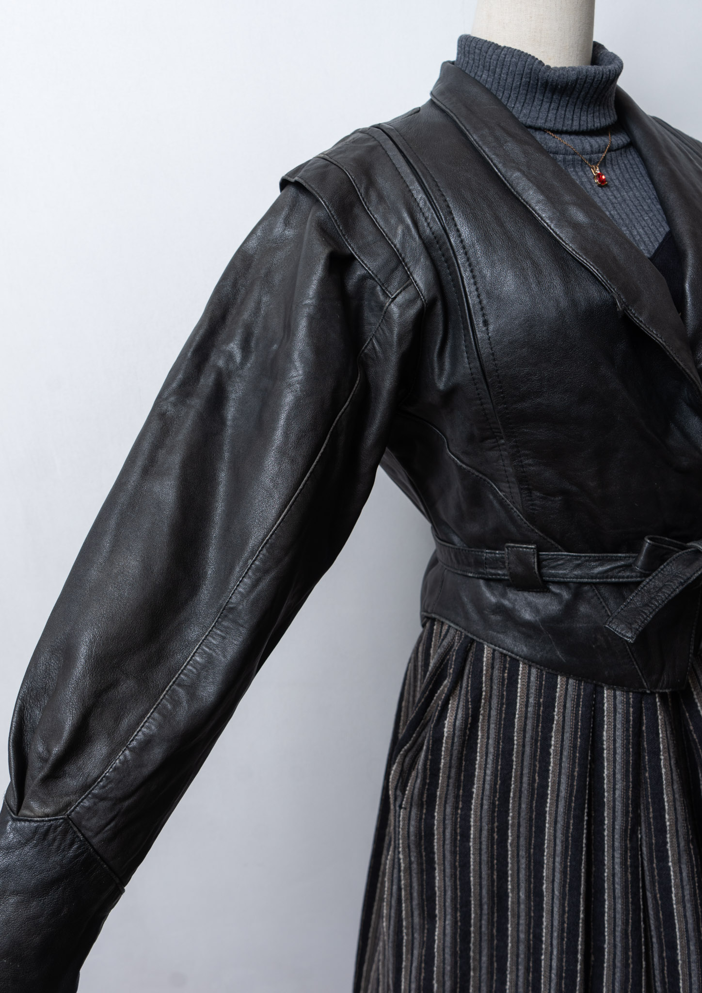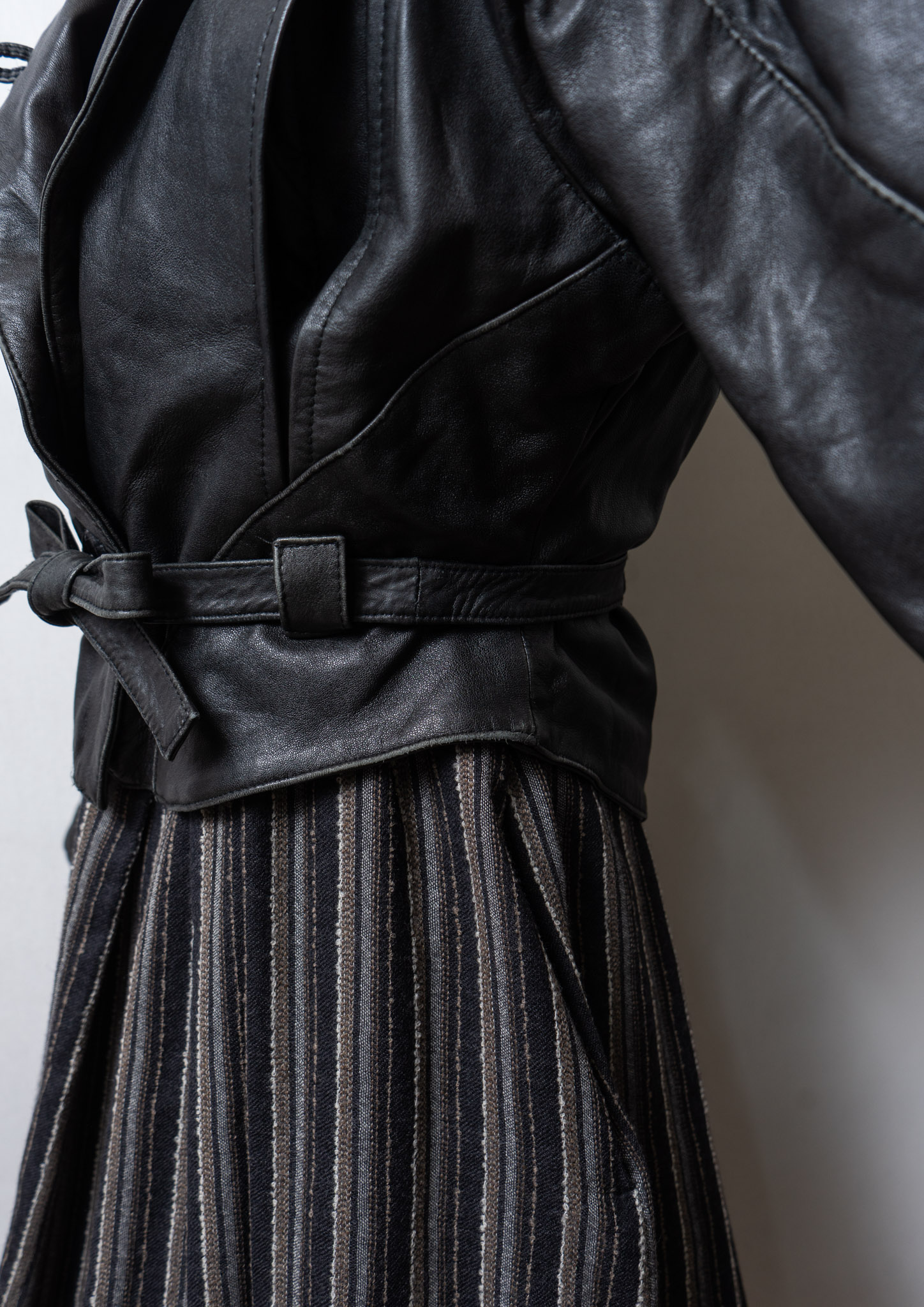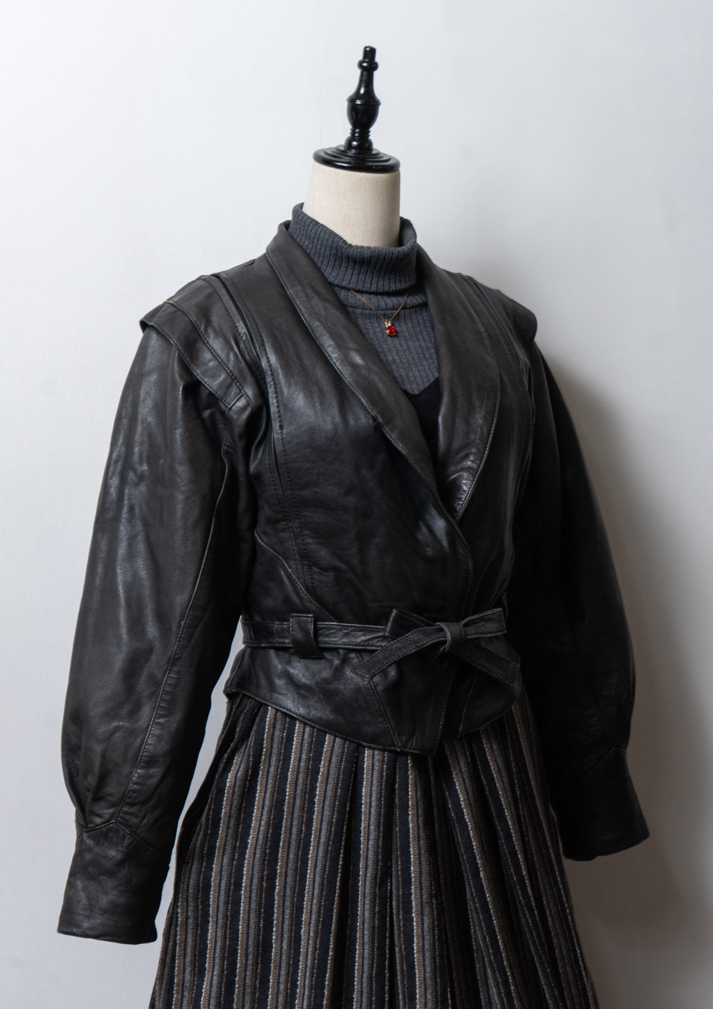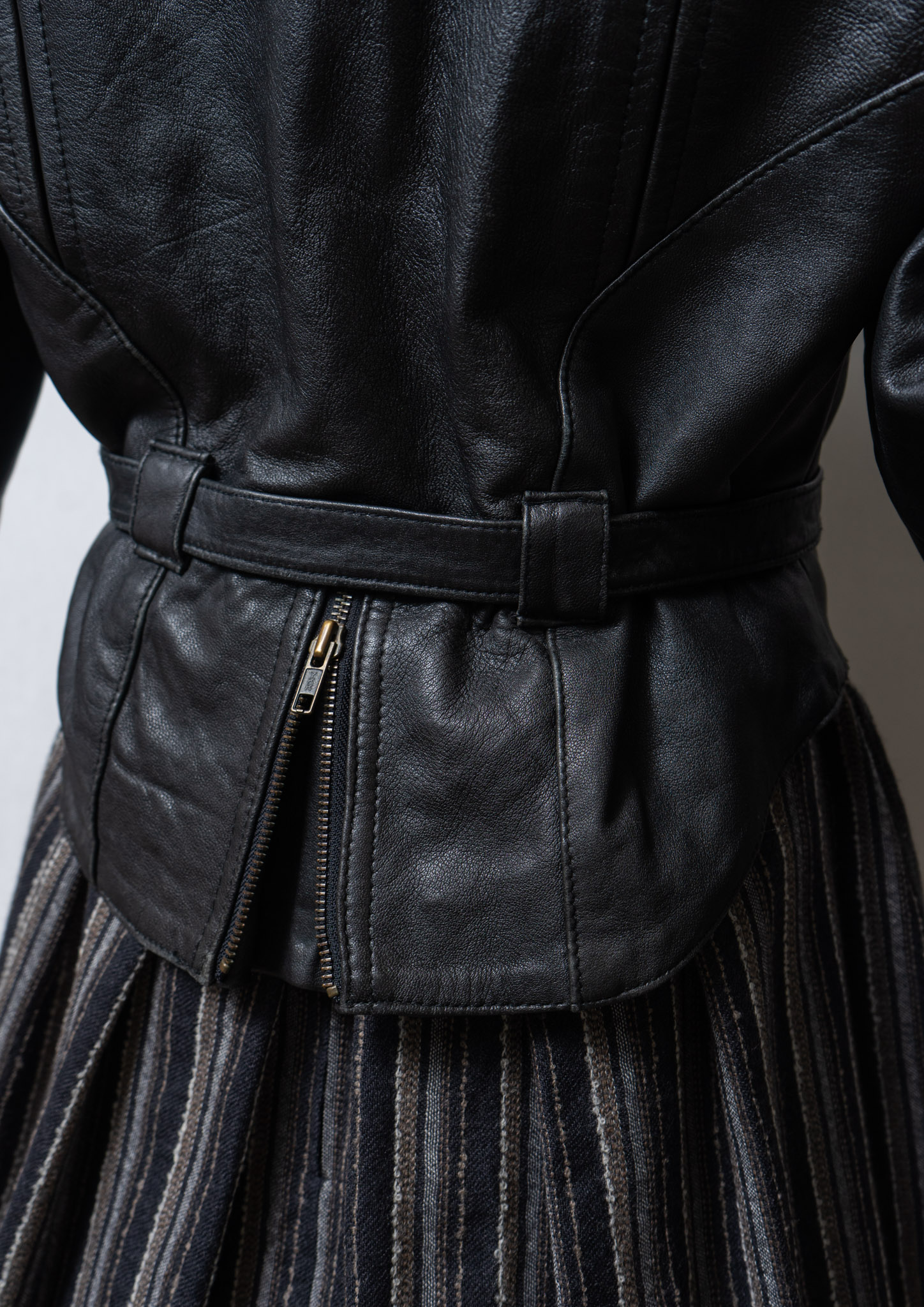 80's Waist Ribbon Design Black Leather Jacket