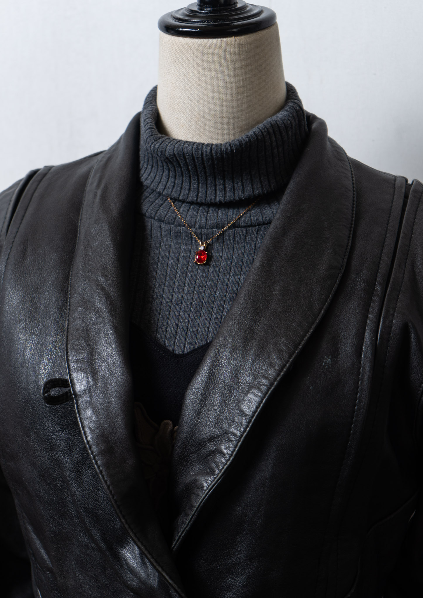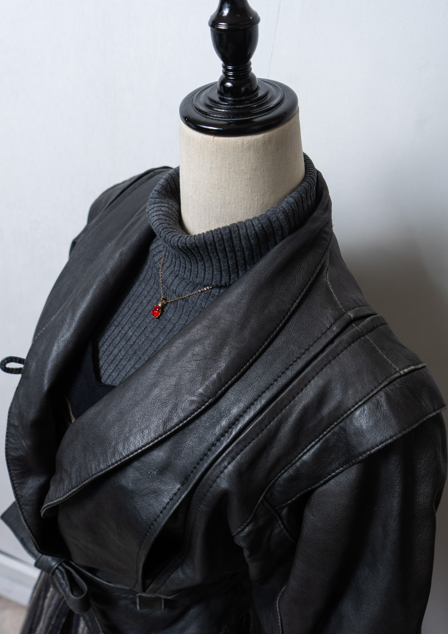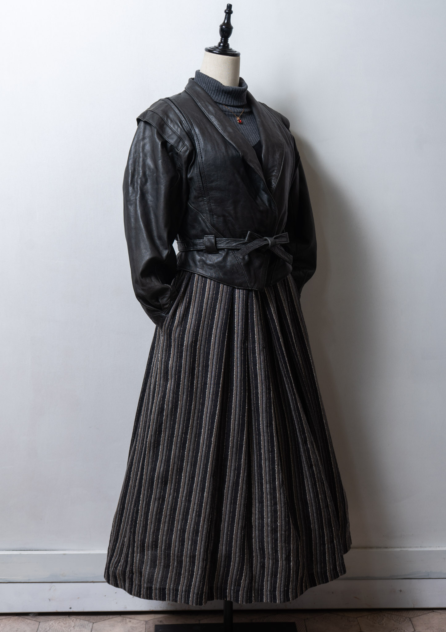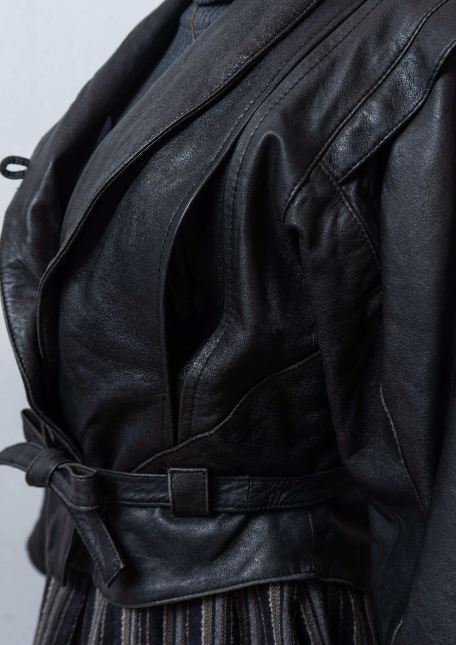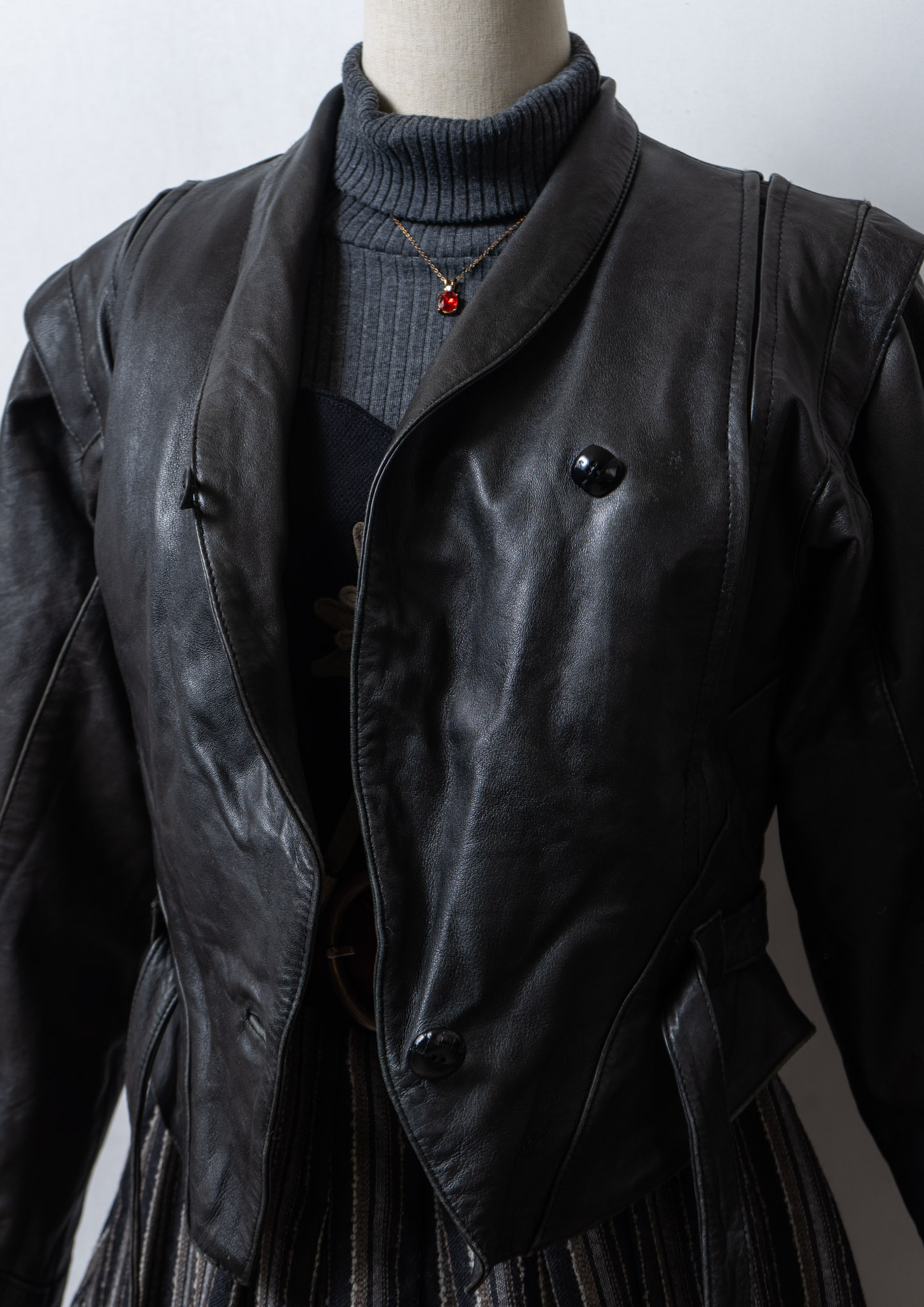 80's Waist Ribbon Design Black Leather Jacket
