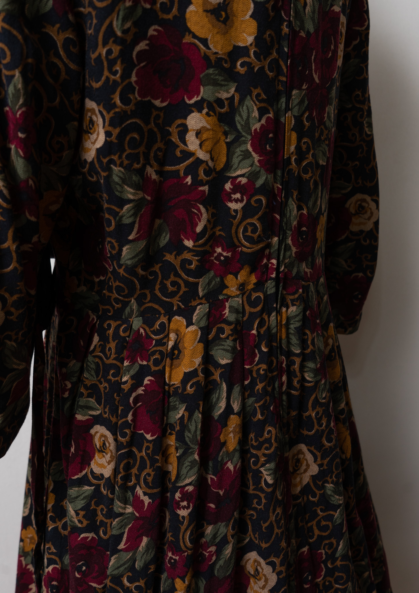 80's Lace Collar Geometric Flower Pattern Navy Dress