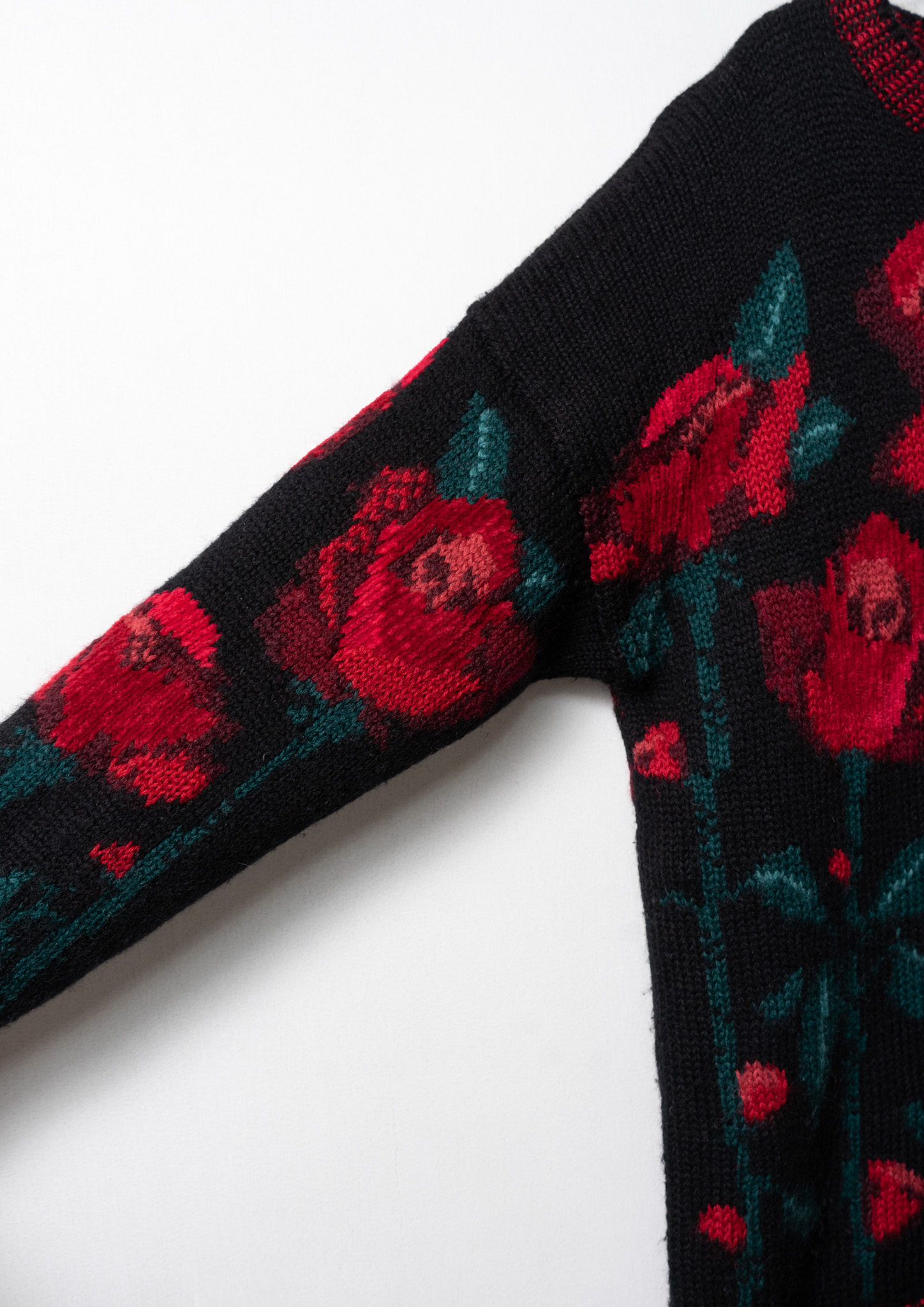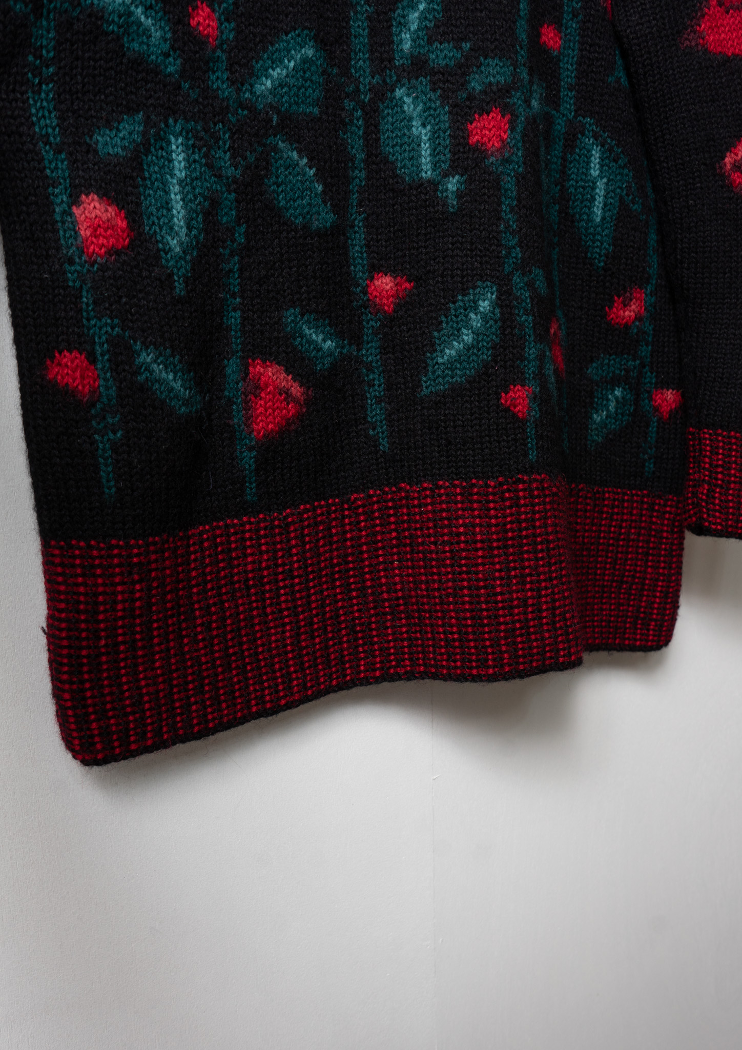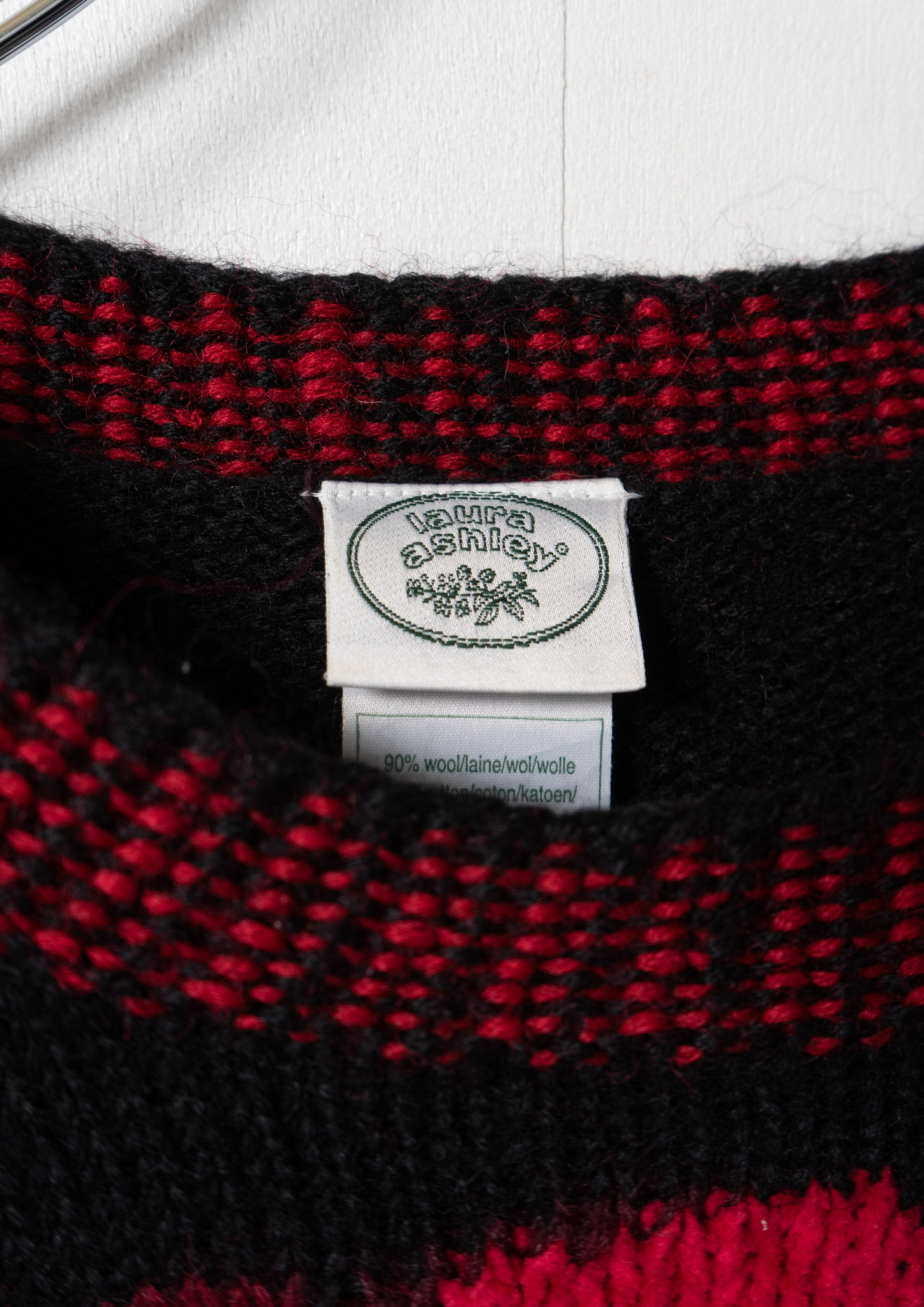 80~90's Laura ashley Red Rose Pattern Black Knit Sweater