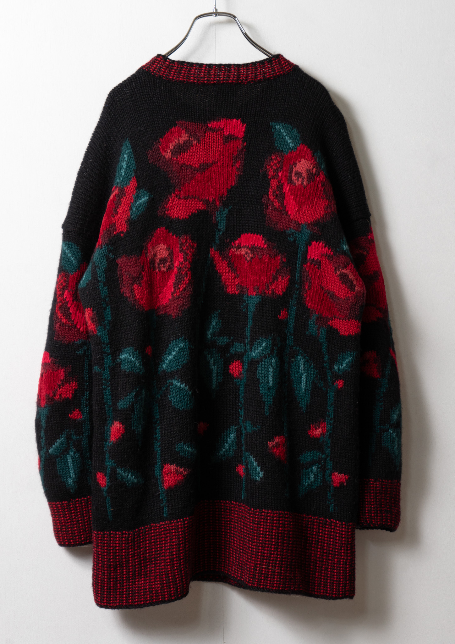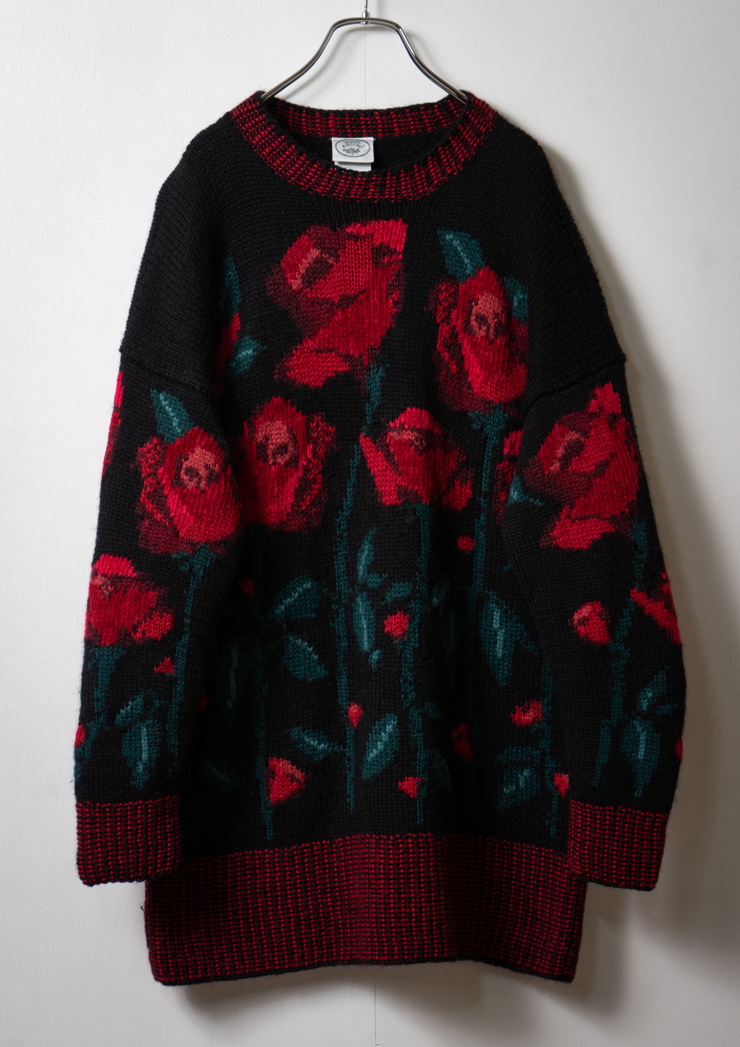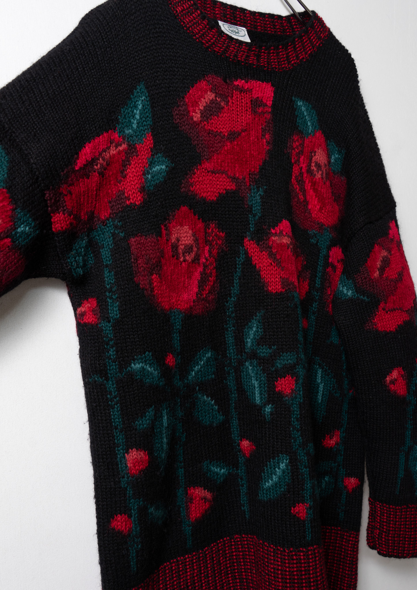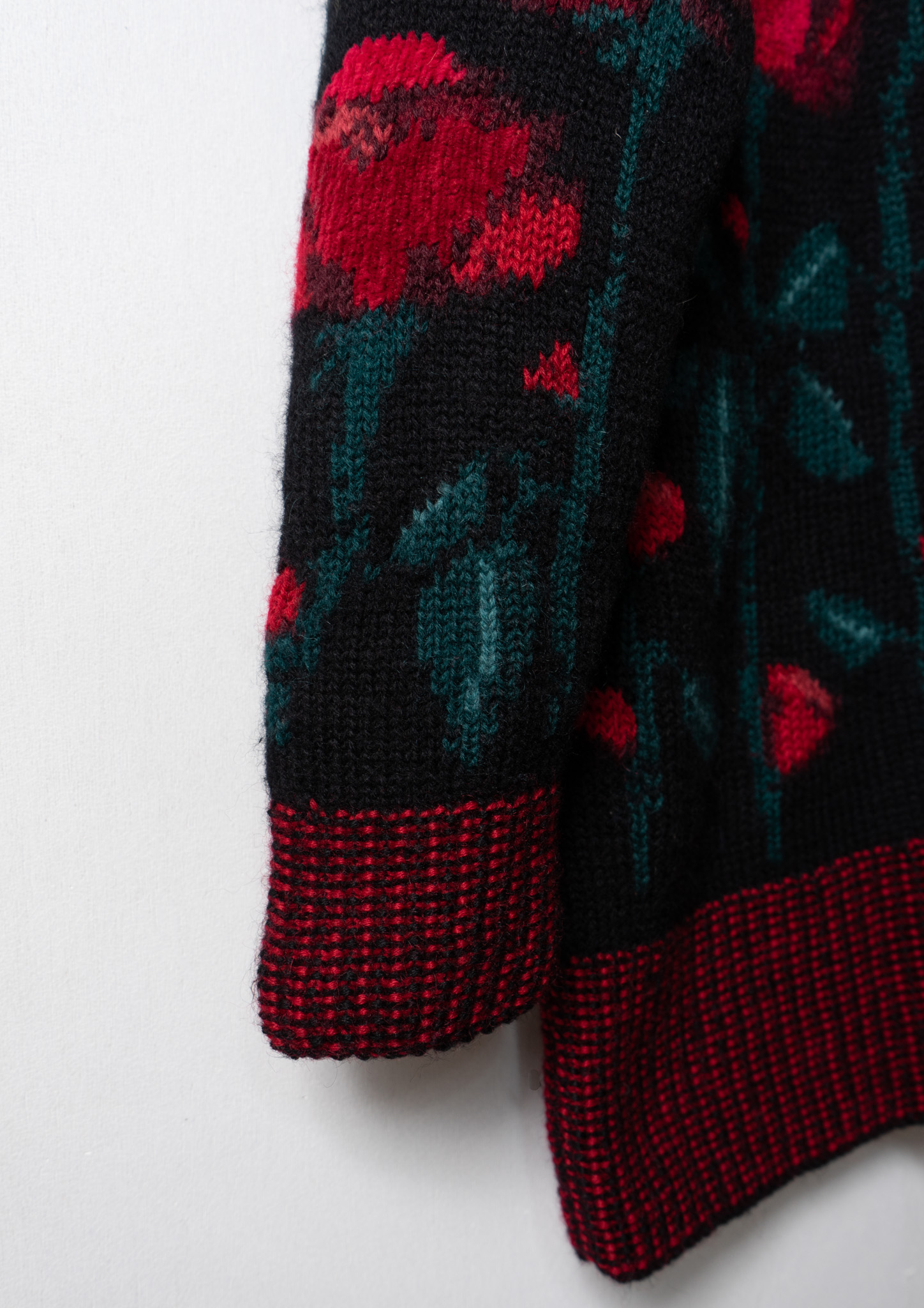 80~90's Laura ashley Red Rose Pattern Black Knit Sweater