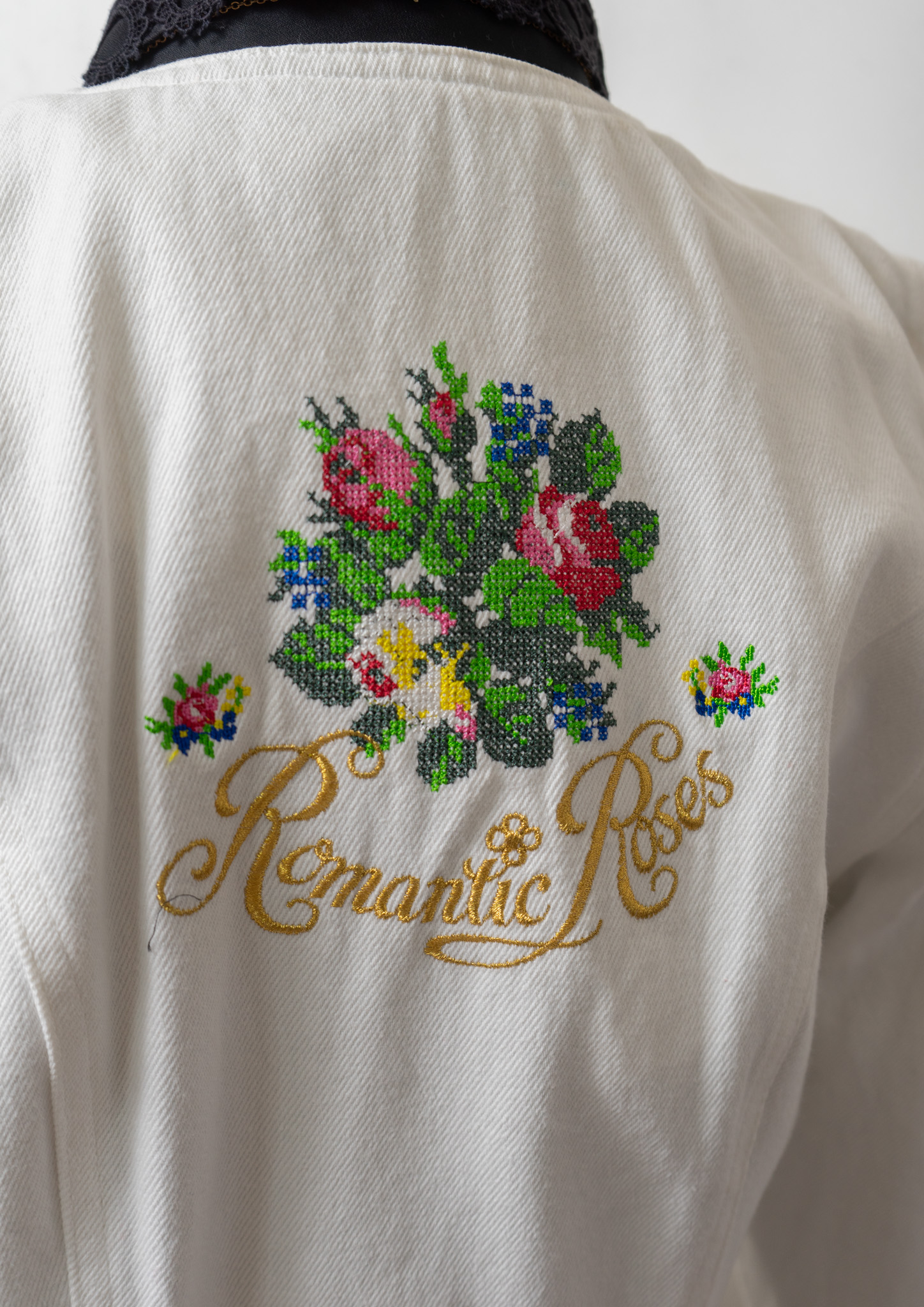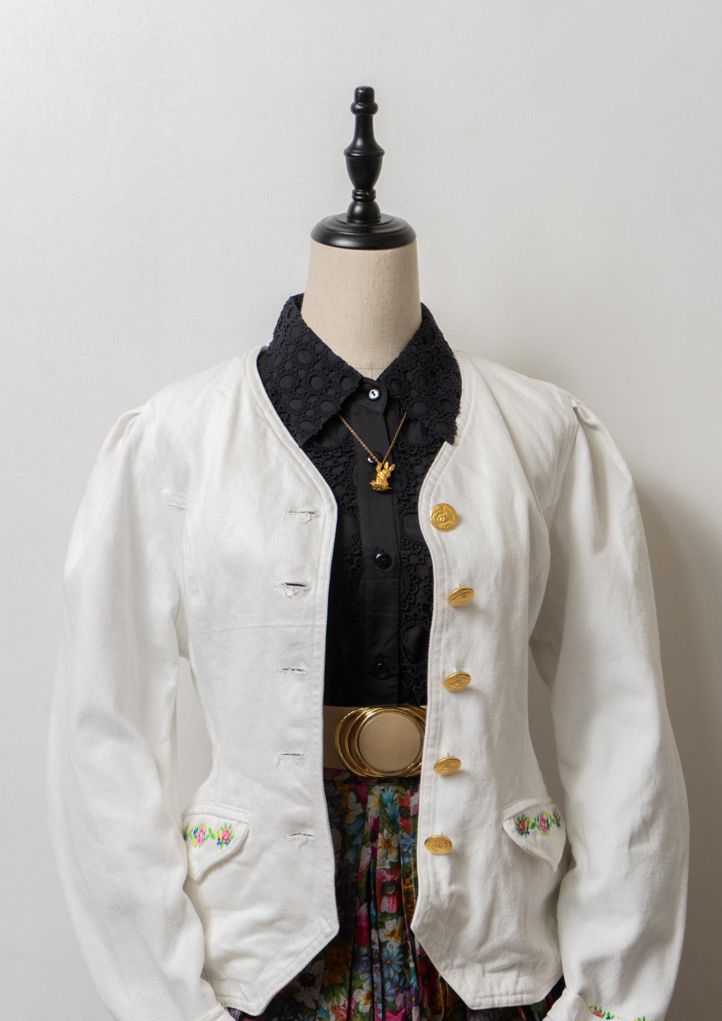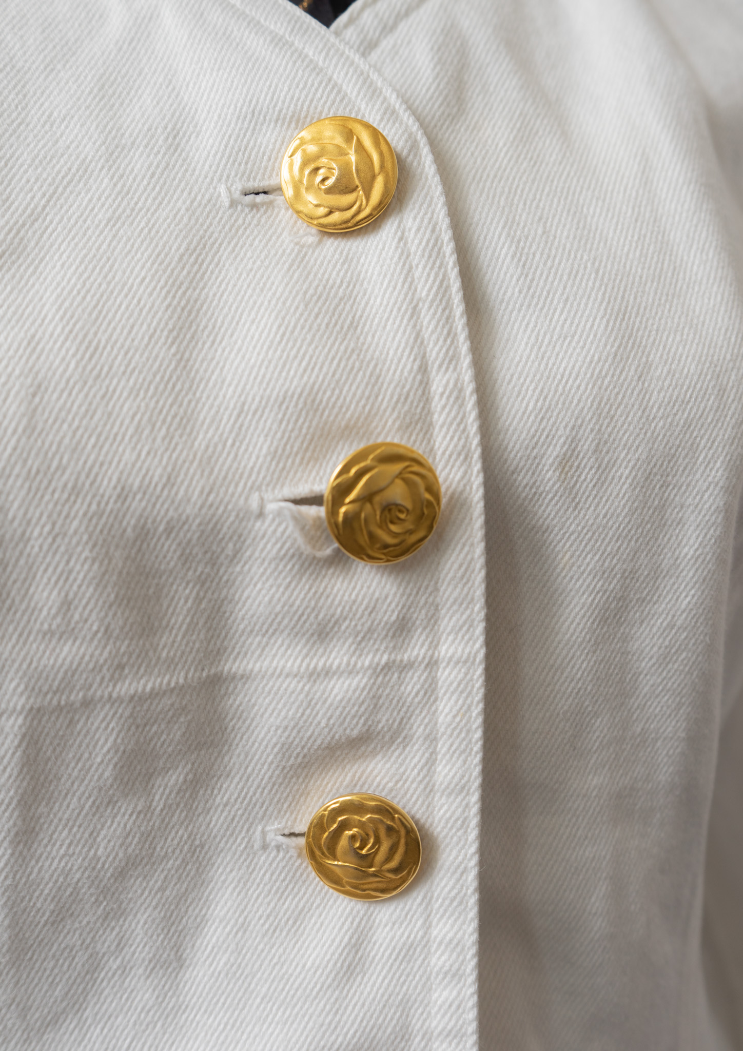 90's Swizerland Gold Rose Button Cross Stitch Like Rose Pattern White Jacket
