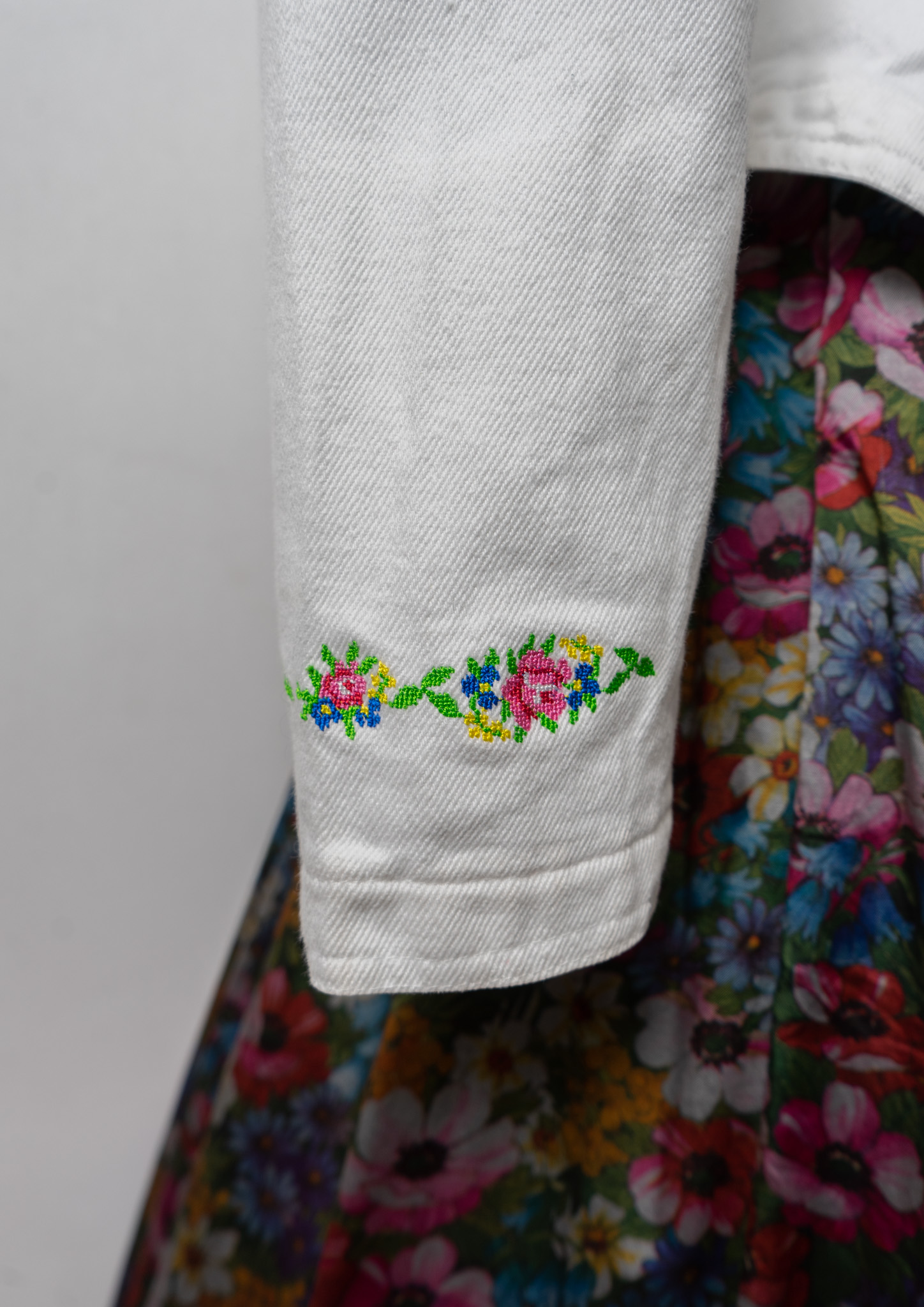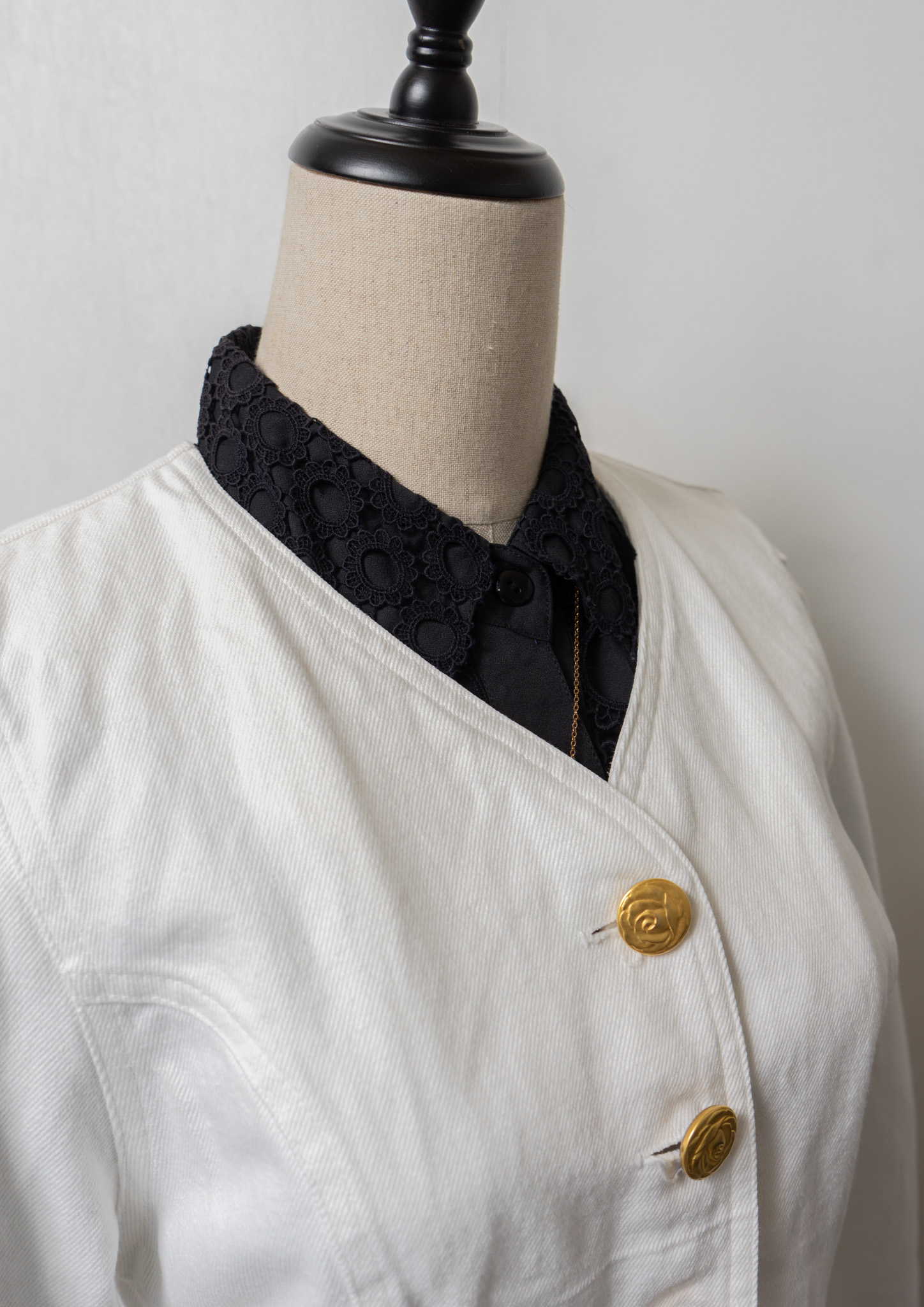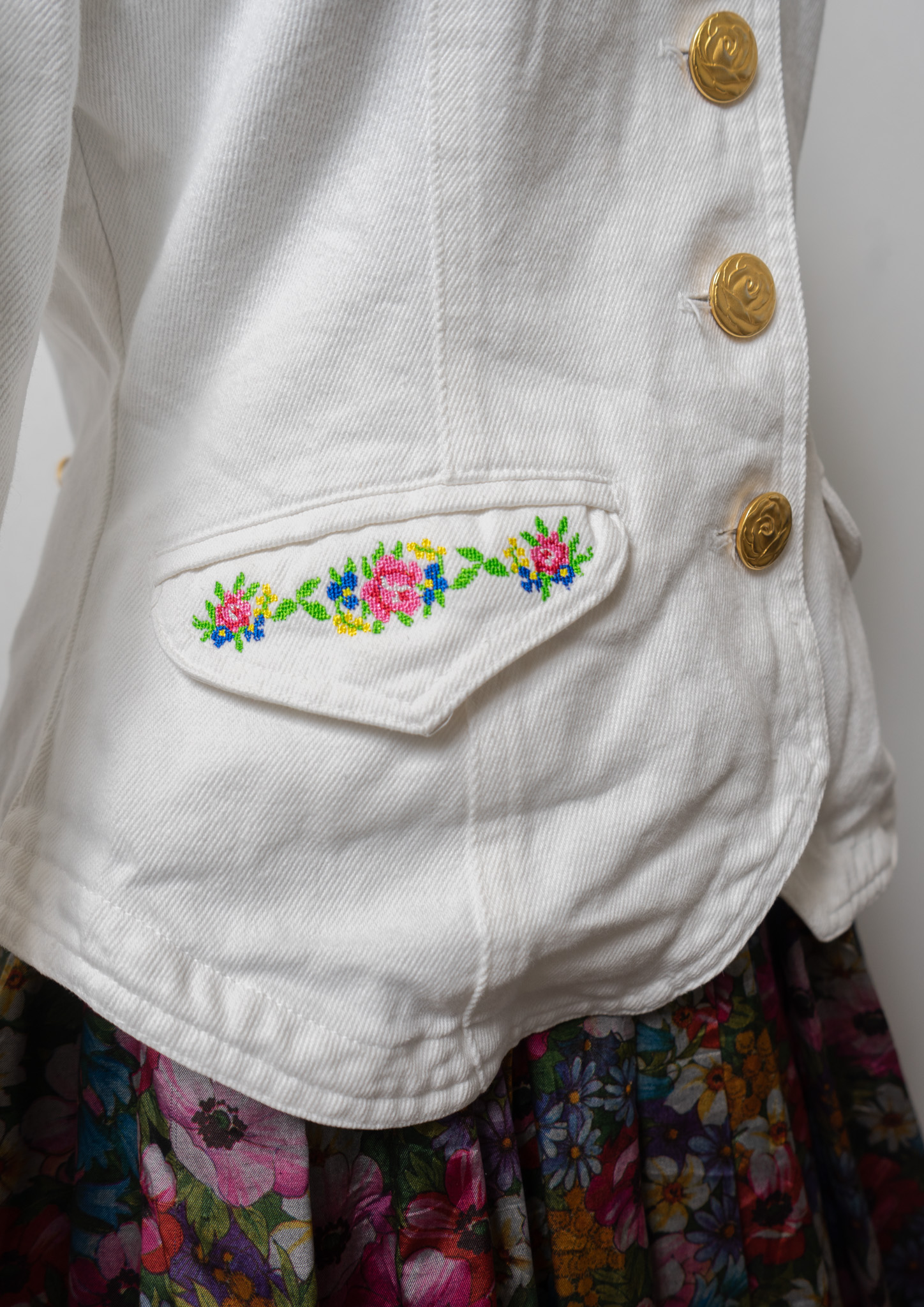 90's Swizerland Gold Rose Button Cross Stitch Like Rose Pattern White Jacket