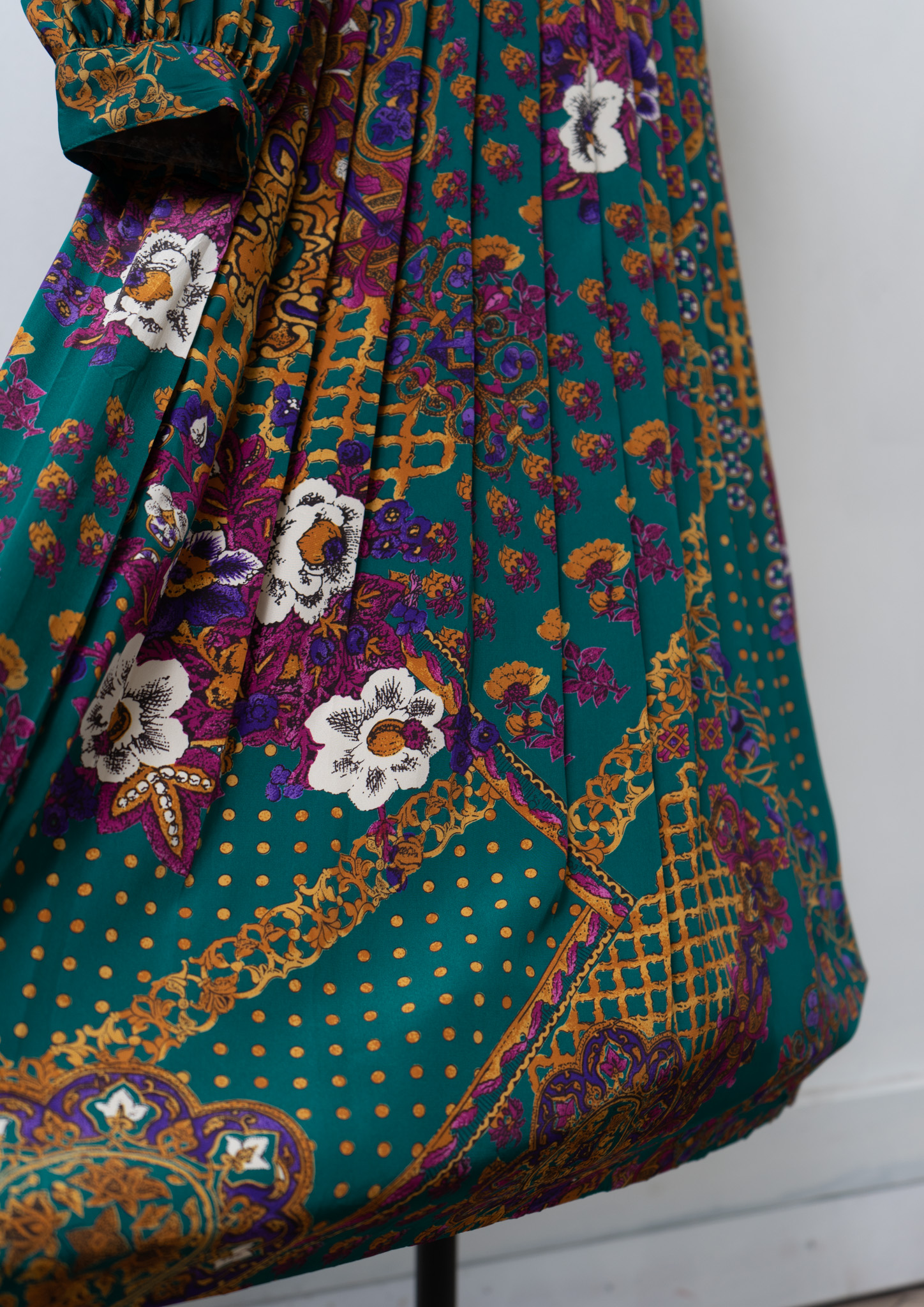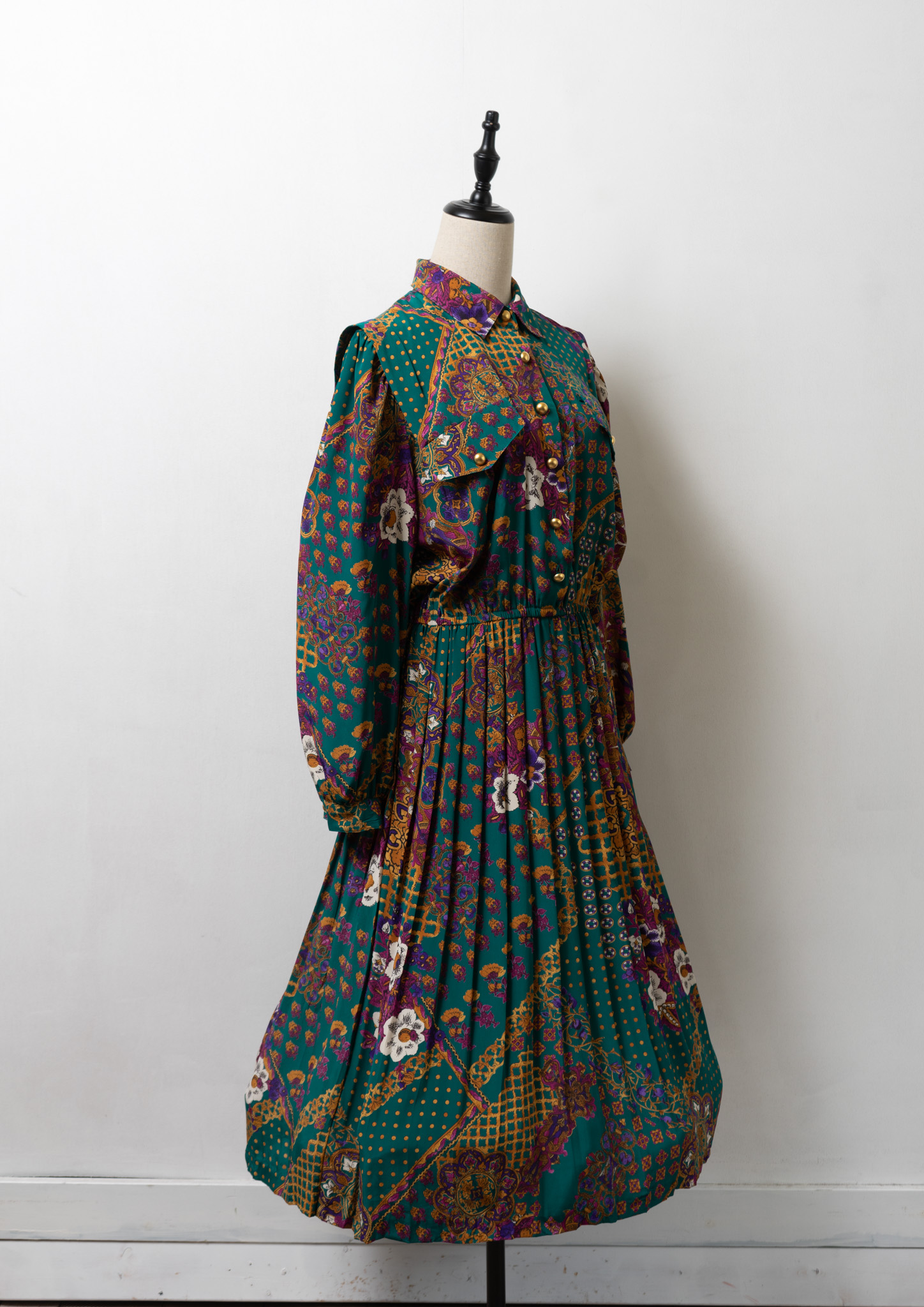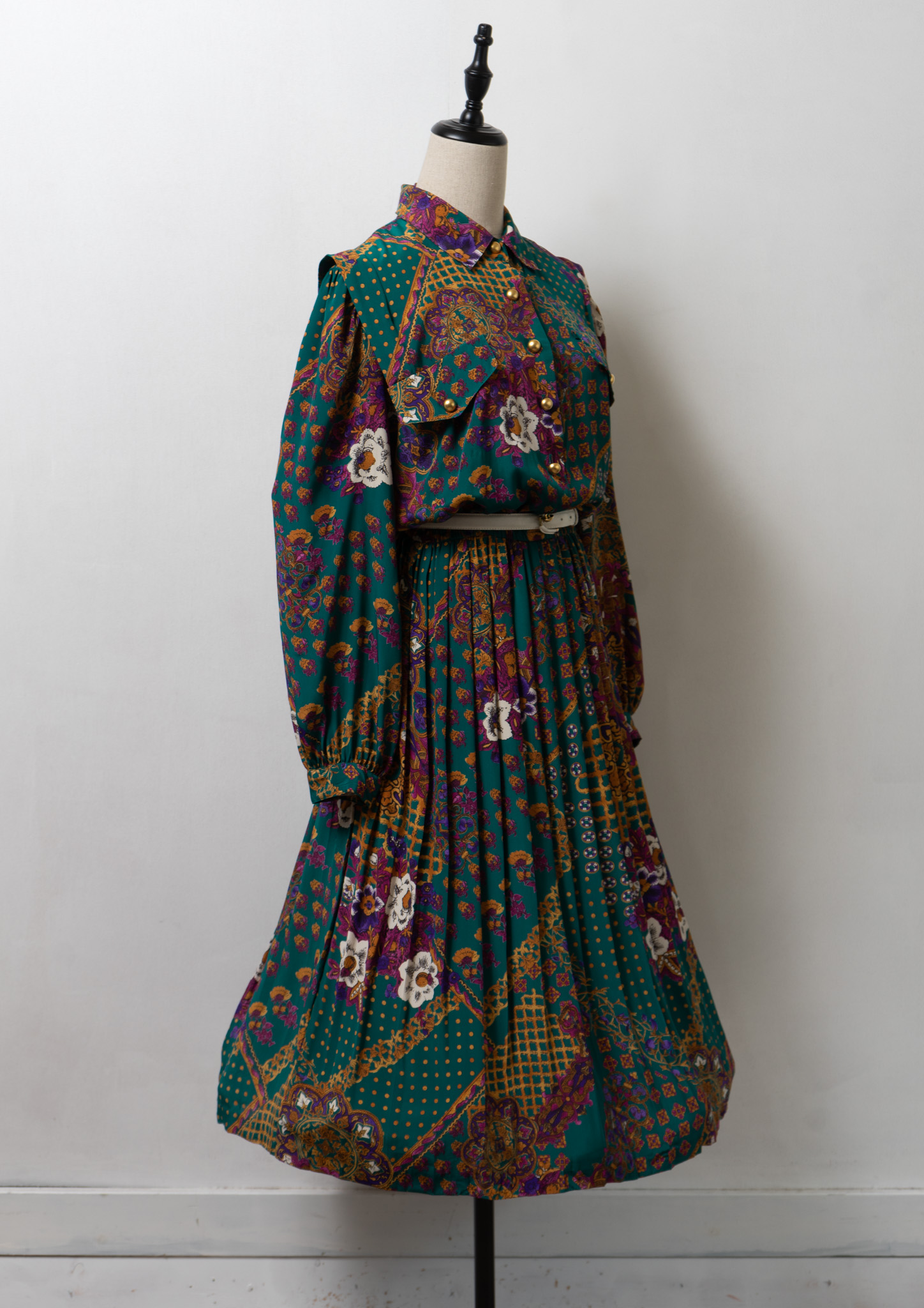 80~90's LESLIE FAY Mixd Scarf Pattern Pleats Design Green Dress