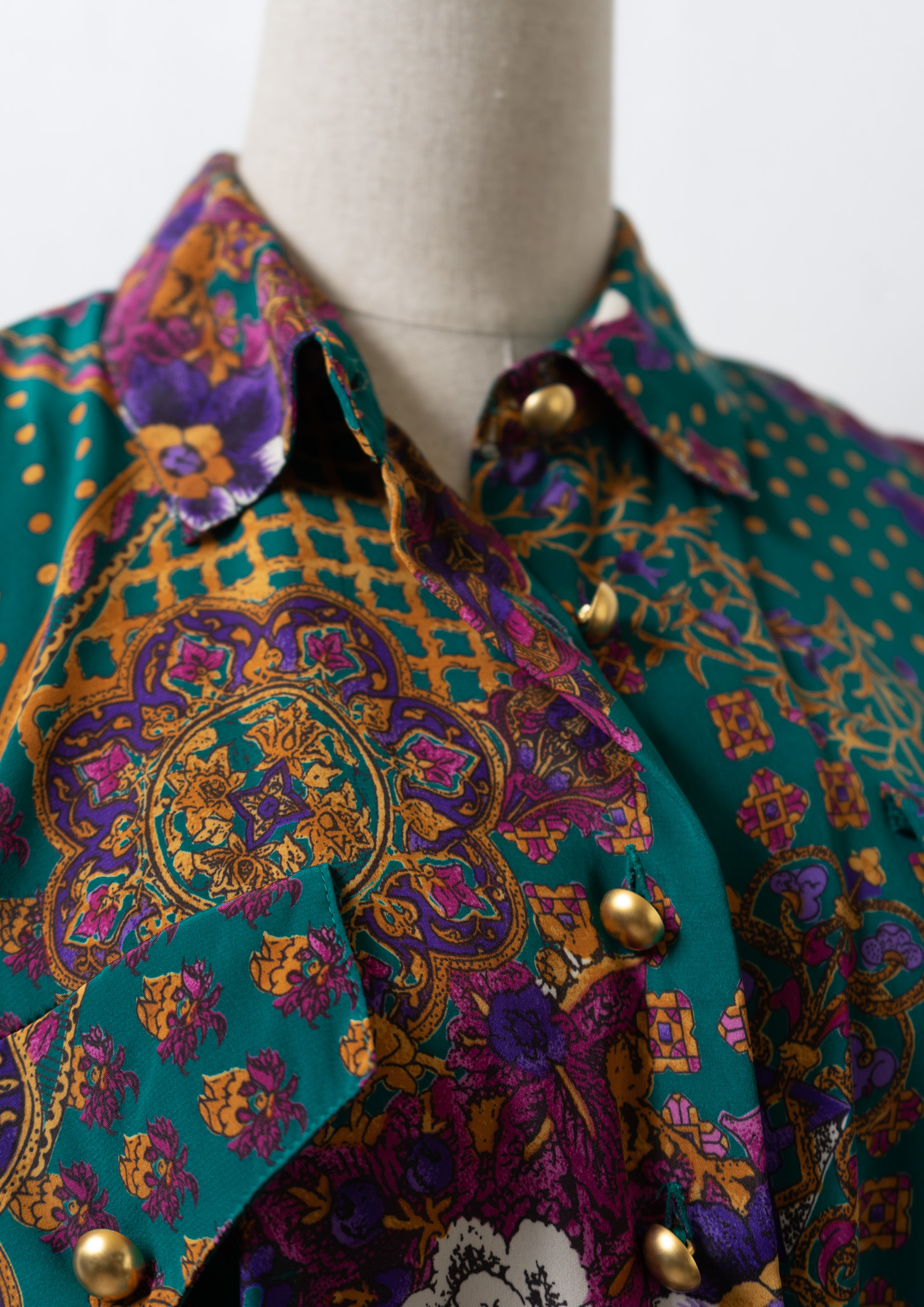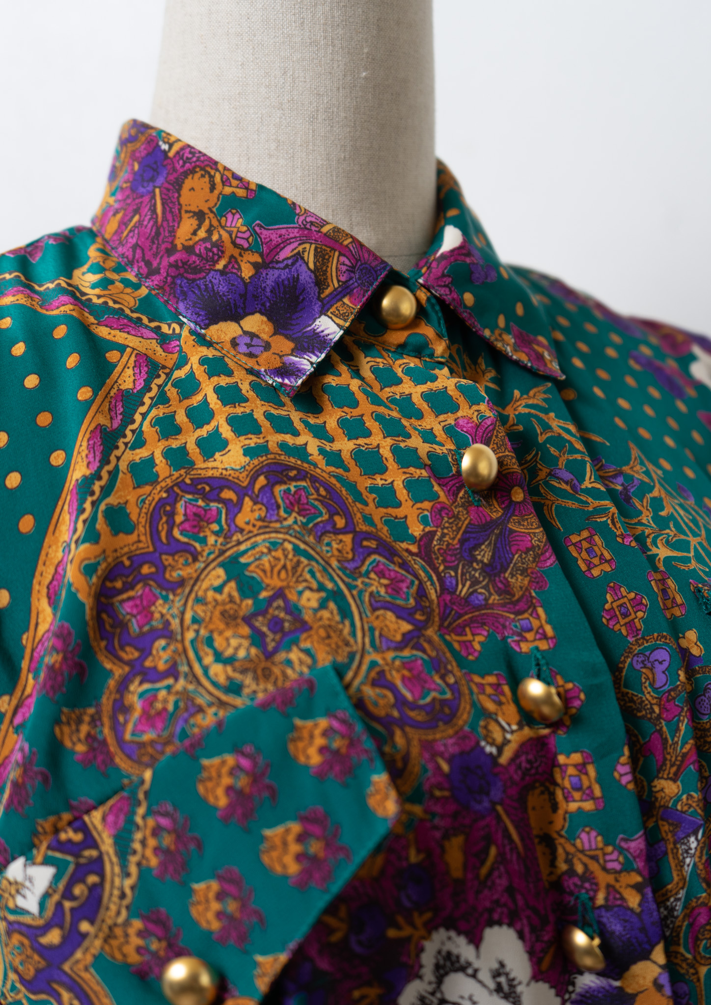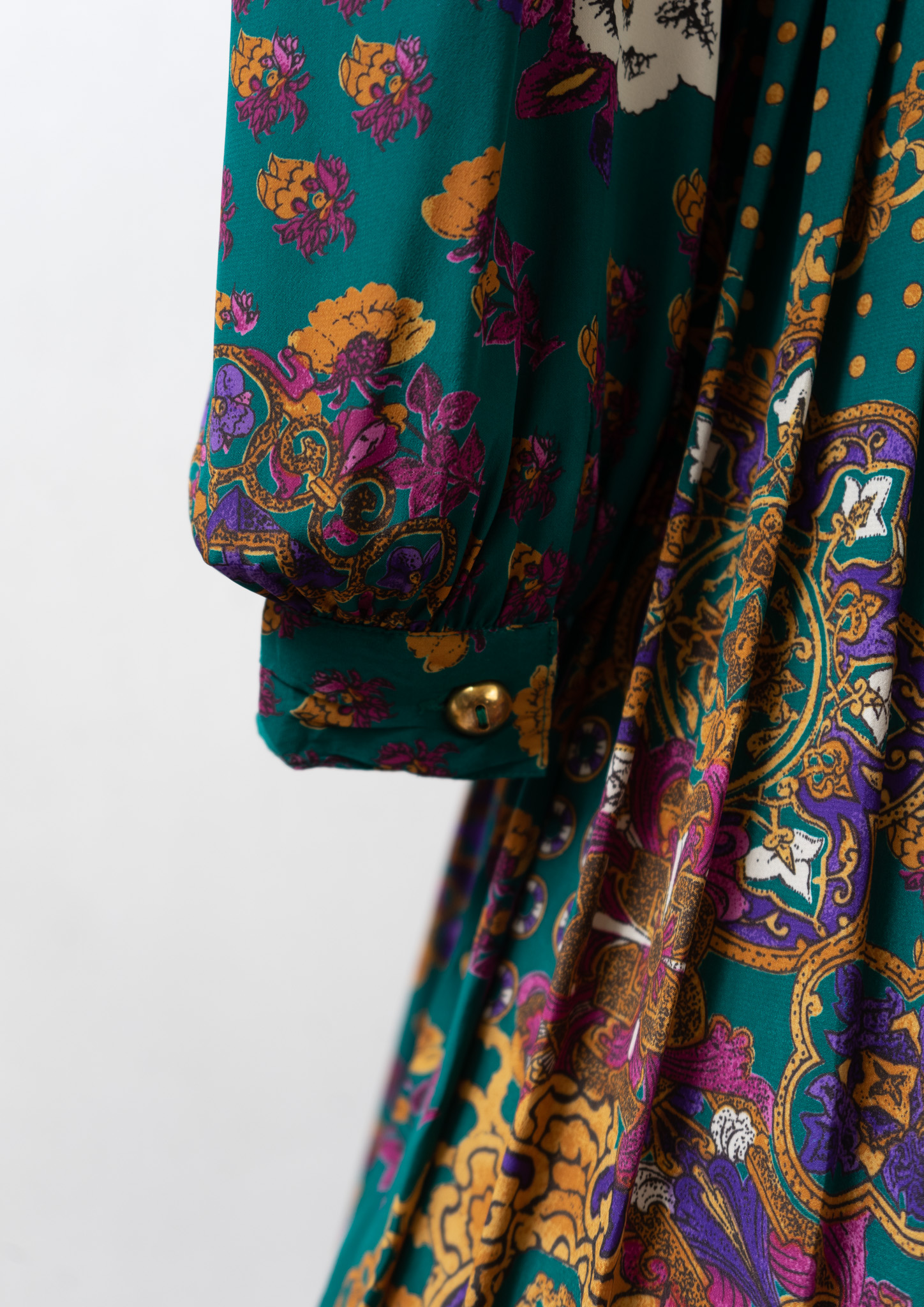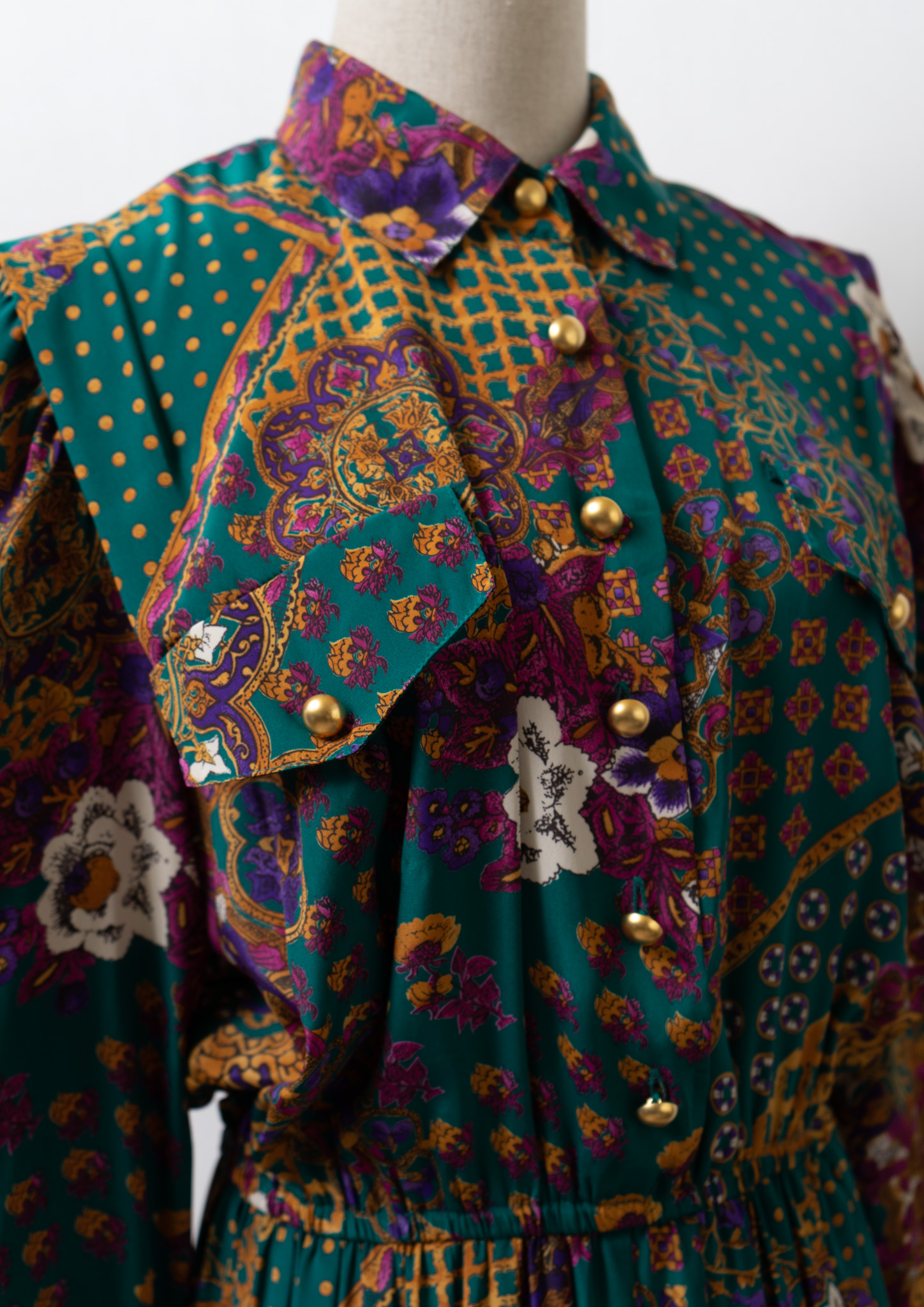 80~90's LESLIE FAY Mixd Scarf Pattern Pleats Design Green Dress