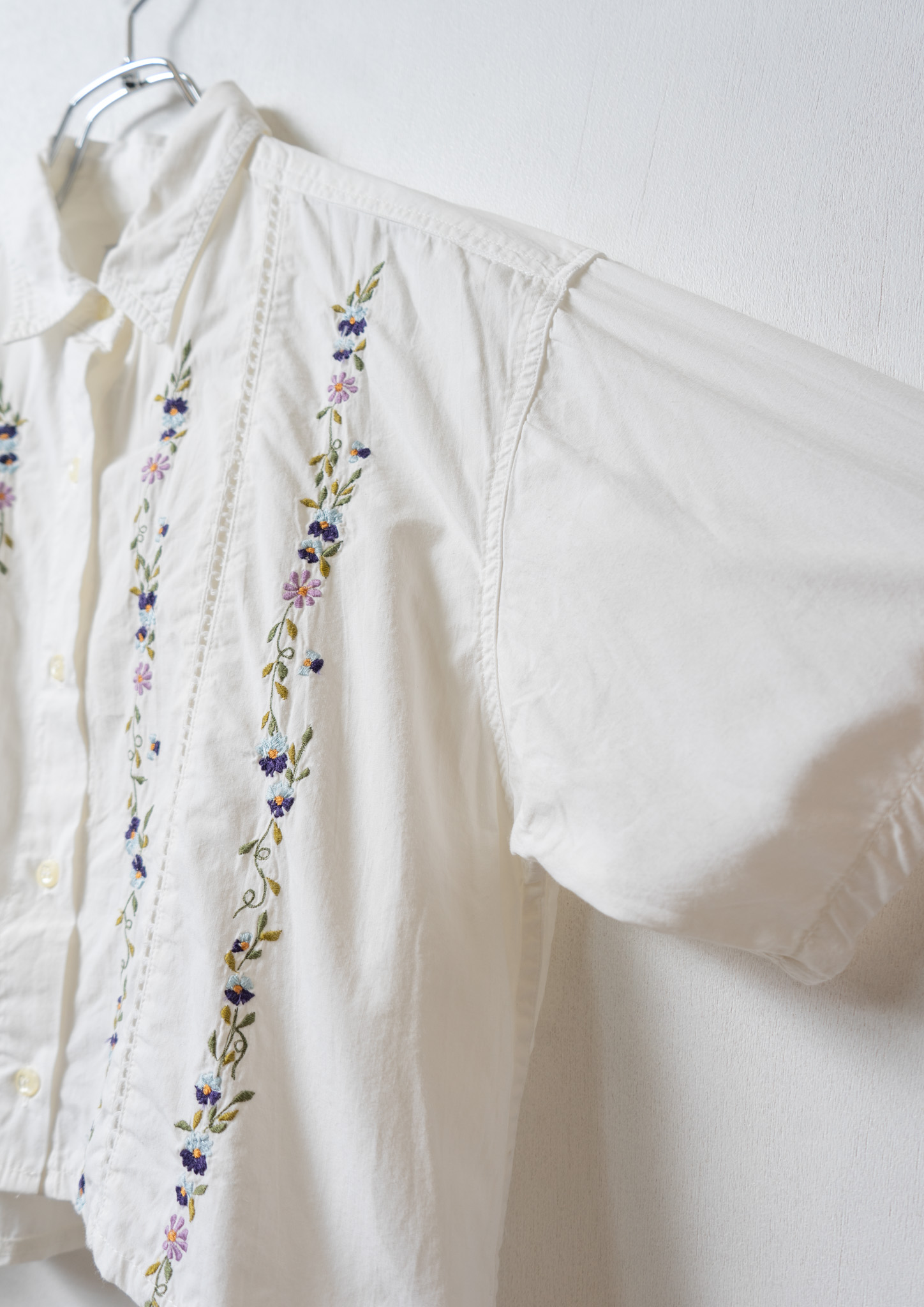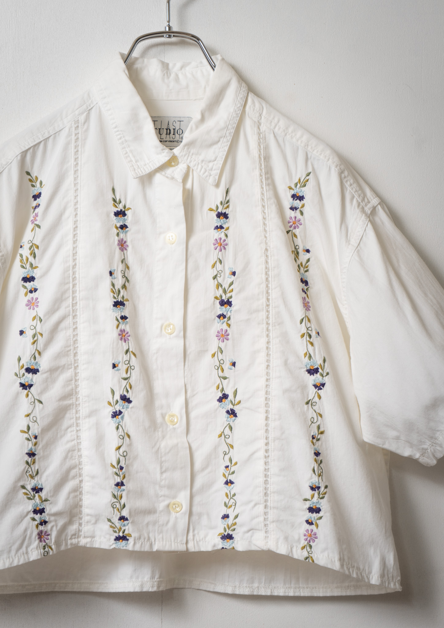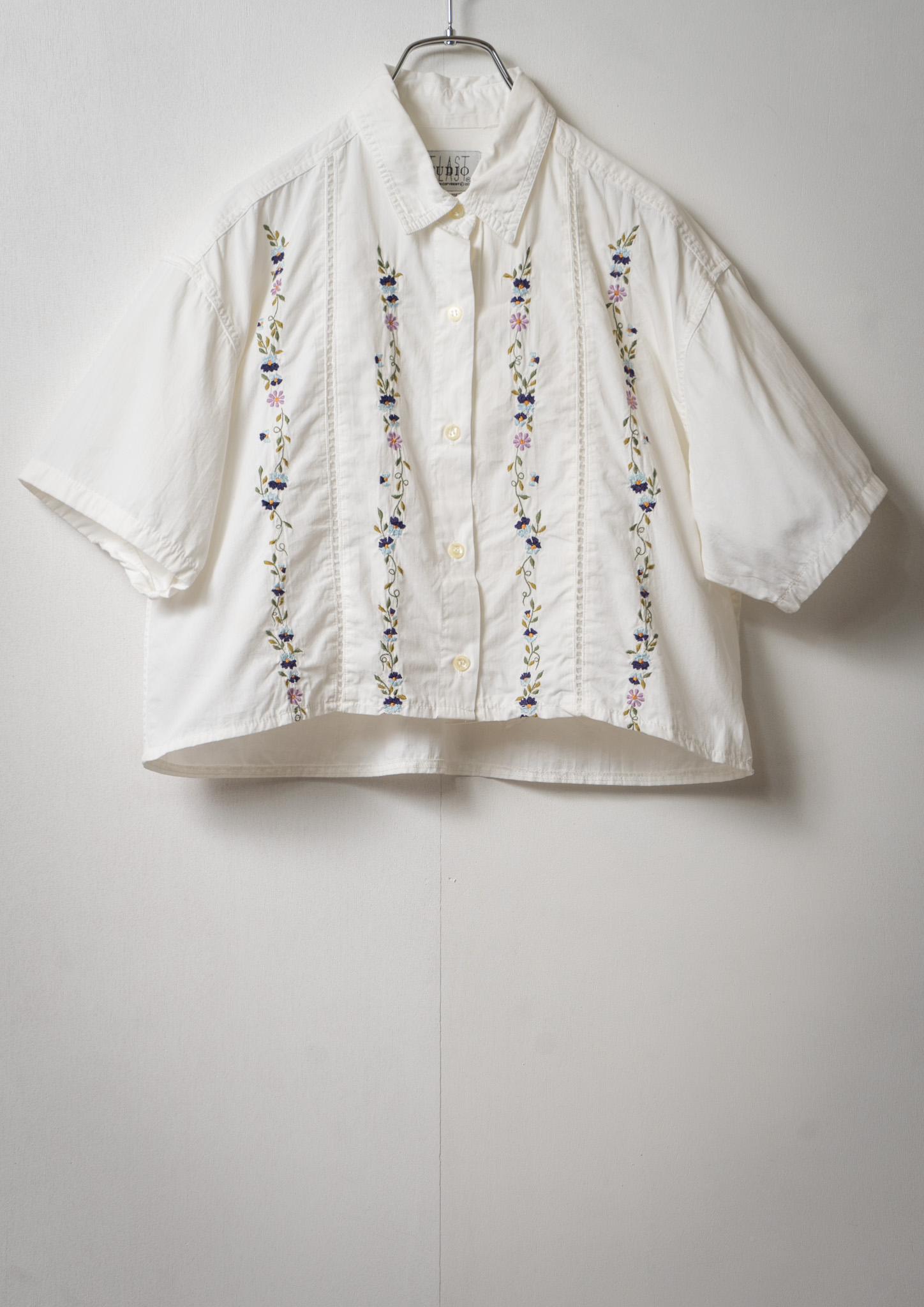 Upcycle Flower Embroidery Big Collar White Blouse
