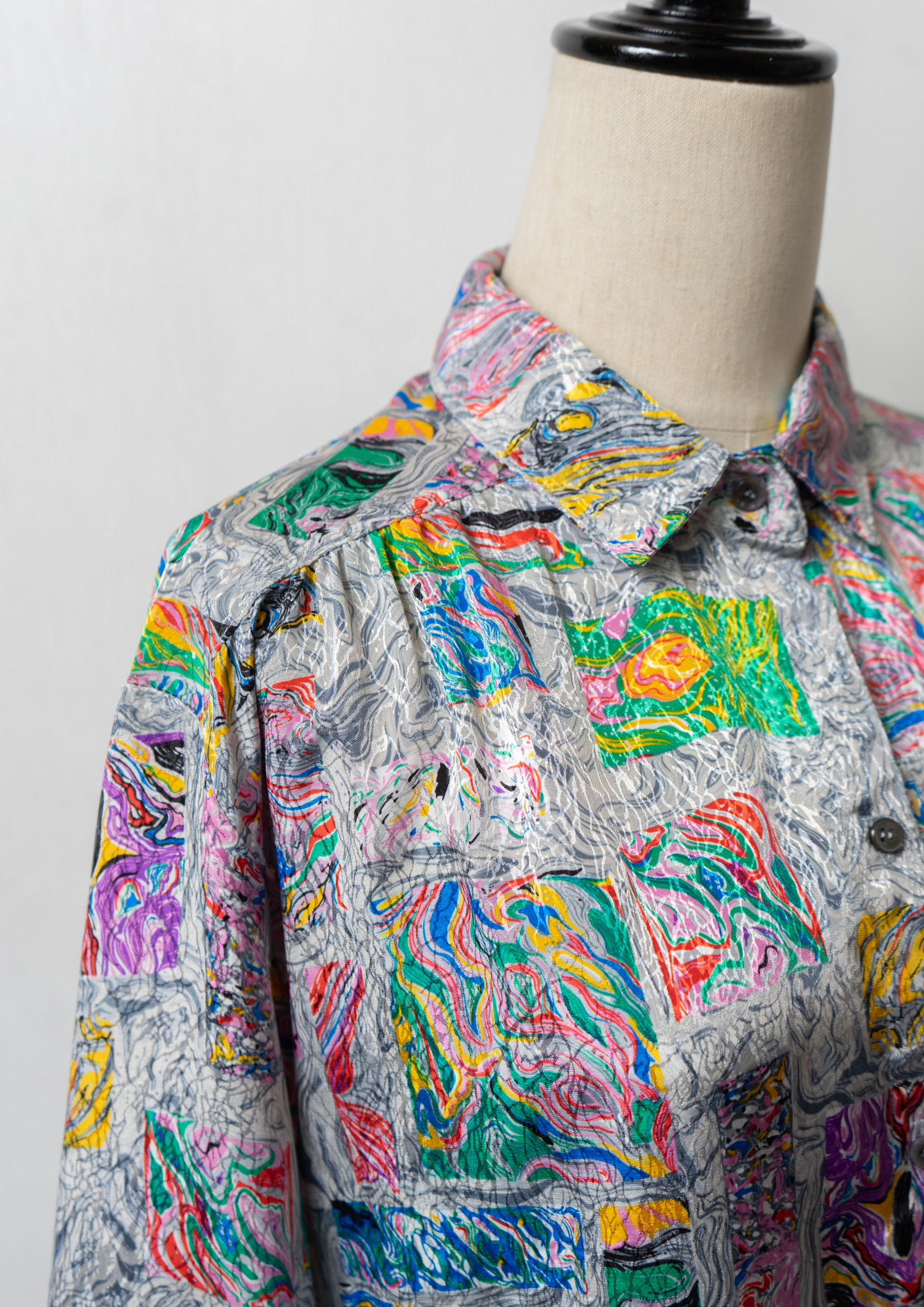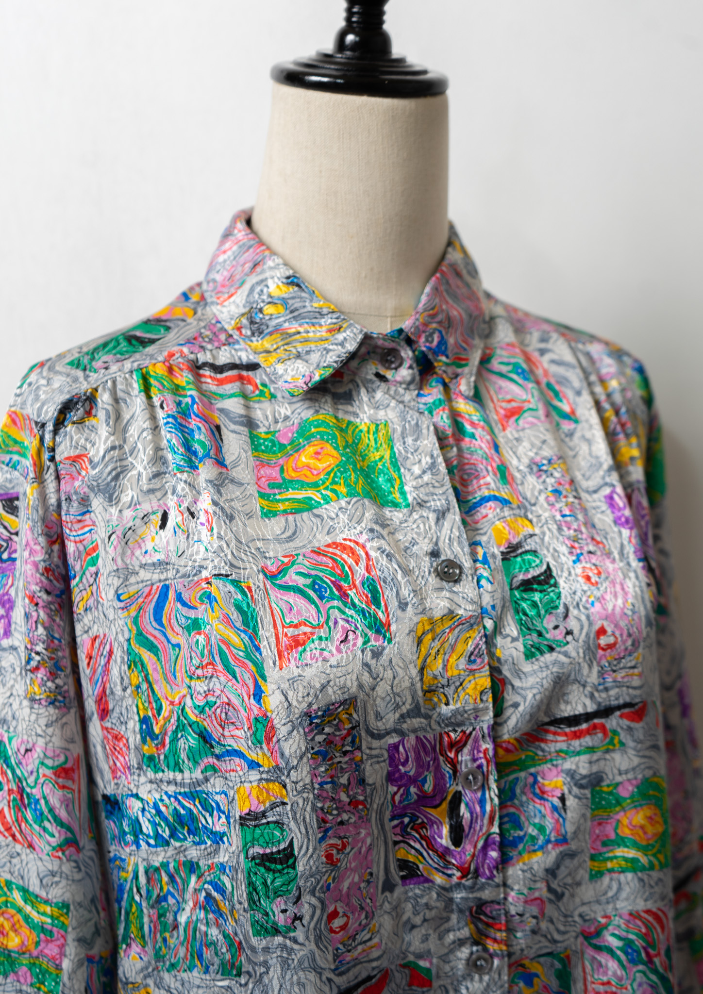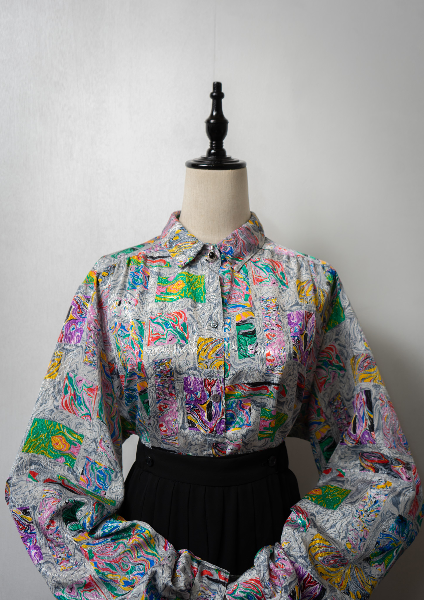 80's USA LESLIE FAY Unique Art Pattern Glossy Blouse
