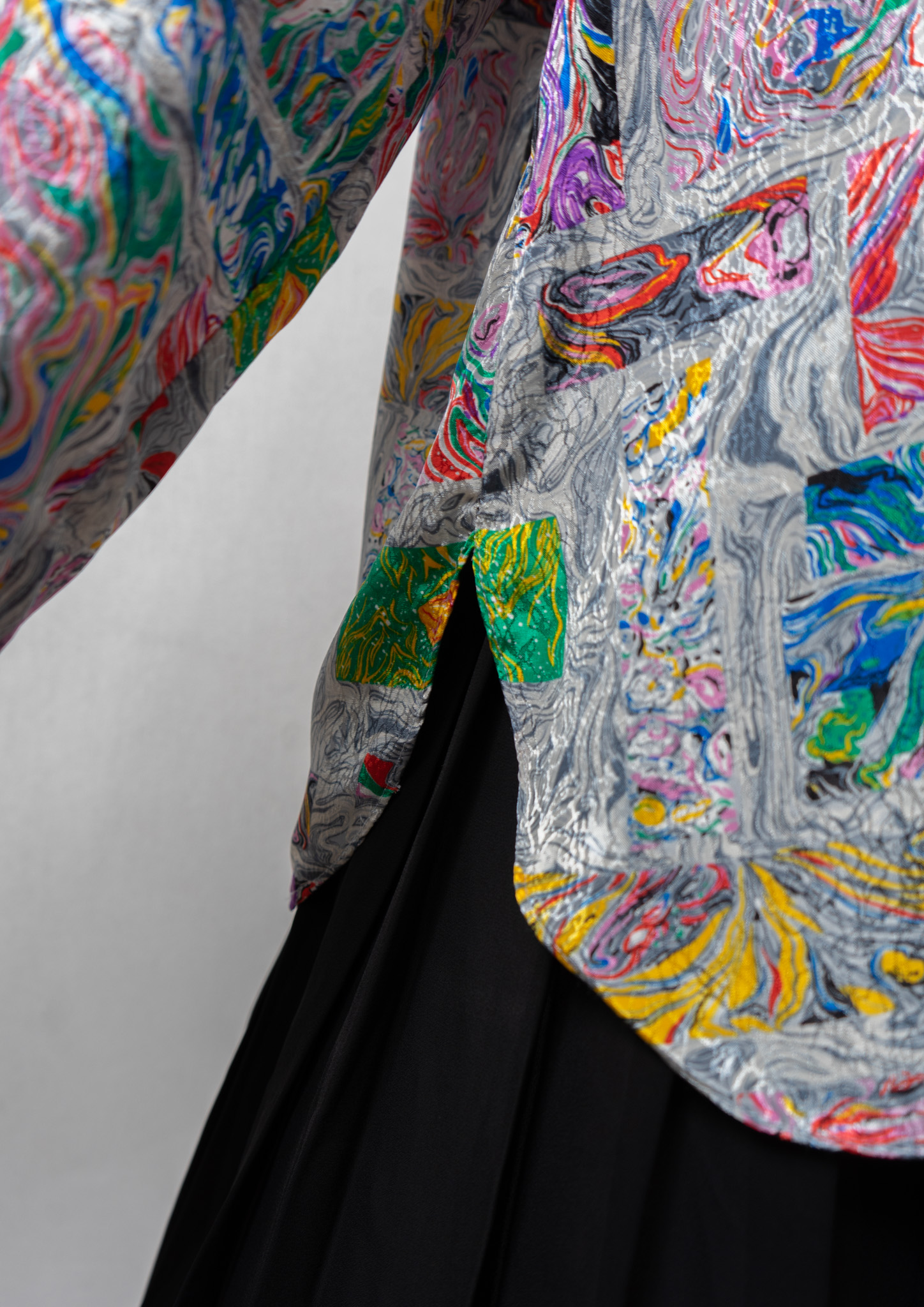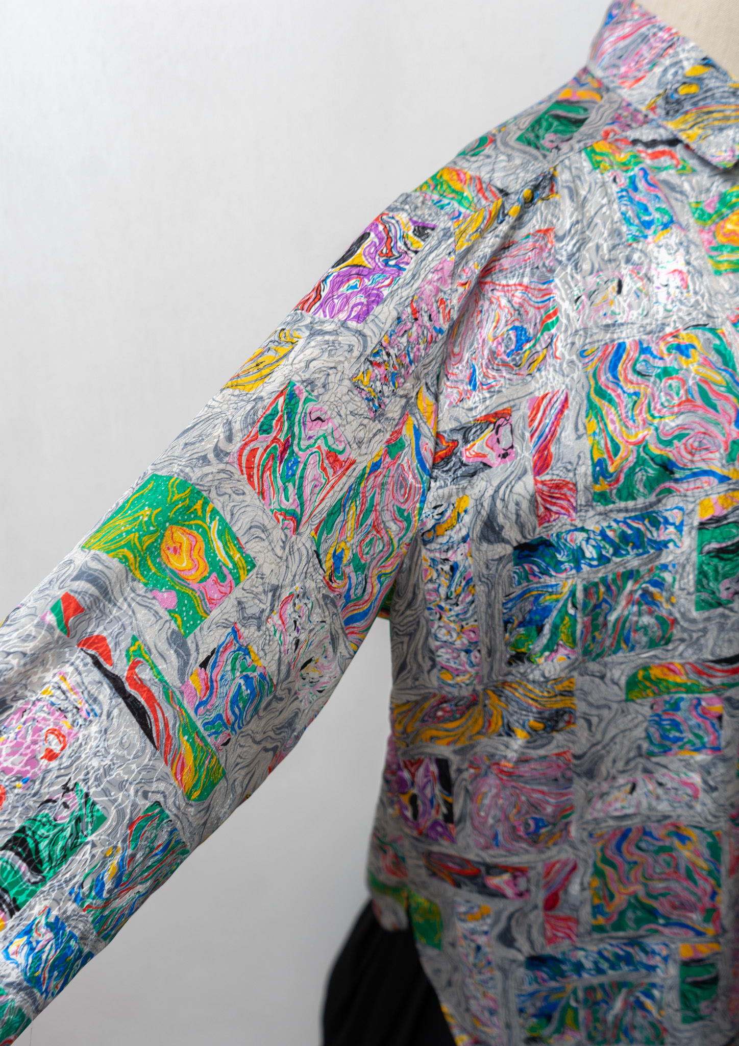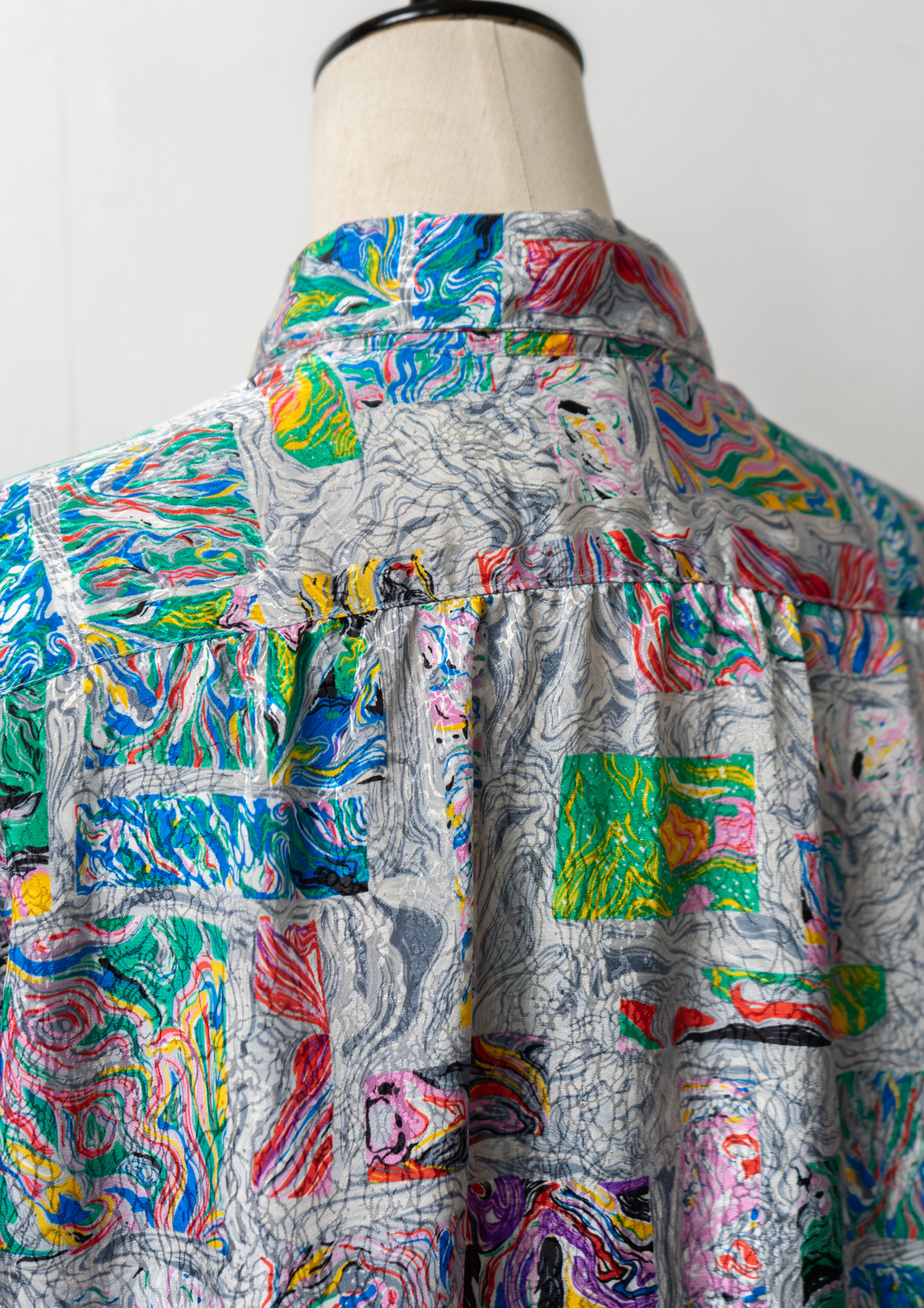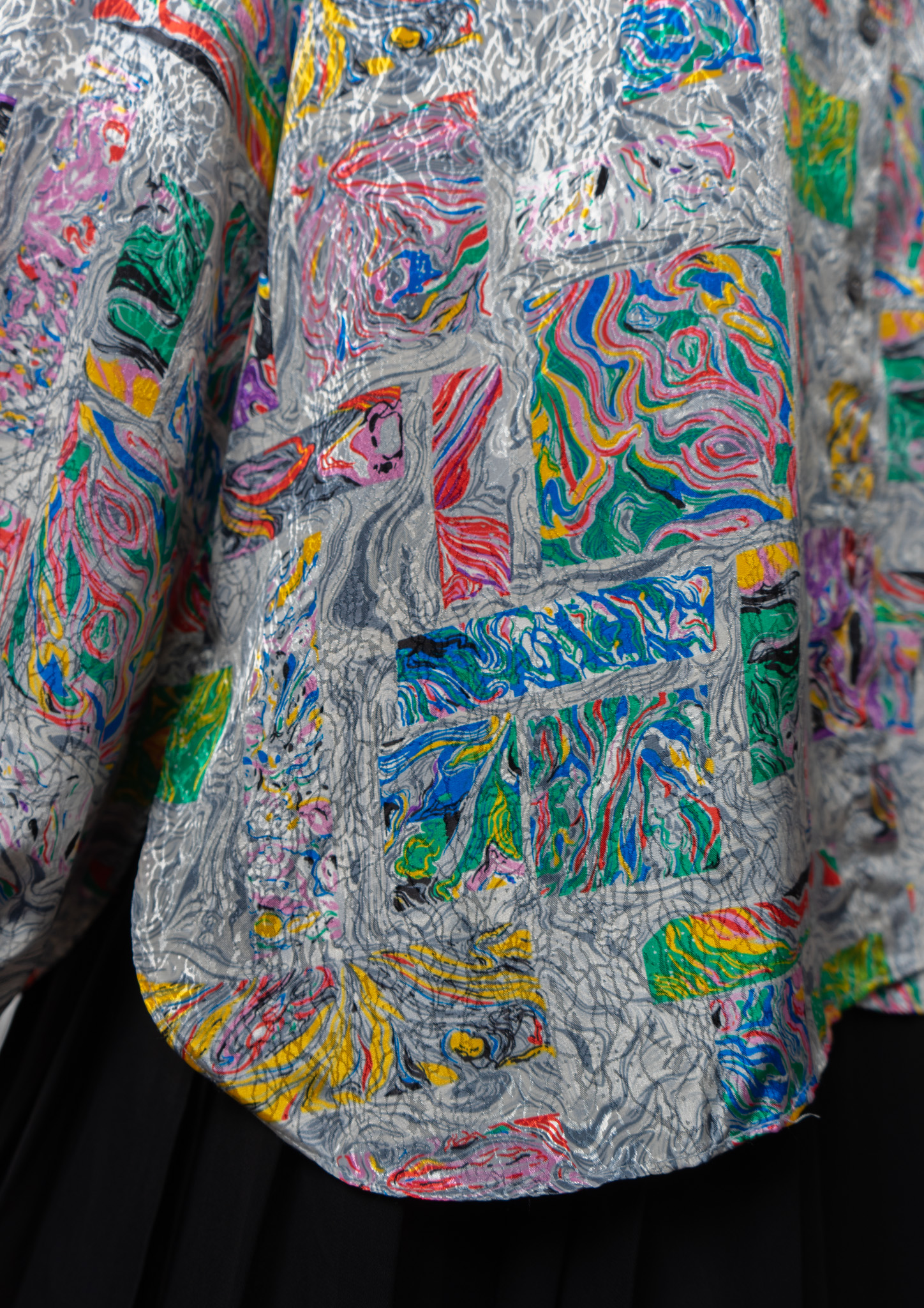 80's USA LESLIE FAY Unique Art Pattern Glossy Blouse