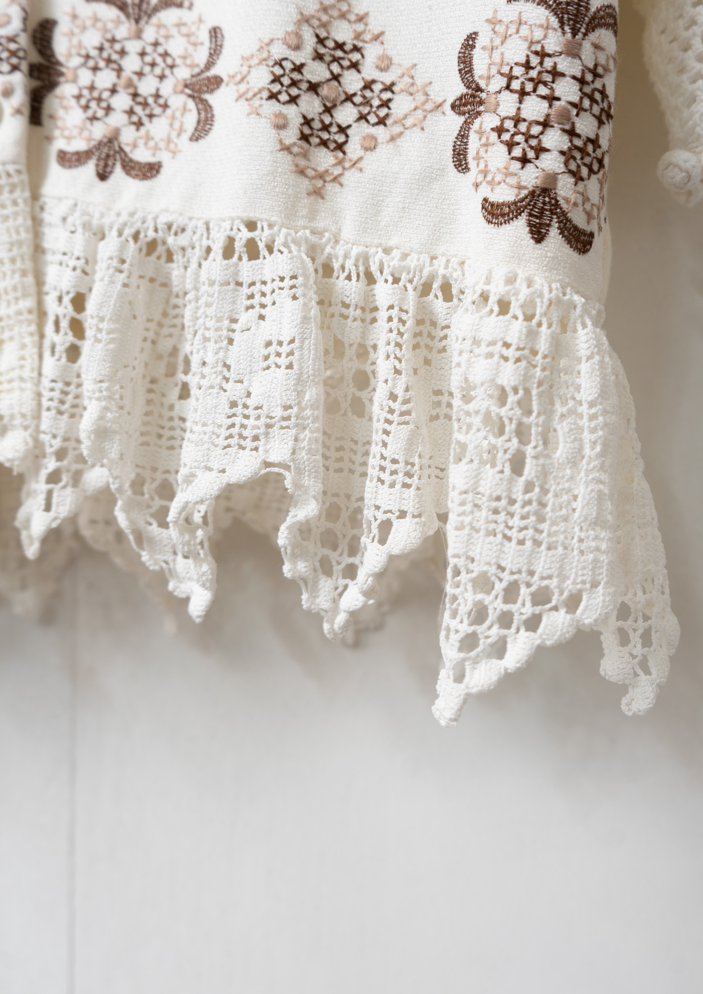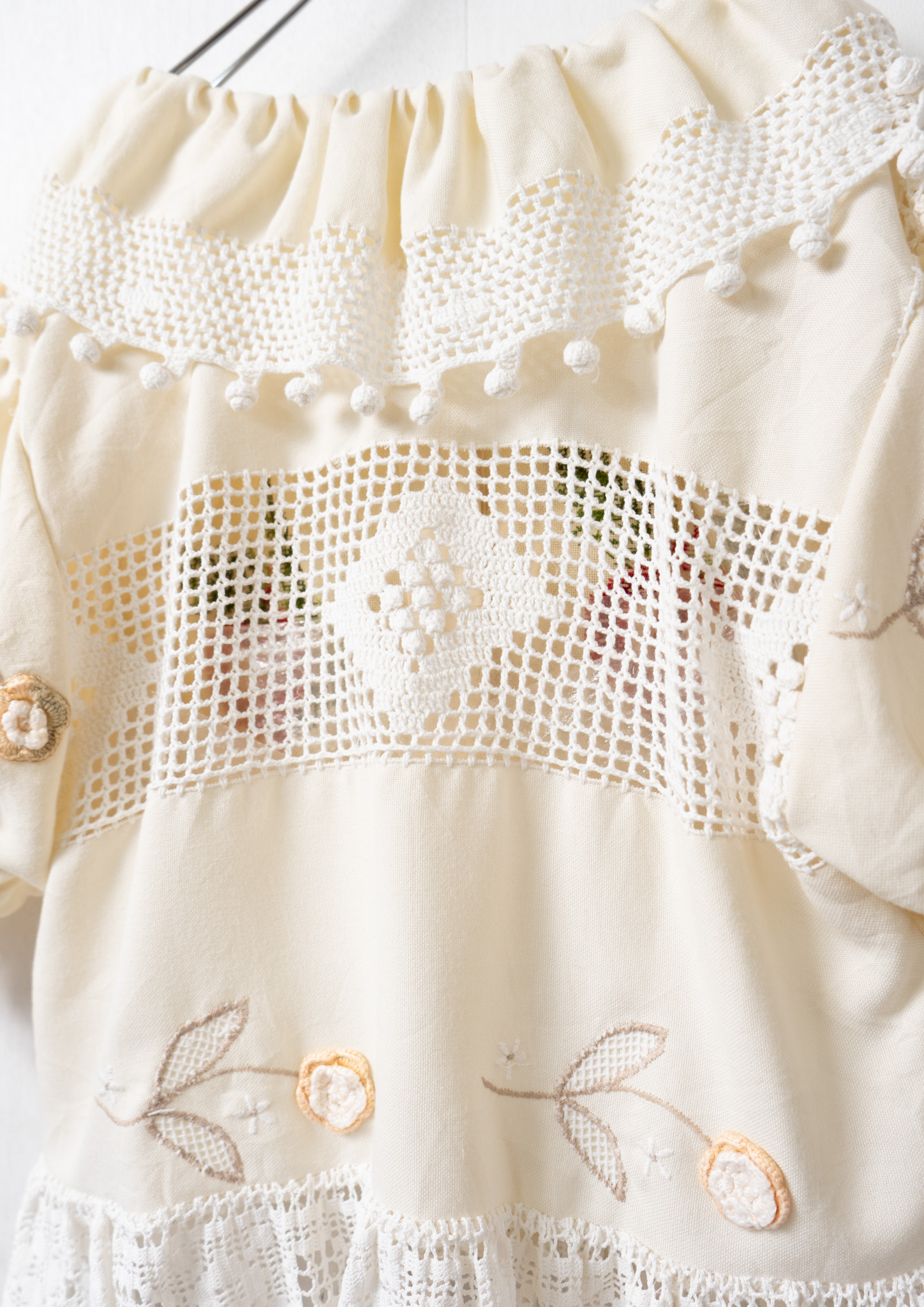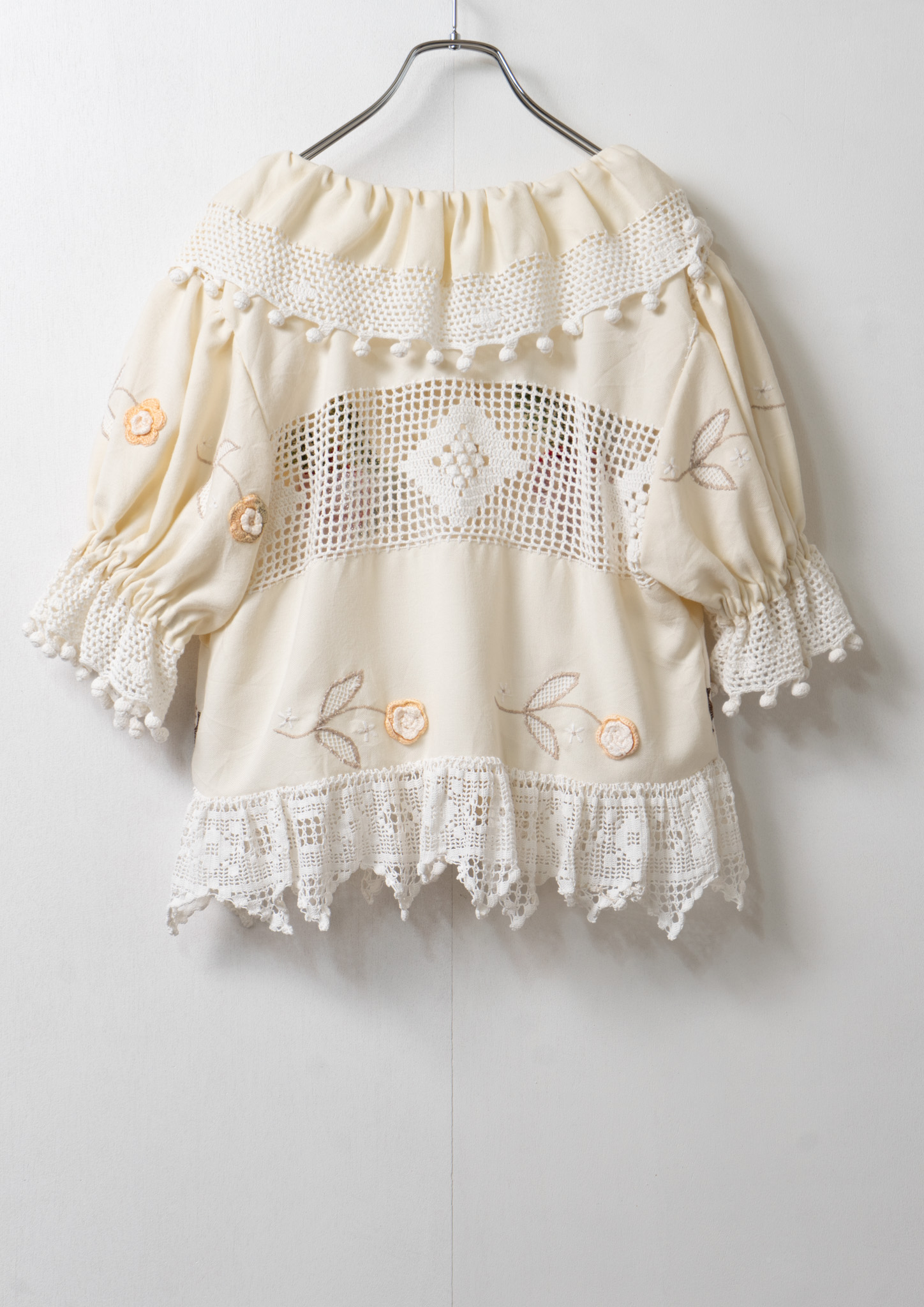 Upcycle Bird × Flower Embroidery Lace Collar White Blouse