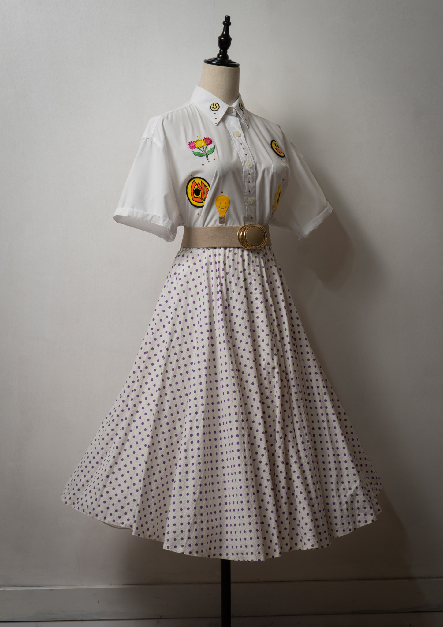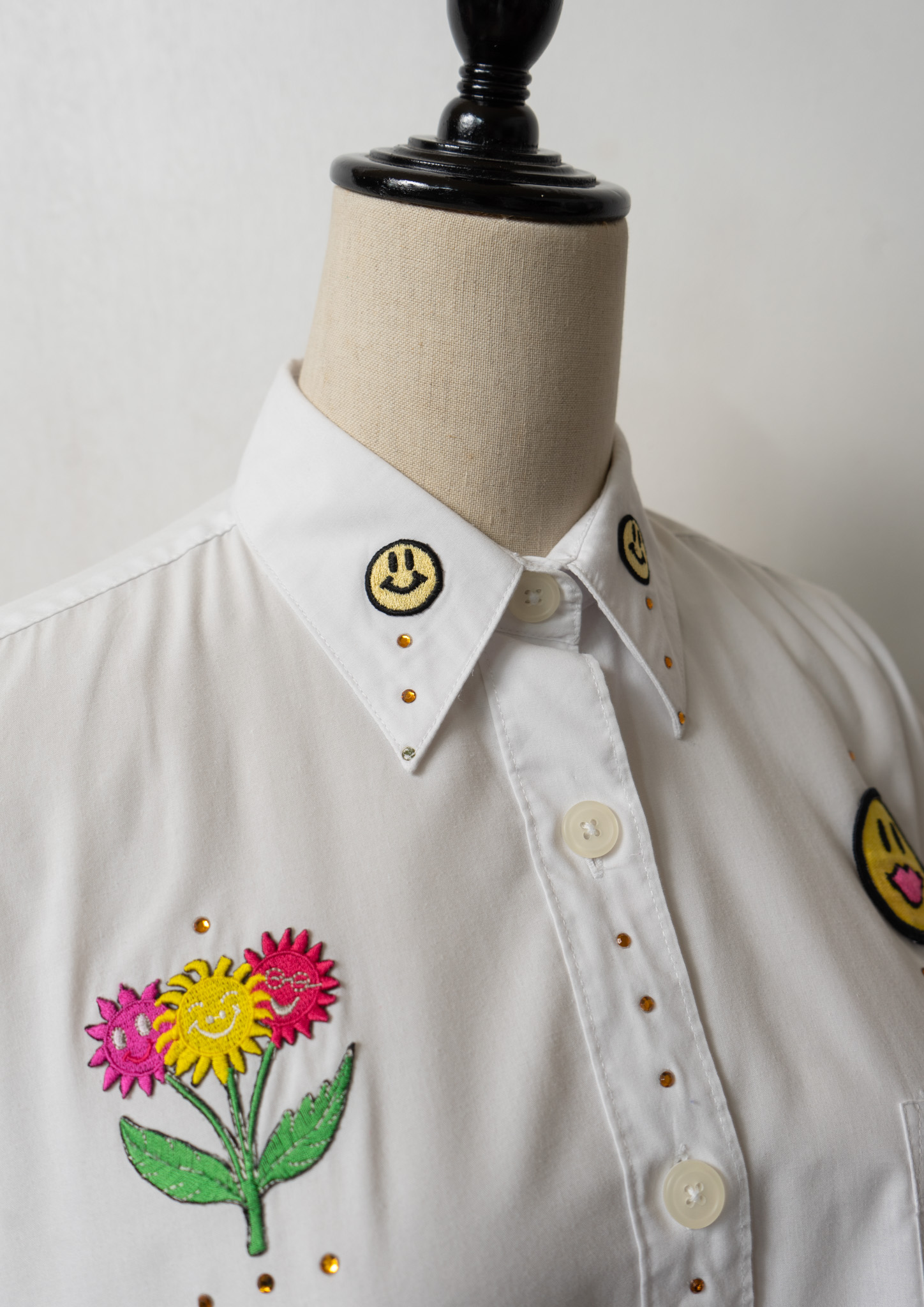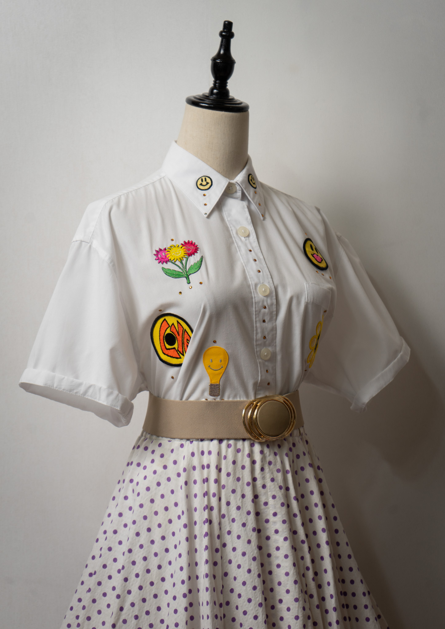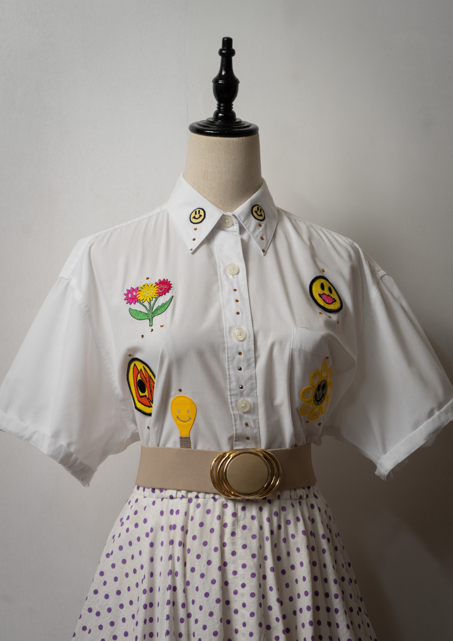 Upcycle Ribbon × Flower Embroidery Big Collar White Blouse