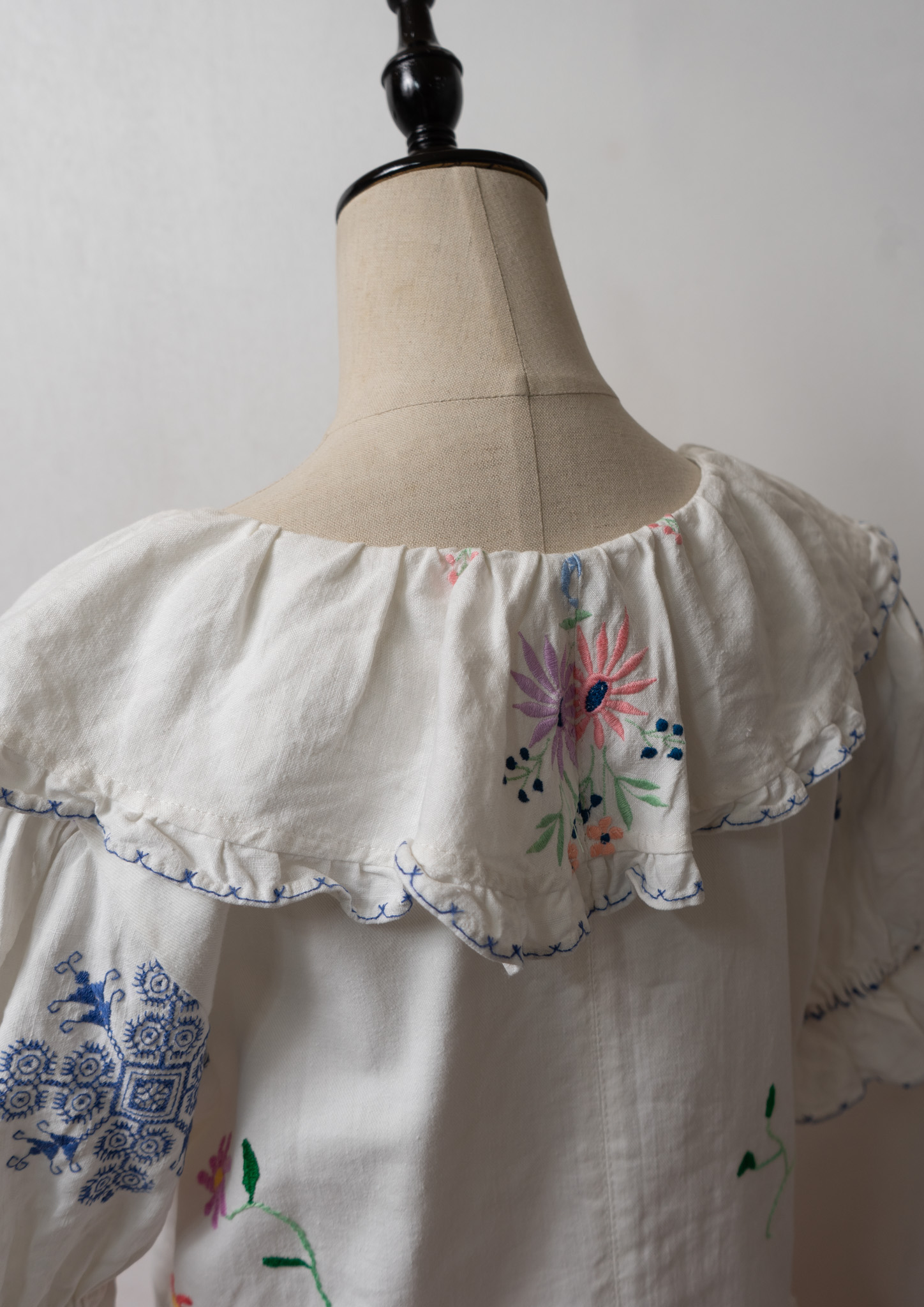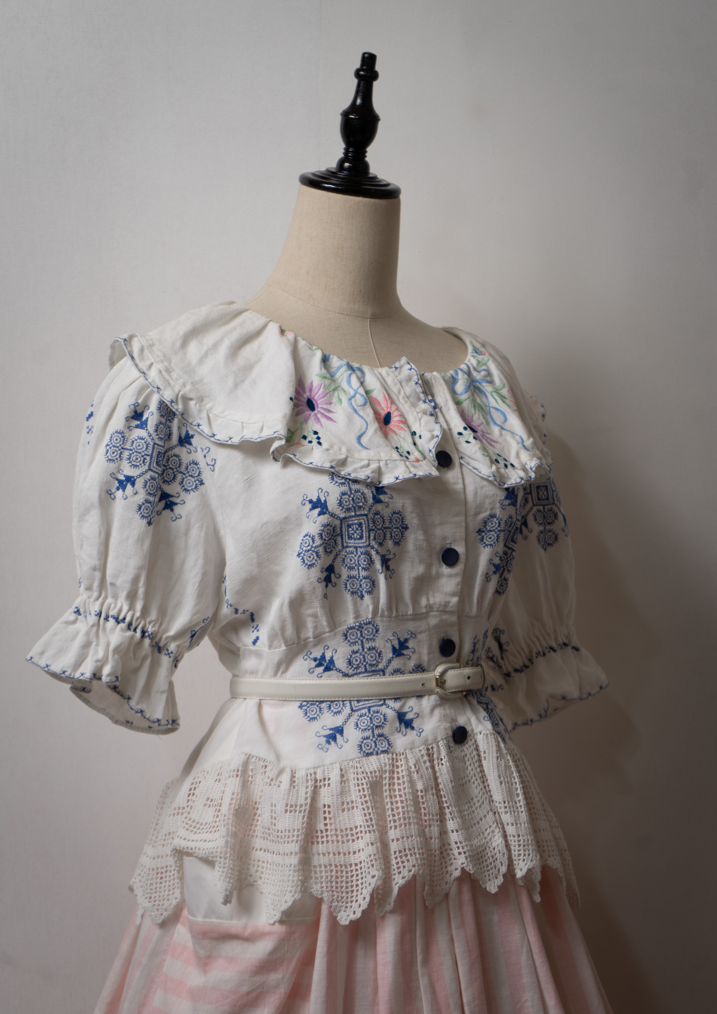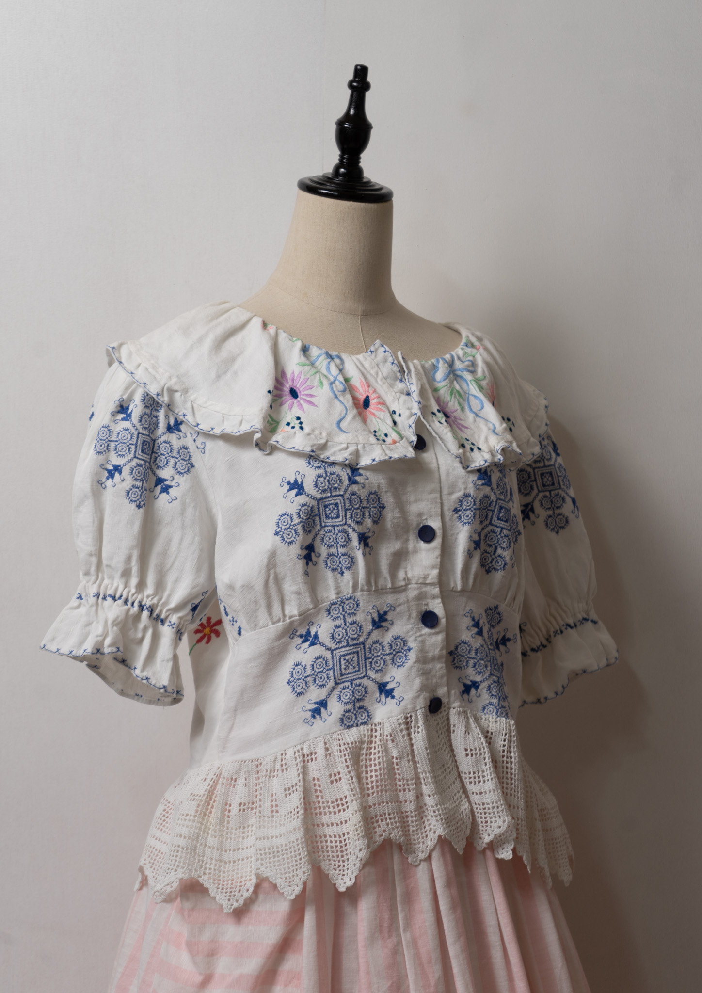 Upcycle Ribbon × Flower Embroidery Big Collar White Blouse