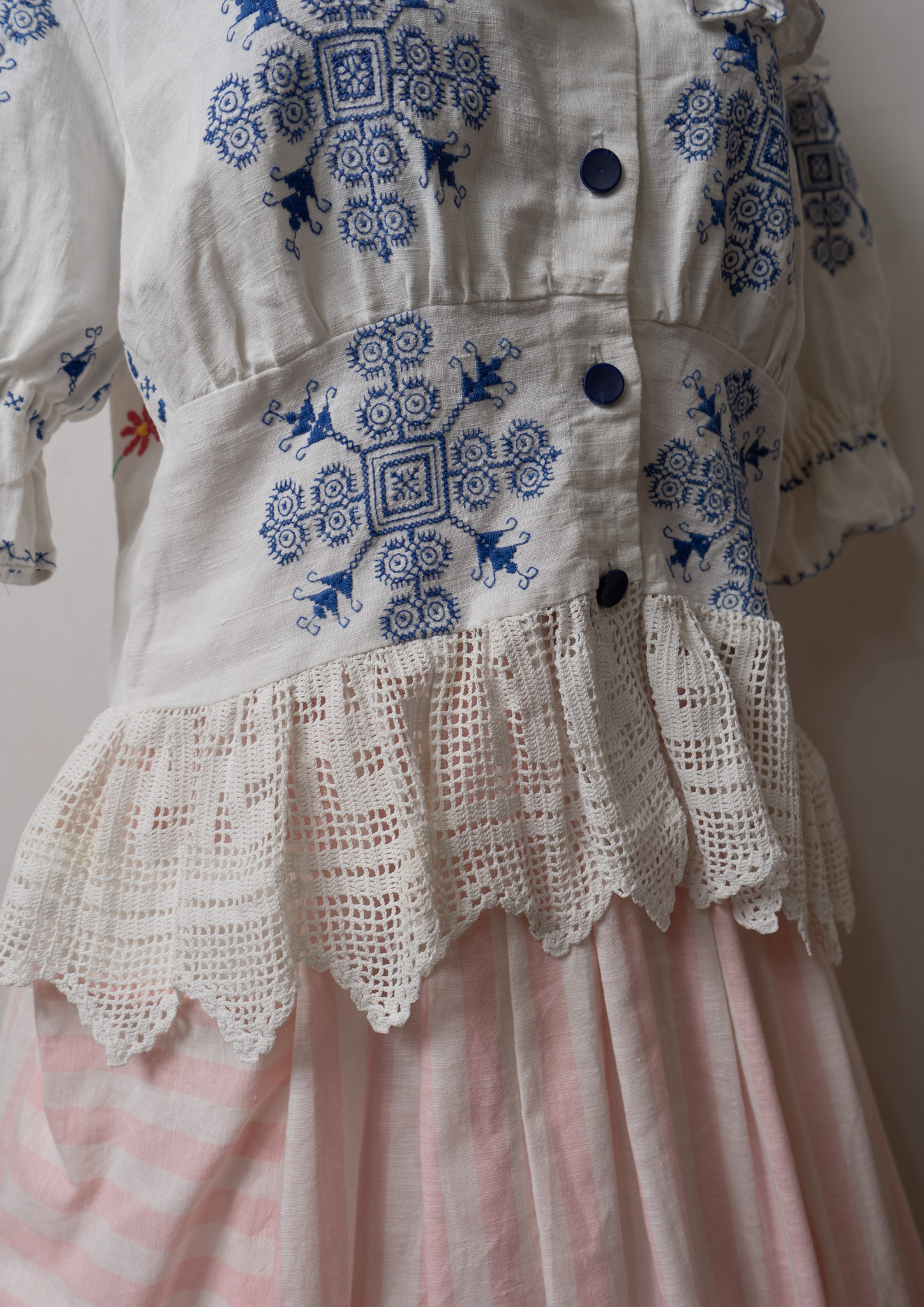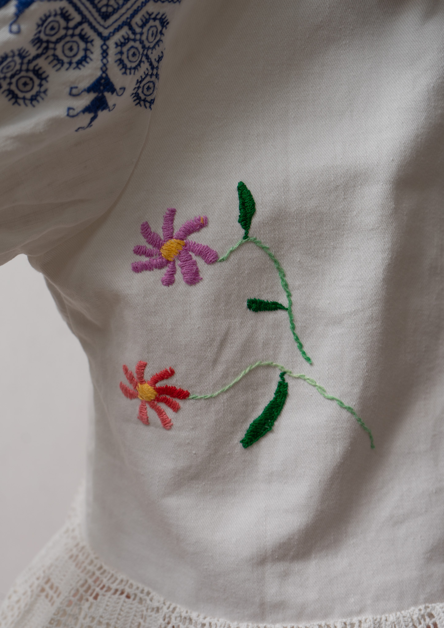 Upcycle Flower Embroidery Crochet Lace White Blouse