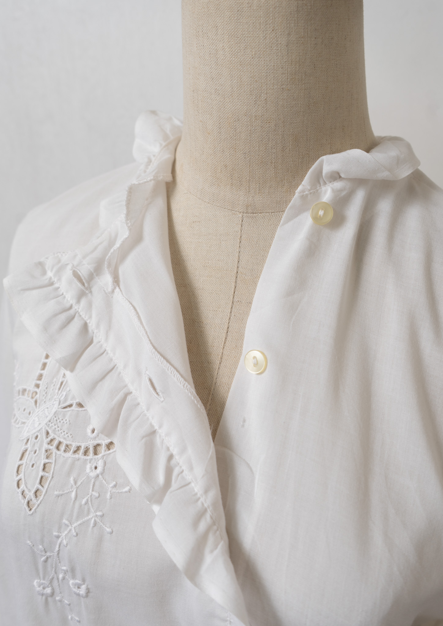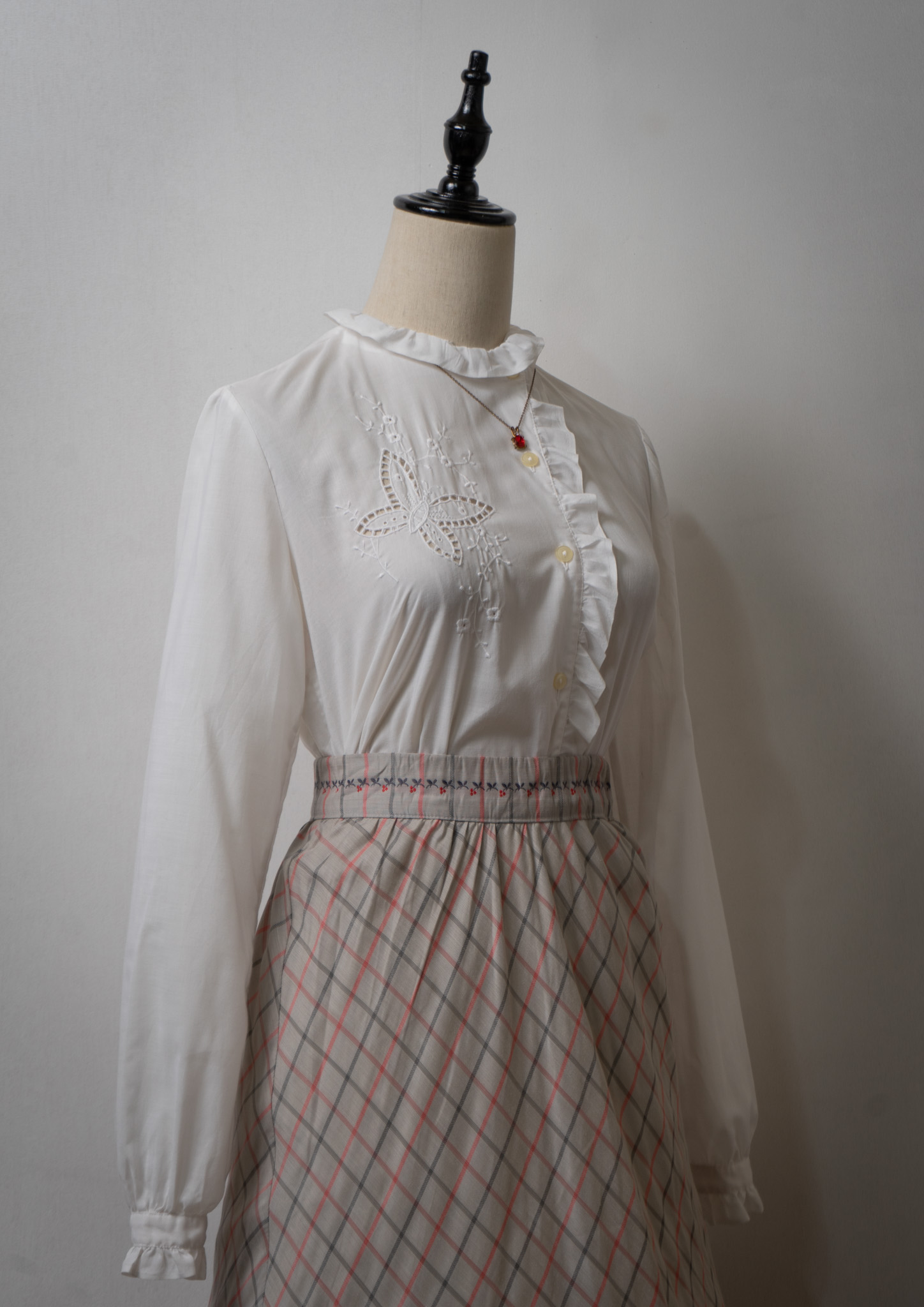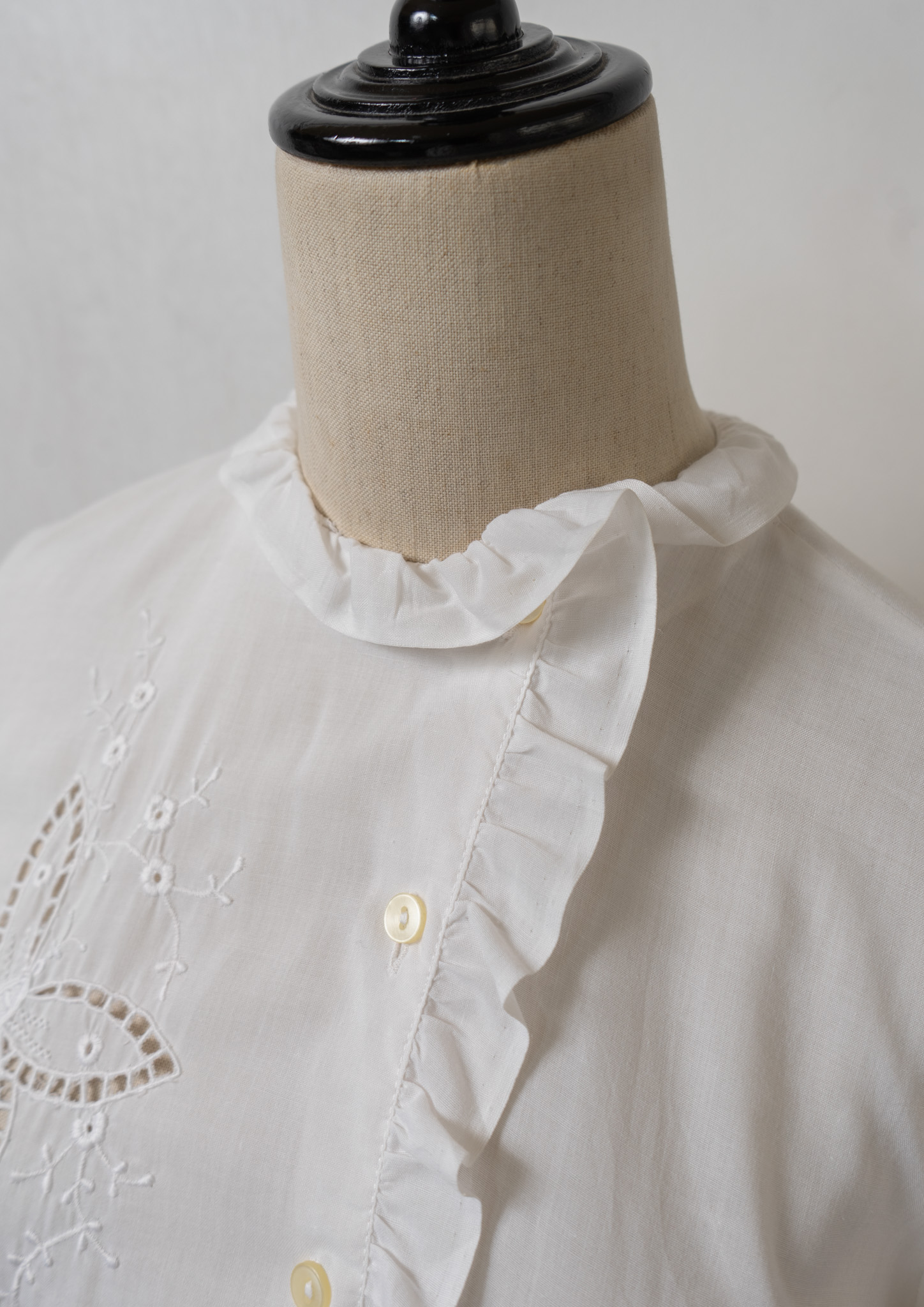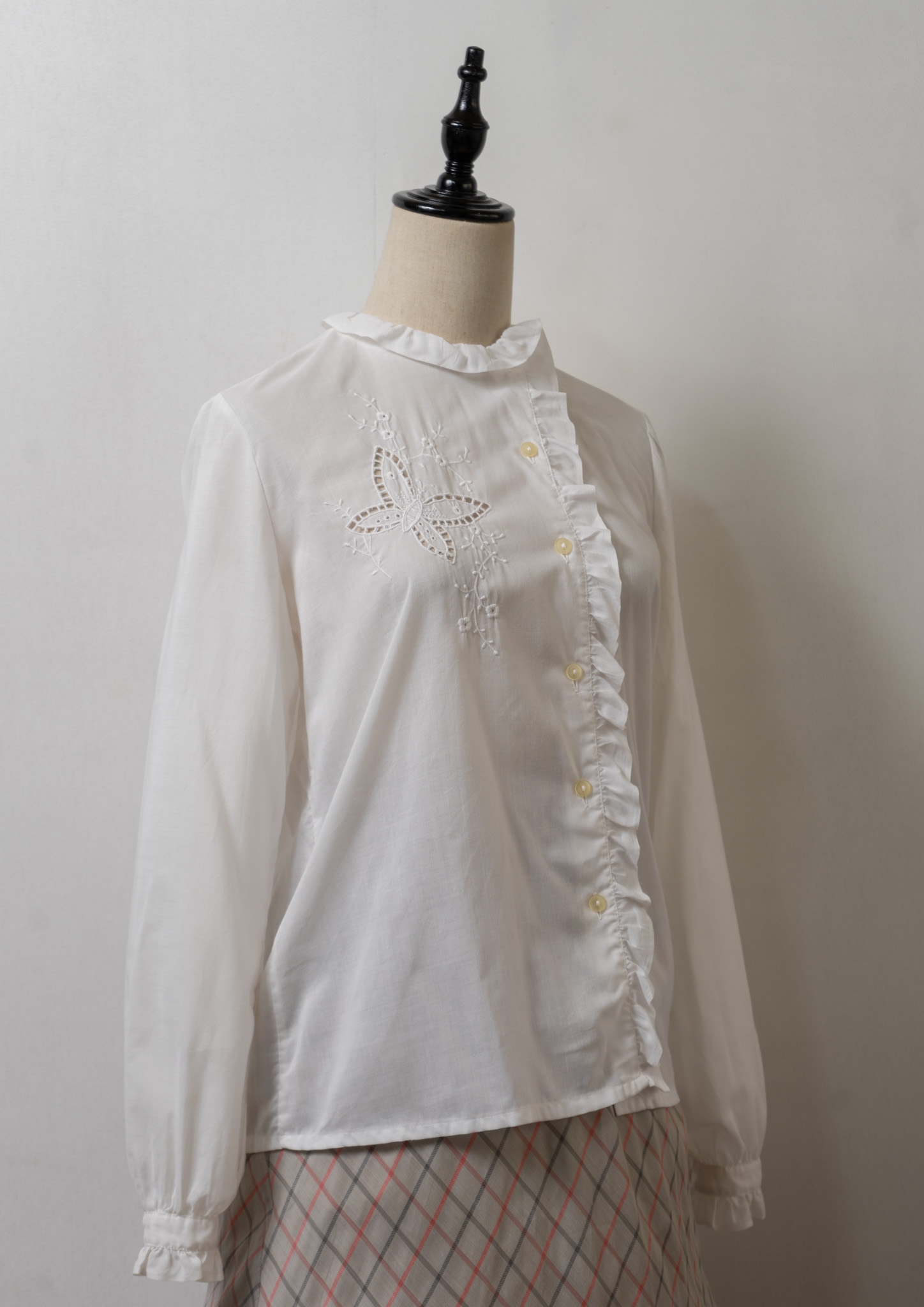 70~80’s Butterfly × Flower Embroidery Frill Design Whiite Blouse