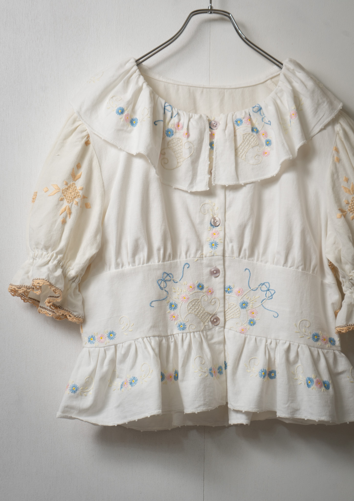 Upcycle Ribbon × Flower Embroidery Big Collar White Blouse