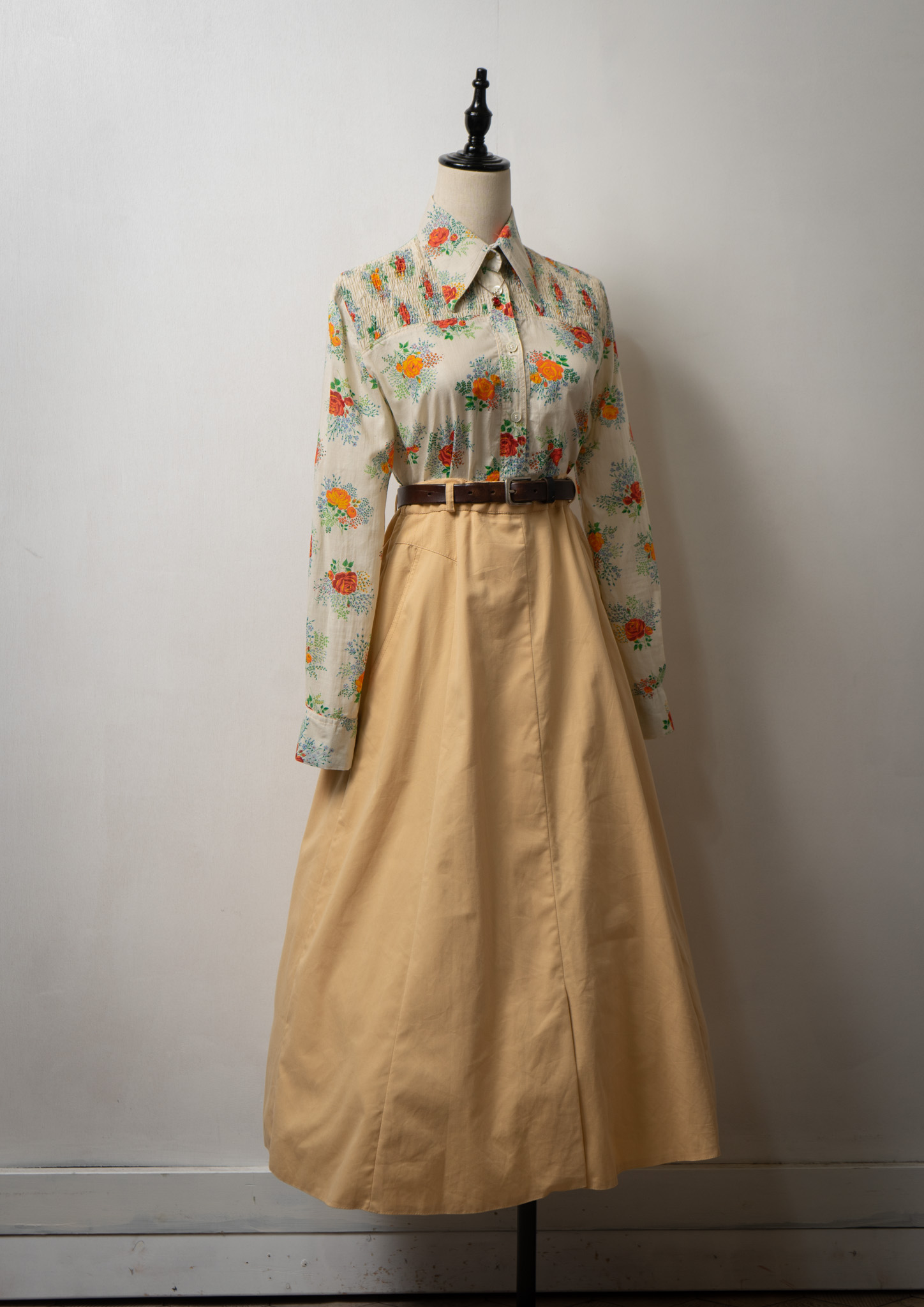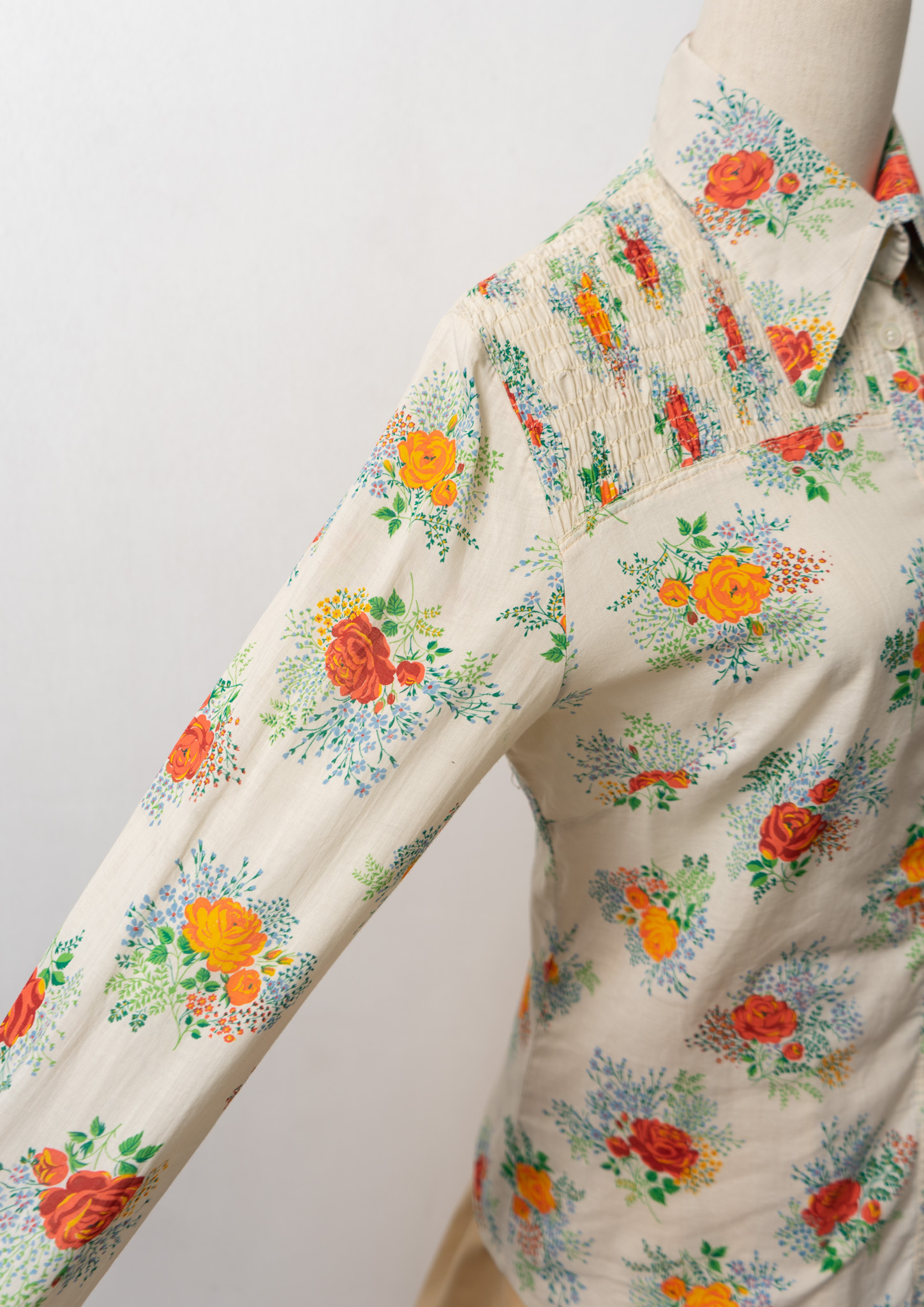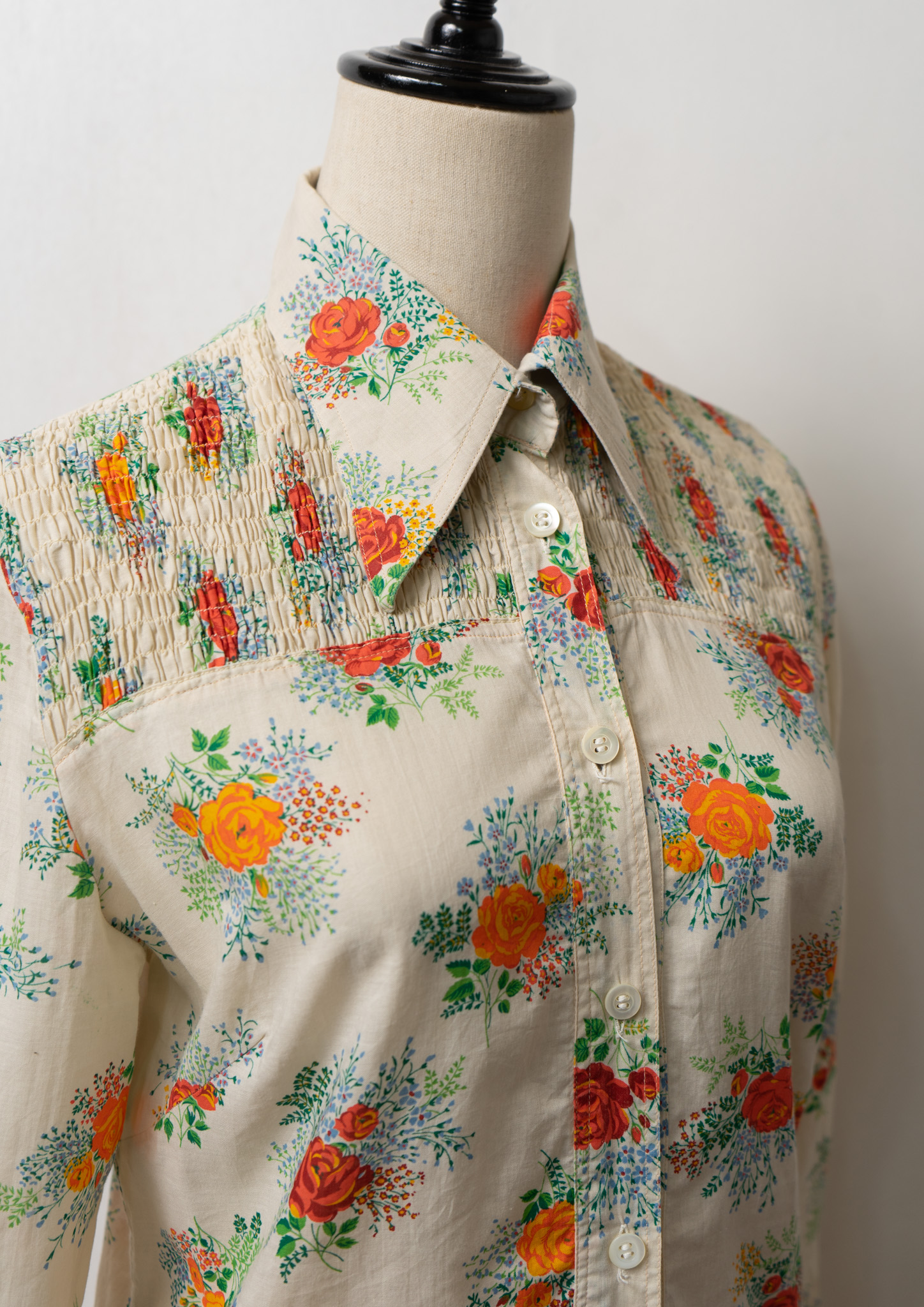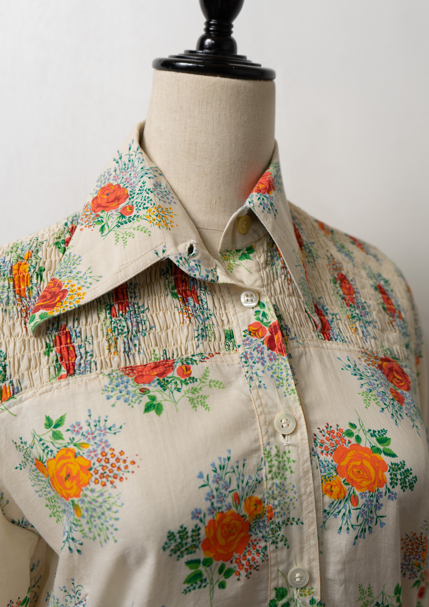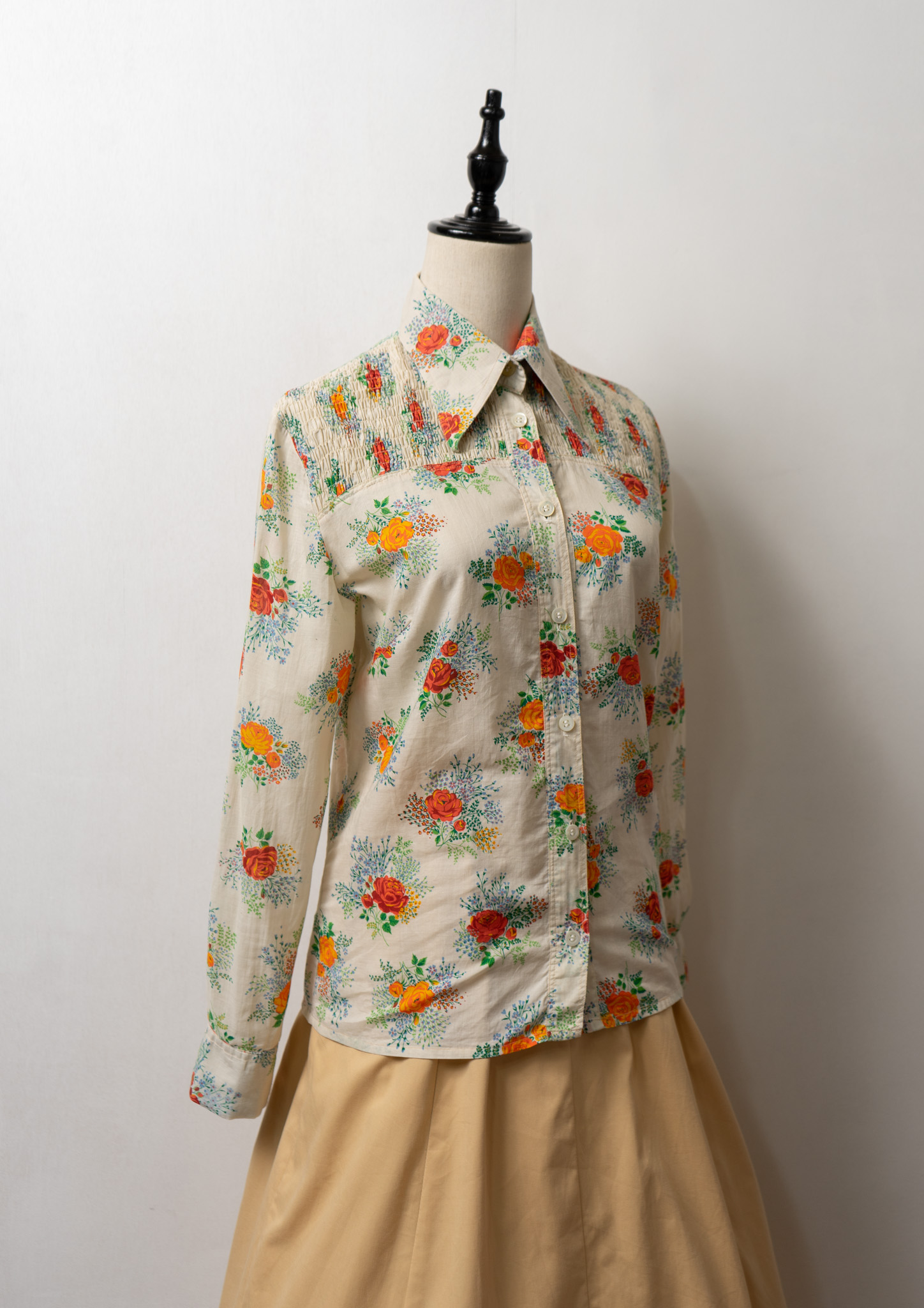 70’s Flower Bouquet Pattern Shirring Design Blouse