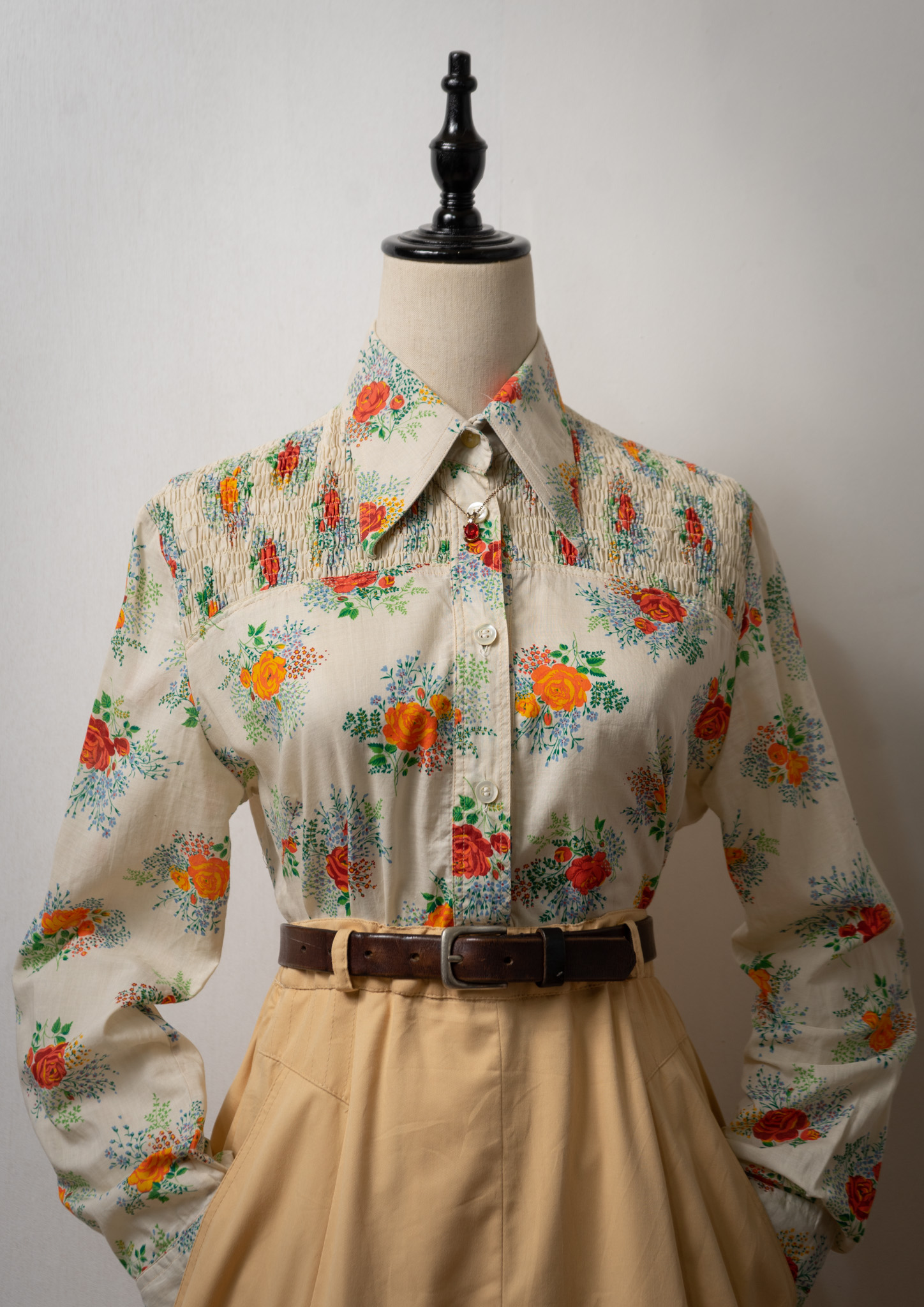 70’s Flower Bouquet Pattern Shirring Design Blouse