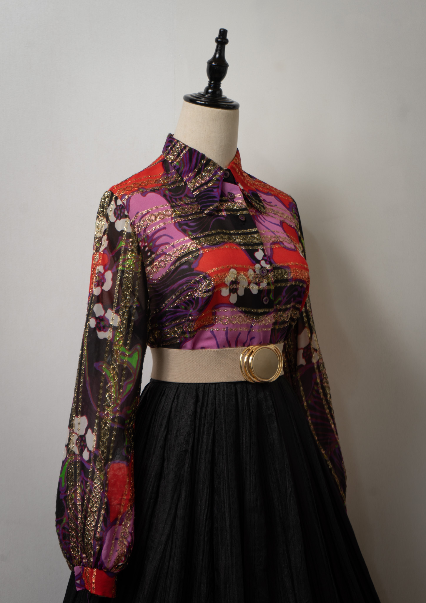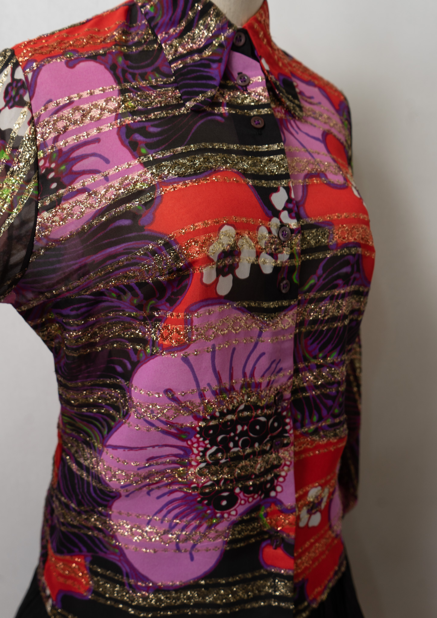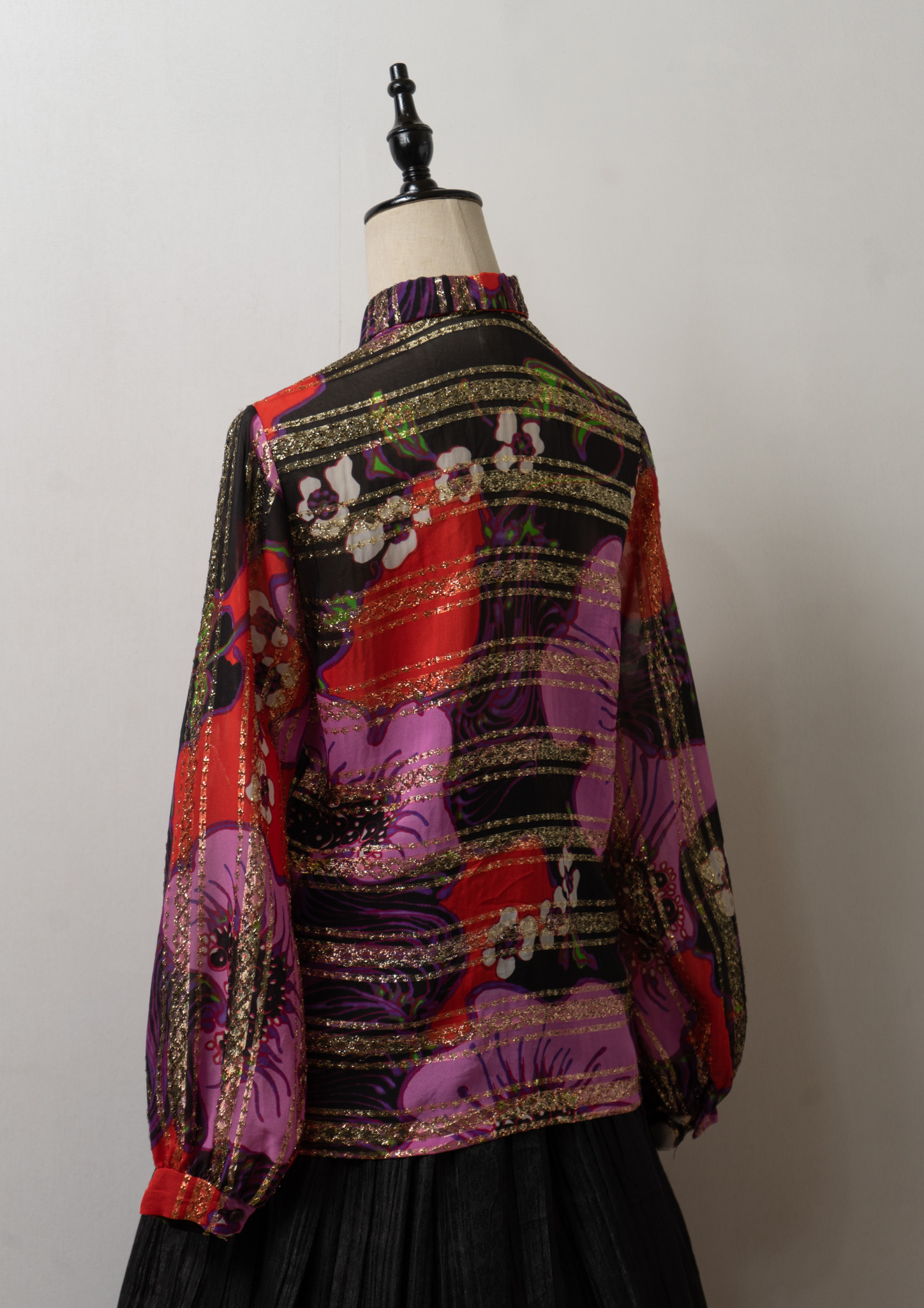 70's Flower Motif Pattern Gold Lame Thread Blouse