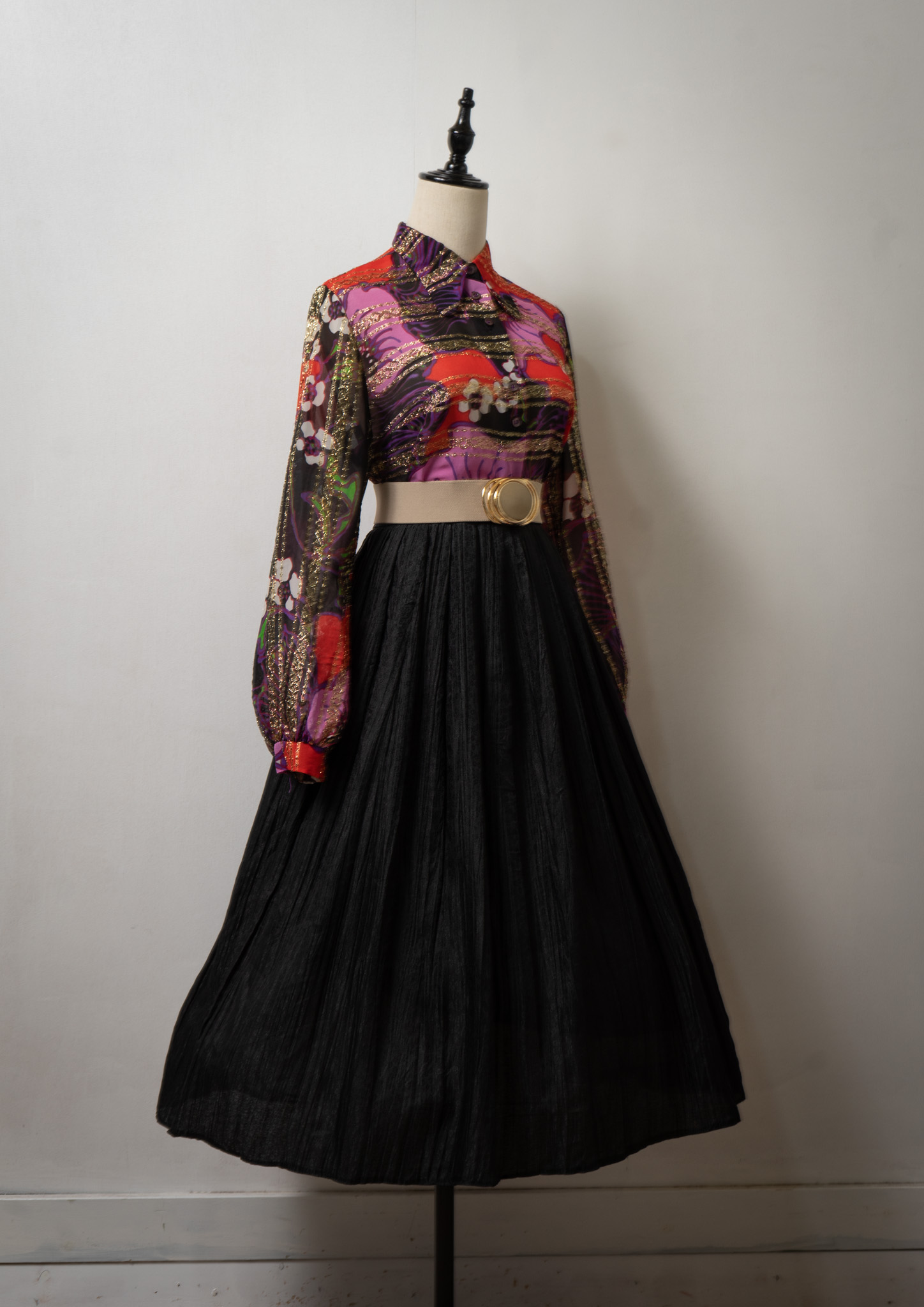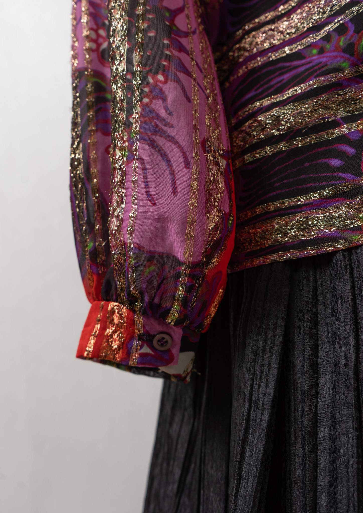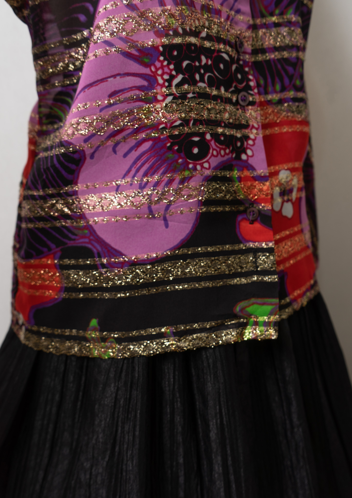 70's Flower Motif Pattern Gold Lame Thread Blouse