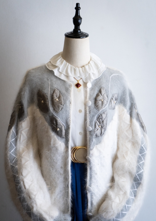 70's West Germany Light Gray × White Leaf Design Angora Knit Cardigan
