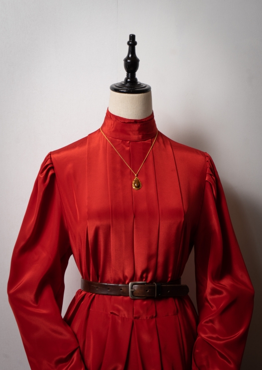 80's France Tuck Design Mad Glossy Stand Neck Blouse