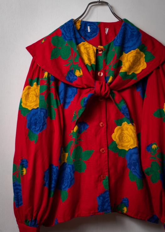 80's Canada Rose Pattern Big Collar Red Blouse
