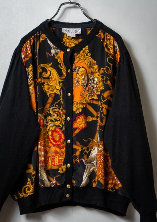 80's Euro Gold Button Design Scarf Like Pattern Black Cardigan