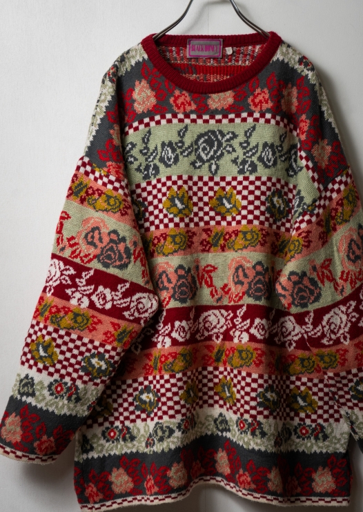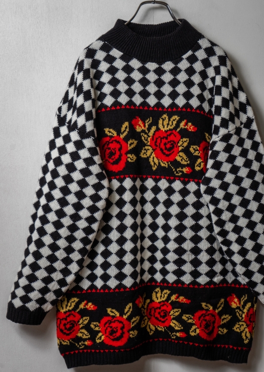 80's USA Rose × Flag Check Pattern Knit Sweater