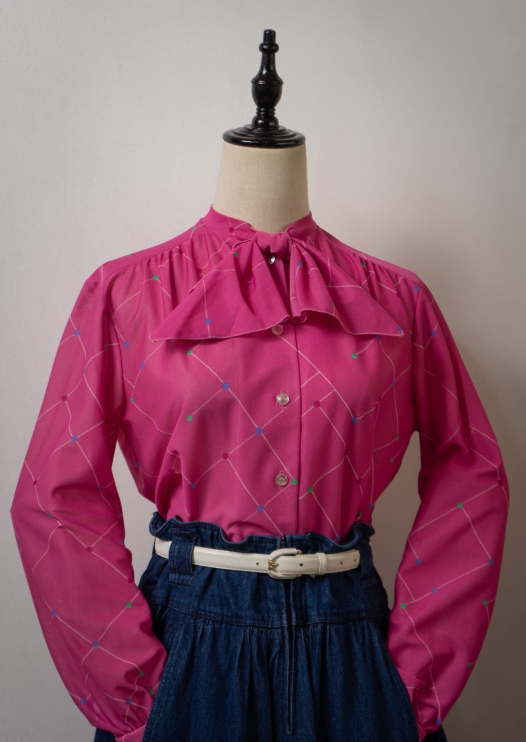 80’s Dot × Geometric Pattern Bow-tie Magenta Pink Blouse