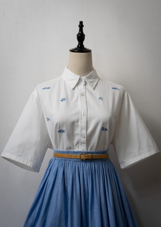 80~90’s Botanical Embroidery Smoky Blue Blouse
