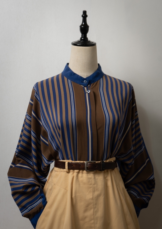 80’s Itary Stripe Pattern Unique Stand Collar Blouse