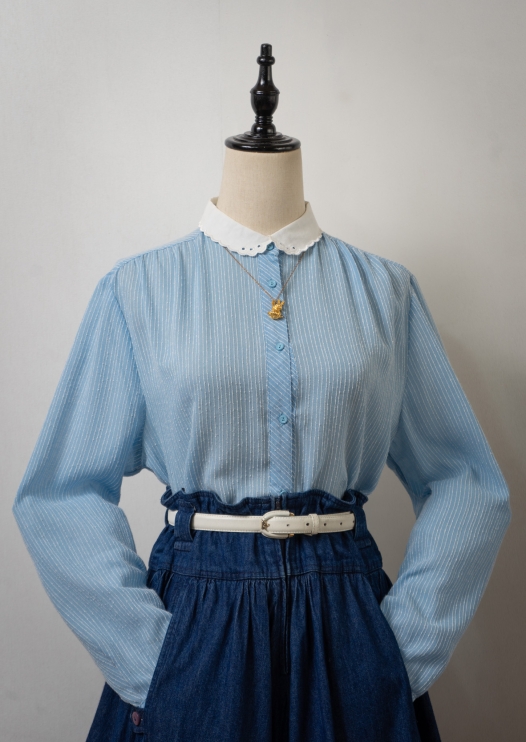 80’s Pin Stripe Pattern Scallop Collar Pale Blue Blouse