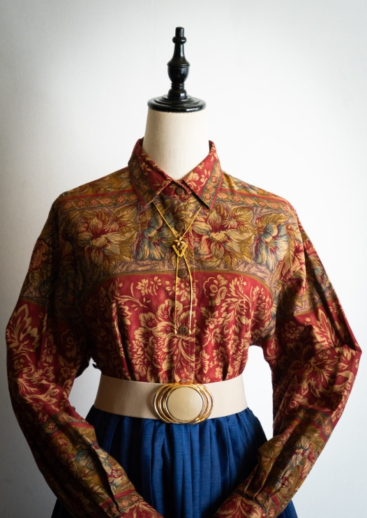 80's Euro Autumn Color Flower Pattern Bow-tie Blouse