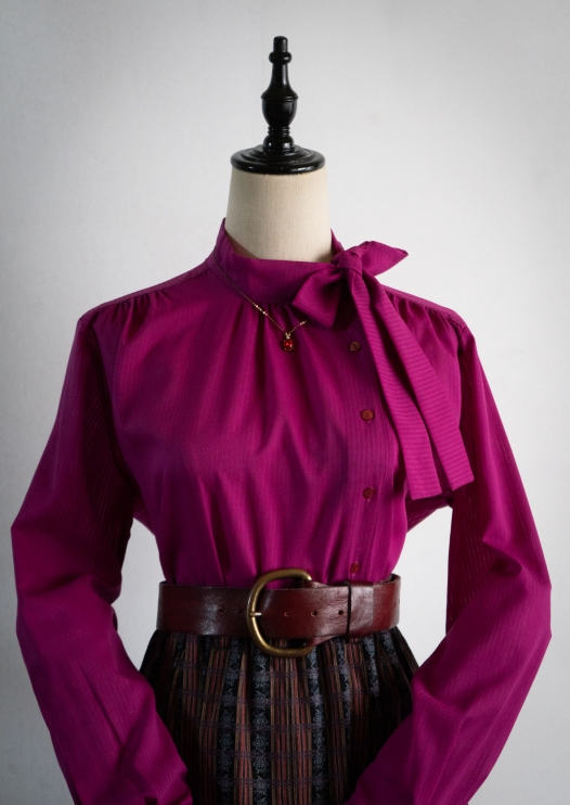 80's Euro Shadow Stripe Pattern Side Bow-tie Purple Blouse