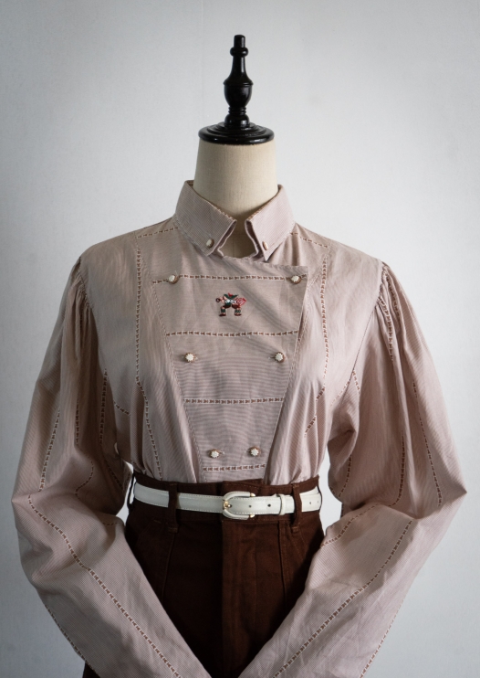 80's Euro Point White Piping & Embroidery Brown Blouse