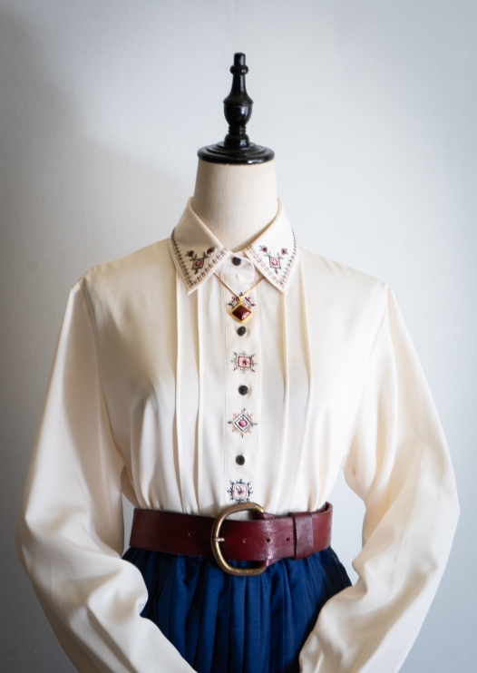 90's Flower Motif Embroidery Pin tuck Design White Blouse