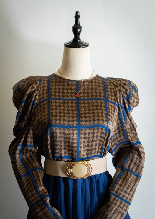 80's France Brown × Blue Houndstooth Pattern Puff Sleeve Blouse
