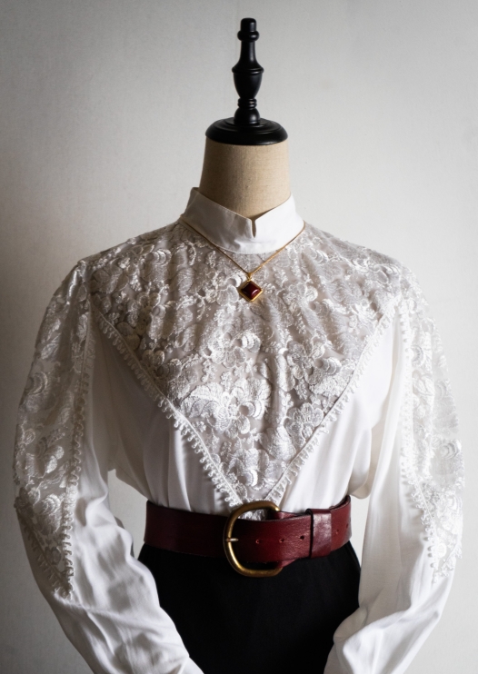 70's Flower Lace × Pin tuck Design Ivory Blouse