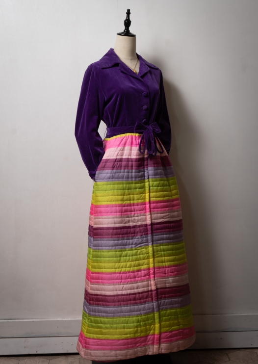 70's USA SAKS FIFTH AVENUE Velvet×Multi Color Quilting Skirt Dress