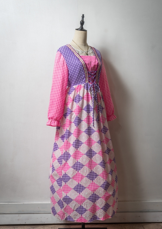60~70's Lace up Design Pink × Purple Gingham Check Pattern Dress