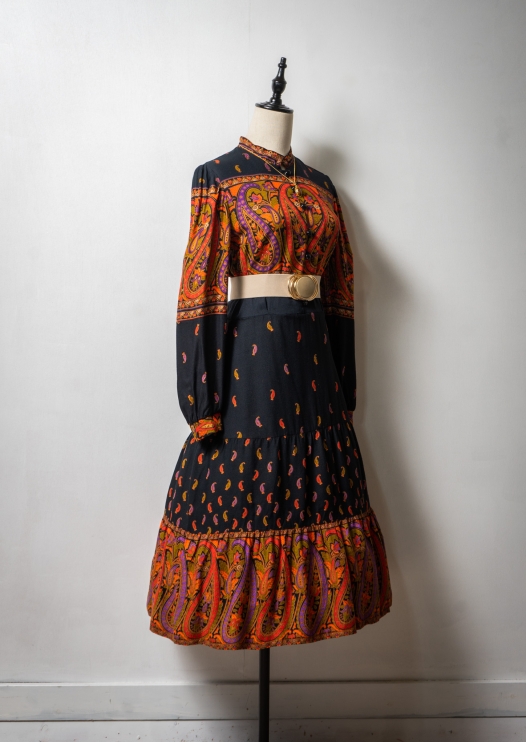 80's Orange × Purple Paisley Pattern Black Dress