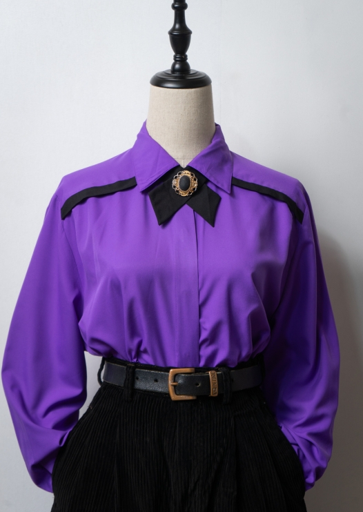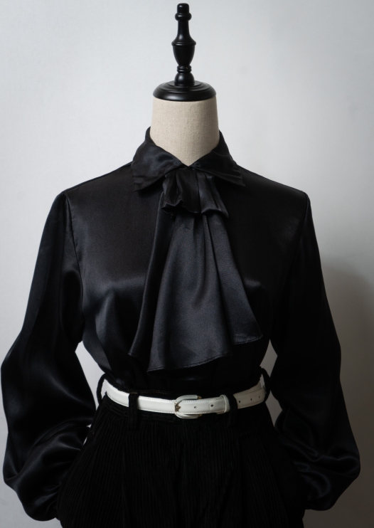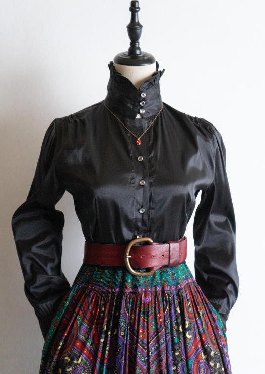 90's Bijou Button Stand Collar Glossy Black Blouse