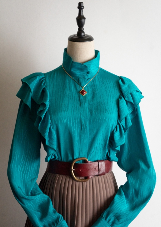 80's Shoulder Frill Design Tree Ring Like Pattern Glossy Green Blouse