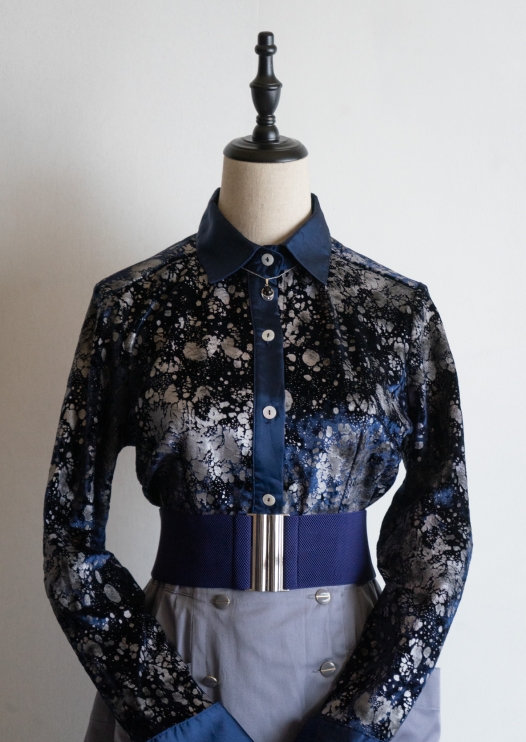 90's Canada Silver Art Pattern Navy Velour Blouse