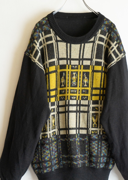 80's Red × Green Botanical Lame Mix Pattern Black Sweater