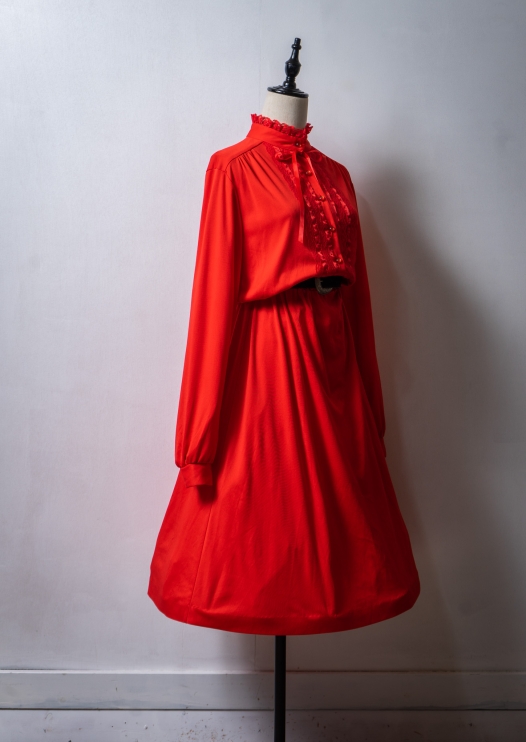 70's USA JC Penney Ribbon × Frill Design Red Dress