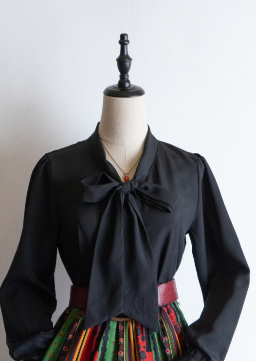 80~90’s Black Ribbon × Tuck Design White Blouse