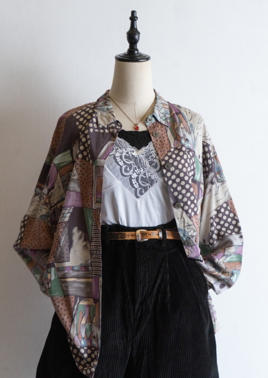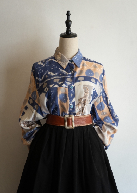 90's Smoky Blue × Beige Unique Art Pattern Over Blouse