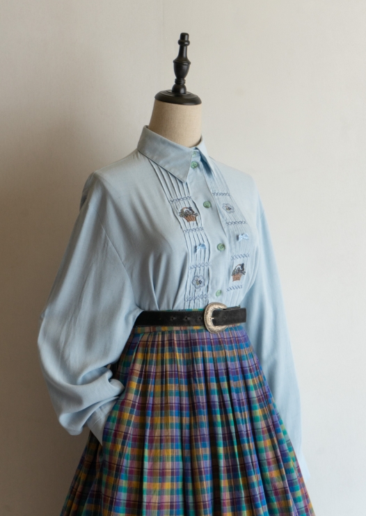 90's Flower Basket Embroidery × Ribbon Tuck Design Ice Blue Tyrol Blouse